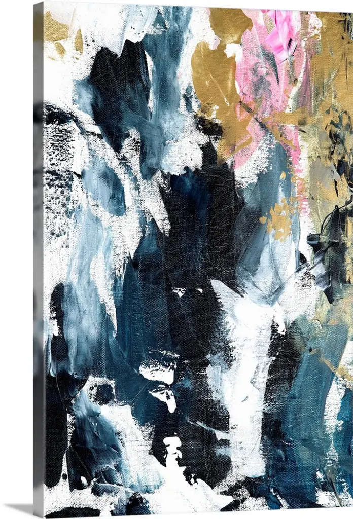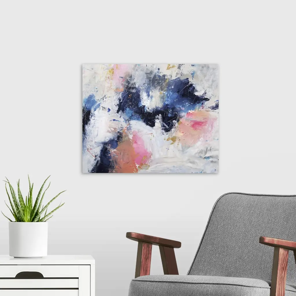 Abstract painting with coll bursts of blue surrounded by warm bursts of pink on a gray toned background with small colorful markings and blotches of gold all over.