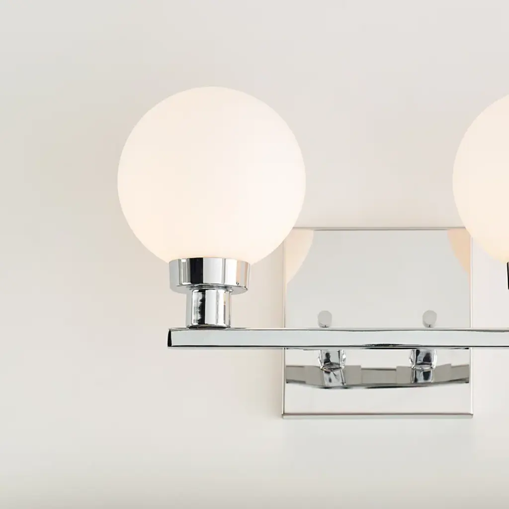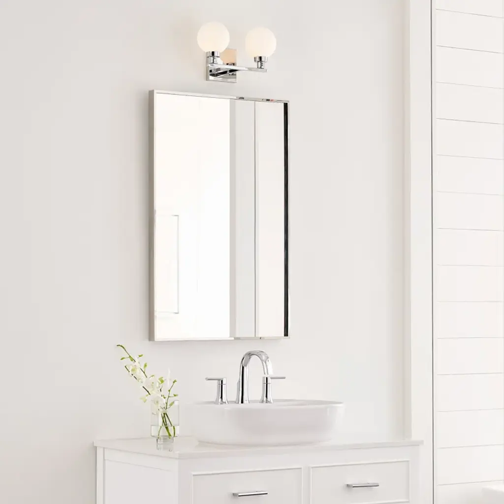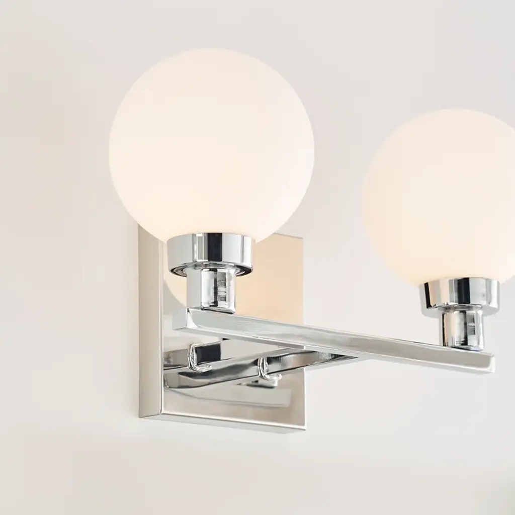 The Heathwood two-light vanity fixture in Chrome is an industrial yet minimalist design, making this fixture perfect for an eclectic living room or over a modern dining room table. white Glass gives the Heathwood series a more current look.