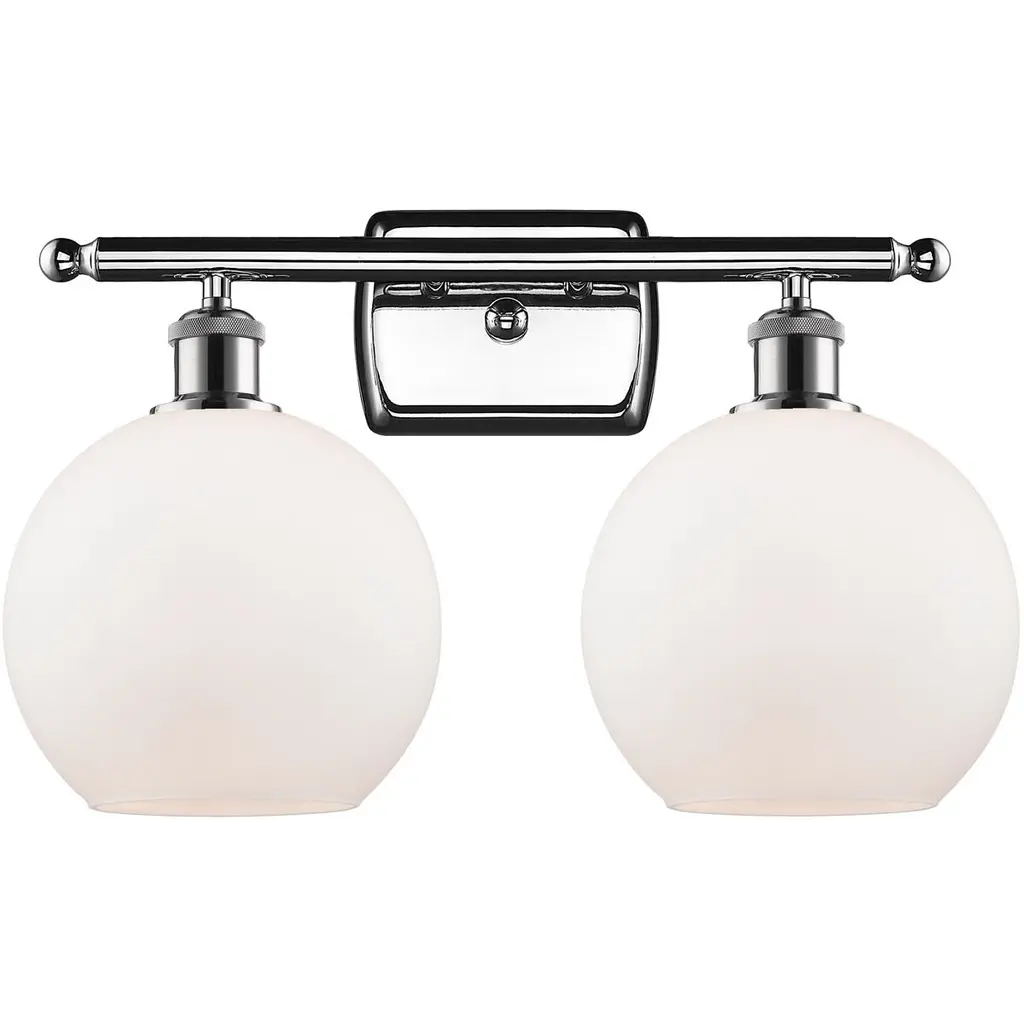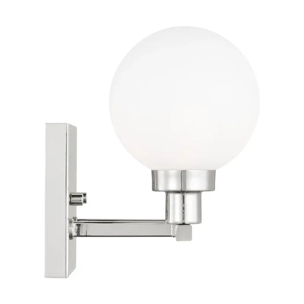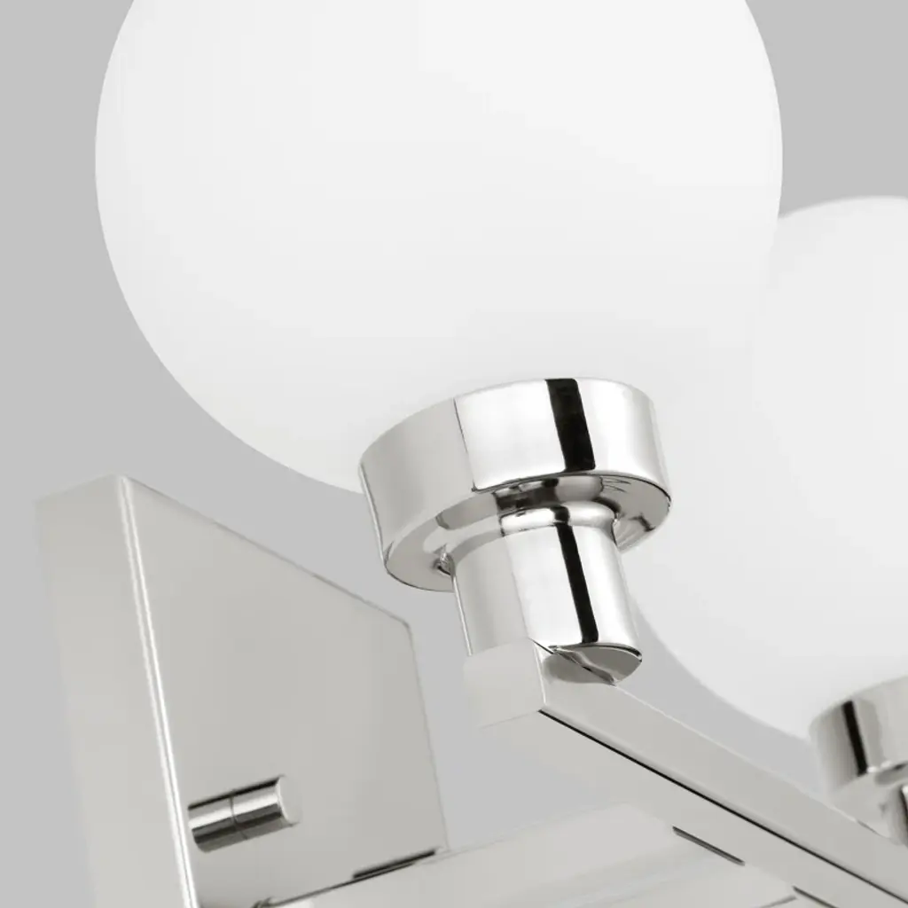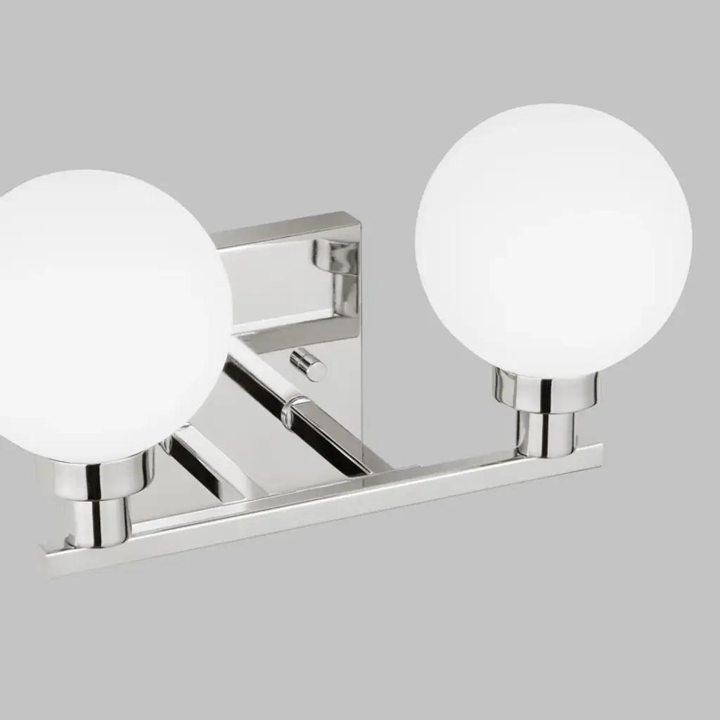 The Heathwood two-light vanity fixture in Chrome is an industrial yet minimalist design, making this fixture perfect for an eclectic living room or over a modern dining room table. white Glass gives the Heathwood series a more current look.