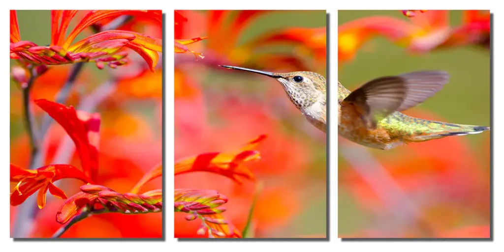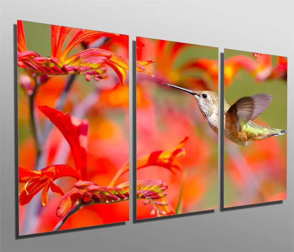 36"œ x 18"œ total size. Ready To Hang! (3 pieces - 12"œ x 18"œ each). 3 Panel Split (Triptych) Metal Print featuring tiny Rufous Hummingbird feeding on red Crocosmia Flower. Modern metal wall art for home or office wall decor & interior design. Printed on Luxurious, HD aluminum glossy metal panels. Multi panel art.. HD aluminum panels. Metal print wall art. Includes Shadow Wall Mount on the back.• Aluminum Metal Wall Art• Made in USA• Ready to hang - No assembly required• Shadow mount hardware on the back• 0.045"œ thick HD Aluminum Panels• Scratch resistant, glossy finish• Superb color clarity, luxurious prints• Epson printing process• For indoor or moisture rich environment use• Easy to clean. Gently wipe with microfiber cloth.