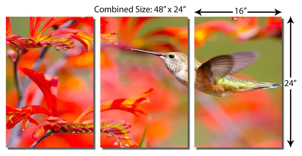 48"œ x 24"œ total size. Ready To Hang! (3 pieces - 16"œ x 24"œ each). 3 Panel Split (Triptych) Metal Print featuring tiny Rufous Hummingbird feeding on red Crocosmia Flower. Modern metal wall art for home or office wall decor & interior design. Printed on Luxurious, HD aluminum glossy metal panels. Multi panel art.. HD aluminum panels. Metal print wall art. Includes Shadow Wall Mount on the back.• Aluminum Metal Wall Art• Made in USA• Ready to hang - No assembly required• Shadow mount hardware on the back• 0.045"œ thick HD Aluminum Panels• Scratch resistant, glossy finish• Superb color clarity, luxurious prints• Epson printing process• For indoor or moisture rich environment use• Easy to clean. Gently wipe with microfiber cloth.