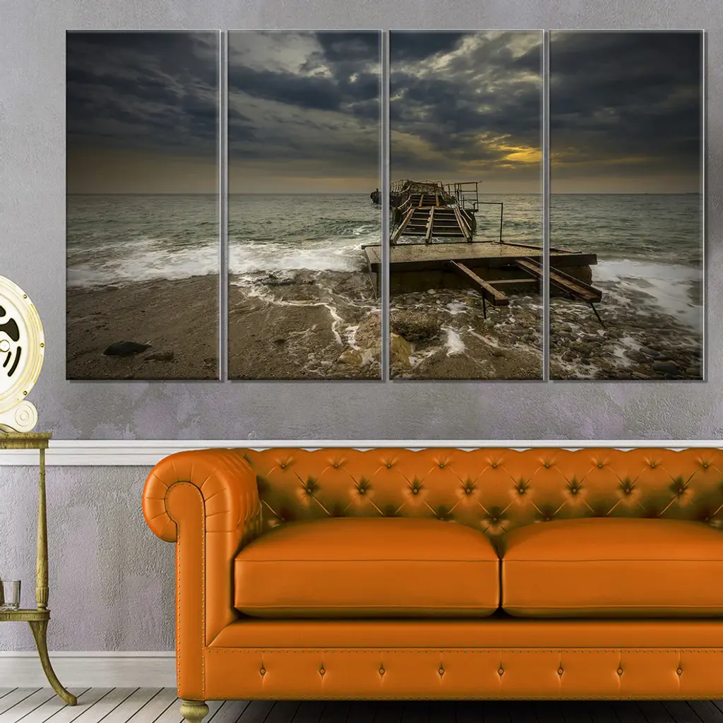 "Ruined Wooden Pier For Boats At Sunset" Sea Bridge Wall Art, 4 Panels, 48"x28"