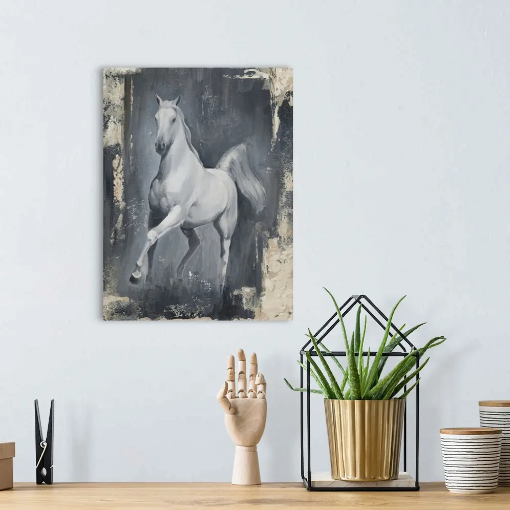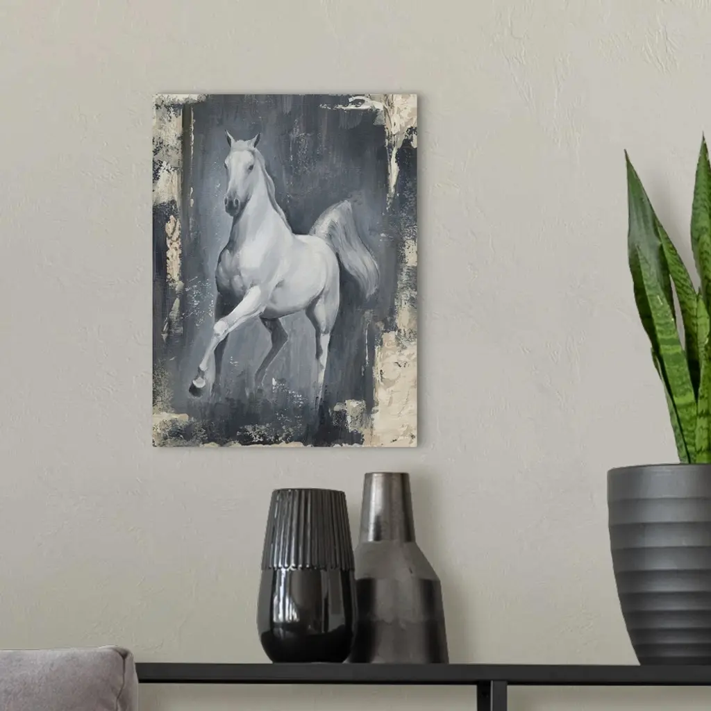 Decorative artwork of a white horse that has a distressed, antique style border around it.