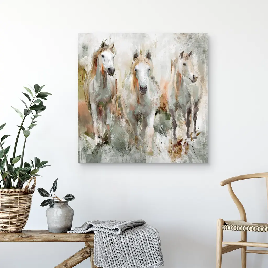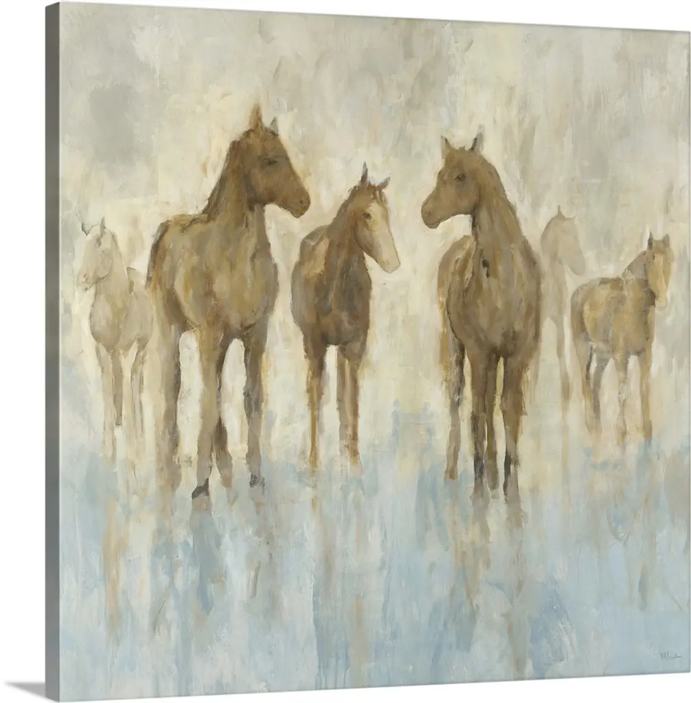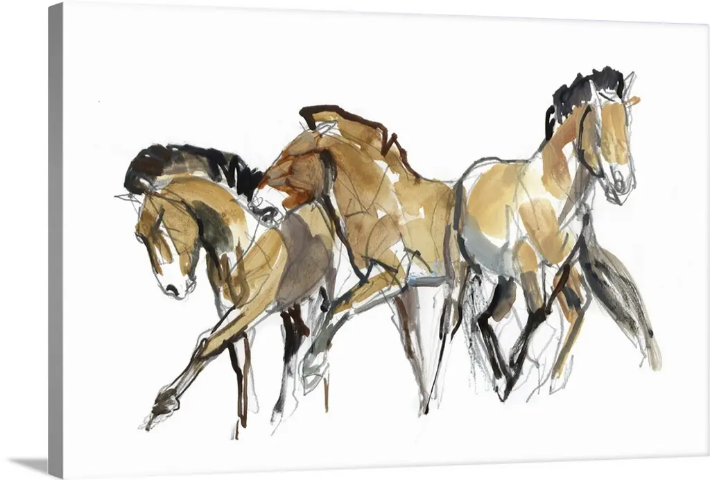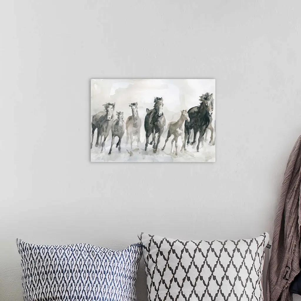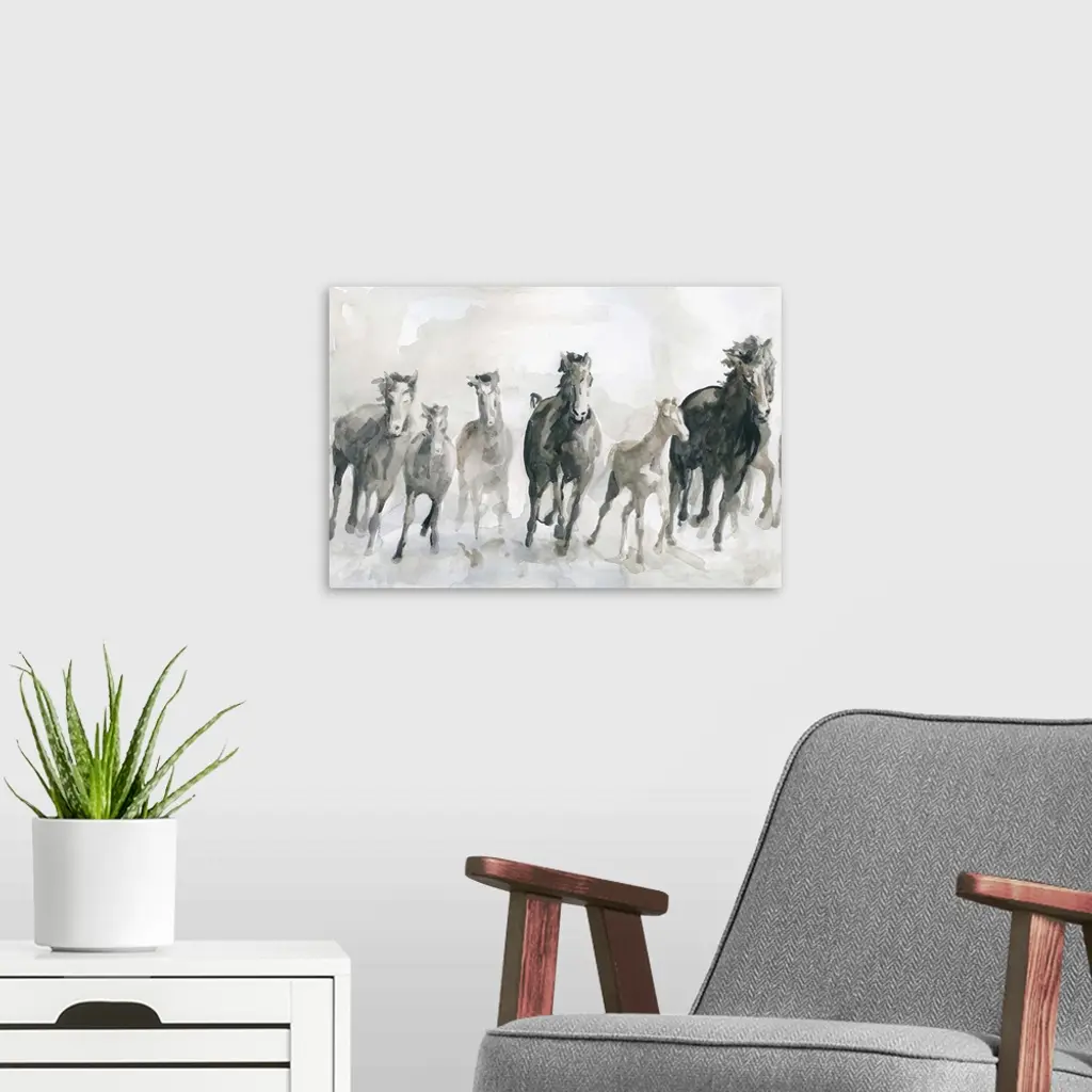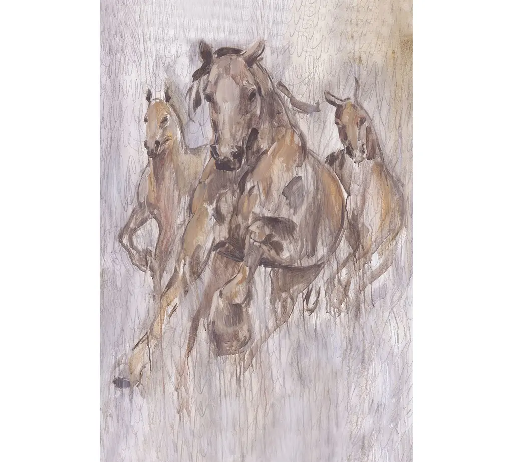 Watercolor painting of a pack of galloping horses in neutral tones with a hint of blue.