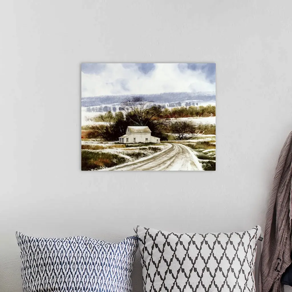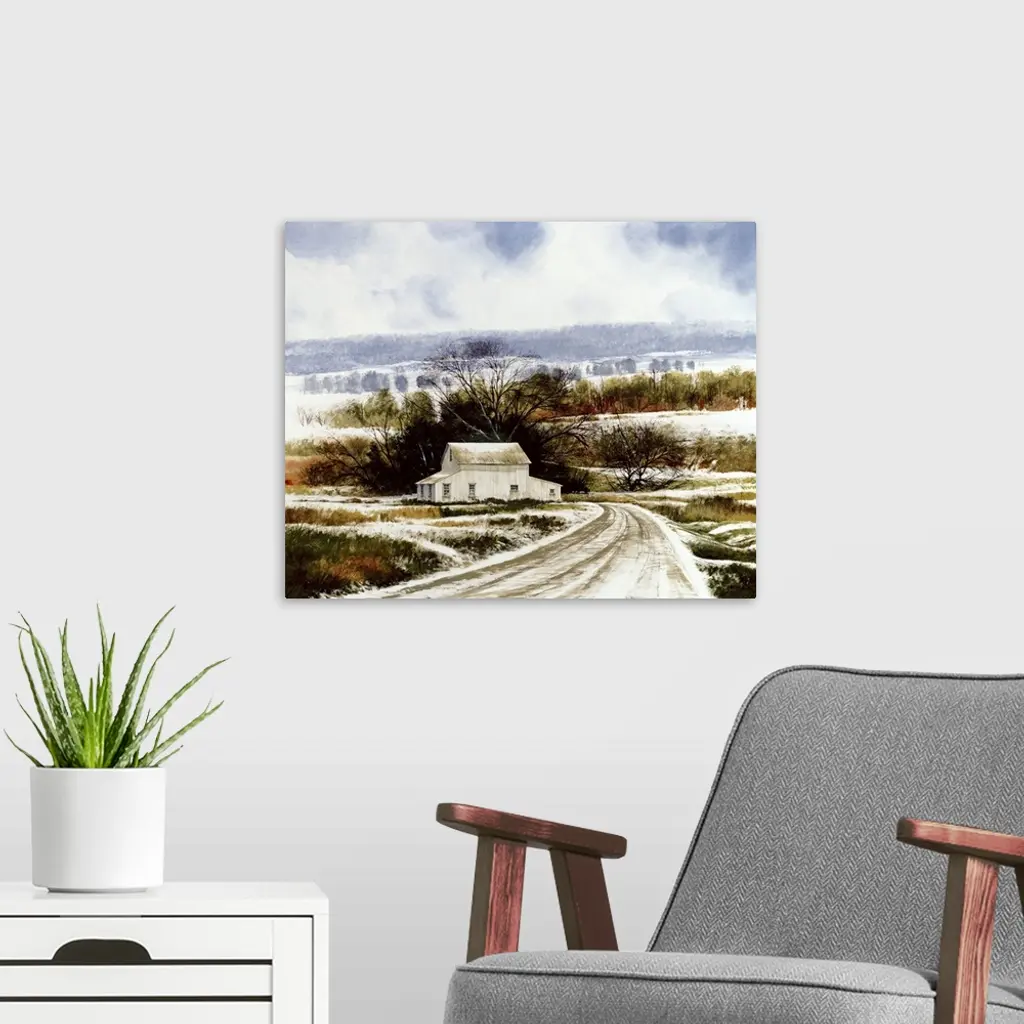 Contemporary painting of a snow covered road leading to a white barn on the countryside.