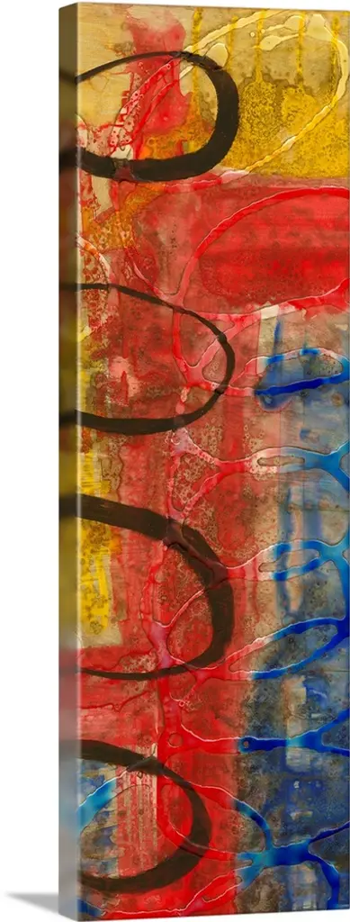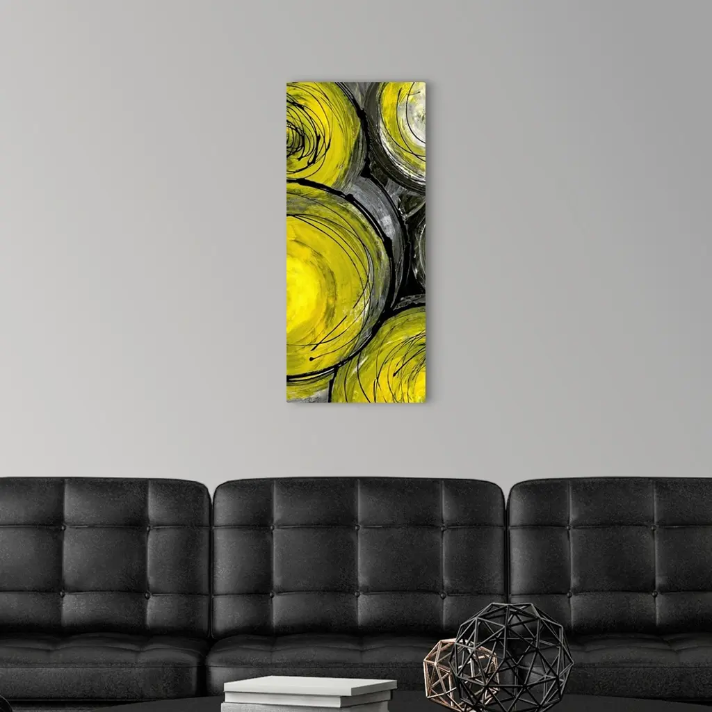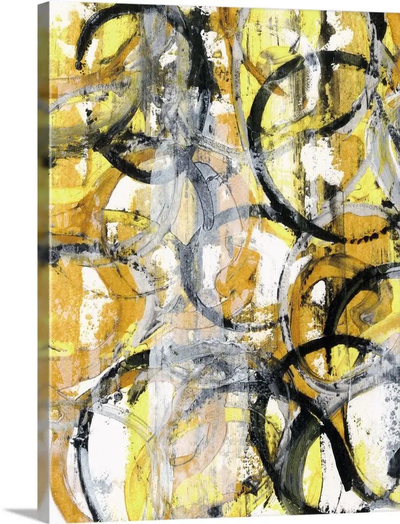 Portrait painting on a large canvas of a grouping of yellow circles with circular scribbles throughout and around them, textured with rough brushstrokes.
