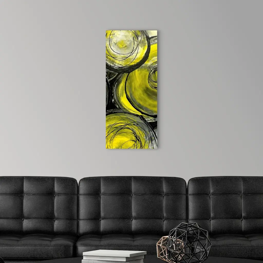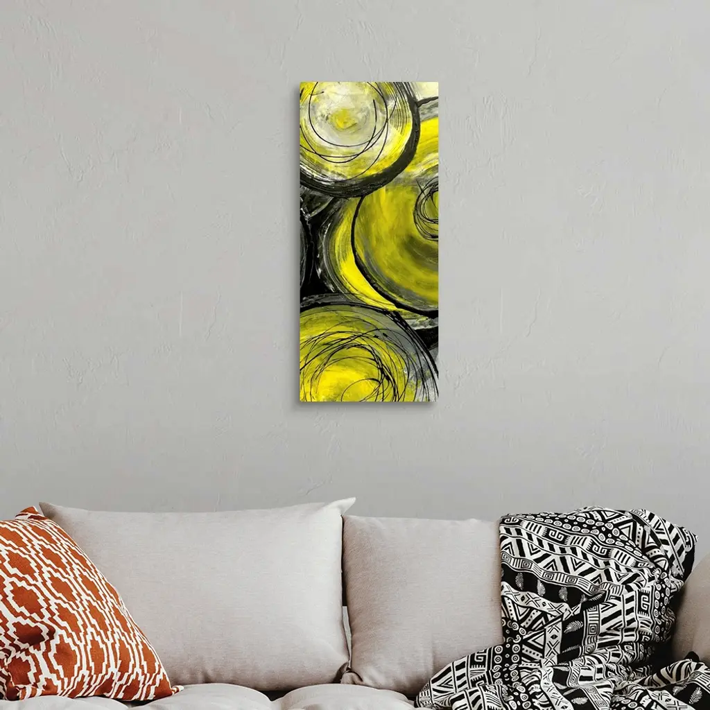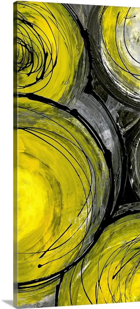 Giant, vertical contemporary painting of overlapping, golden circles painted with a mixture of gray shadowing and thin, dark scribbles in circular patterns.