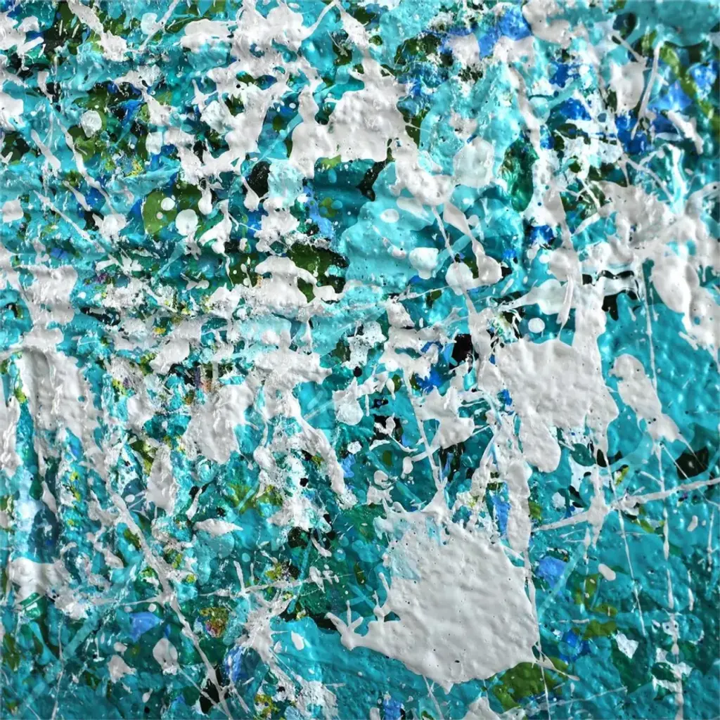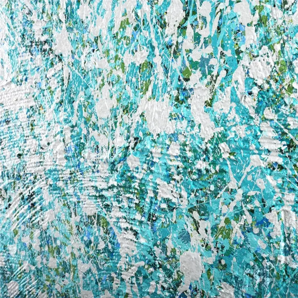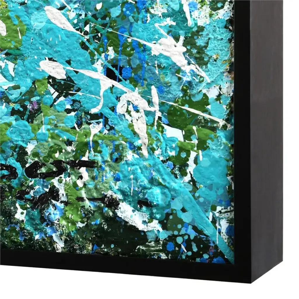 Rushing Waters is a vibrant oil painting on canvas that contributes aquatic tones and rich texture to an interior space. Vivid tones of teal and green blend together with bright whites to evoke the powerful motions of a rushing current. This gorgeous work of art is held within a black gallery frame.