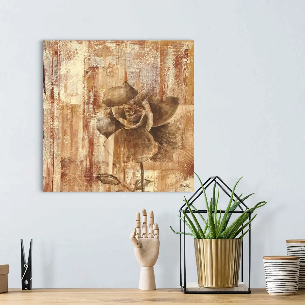 A contemporary painting of a bronze rose against a weathered bronze background.