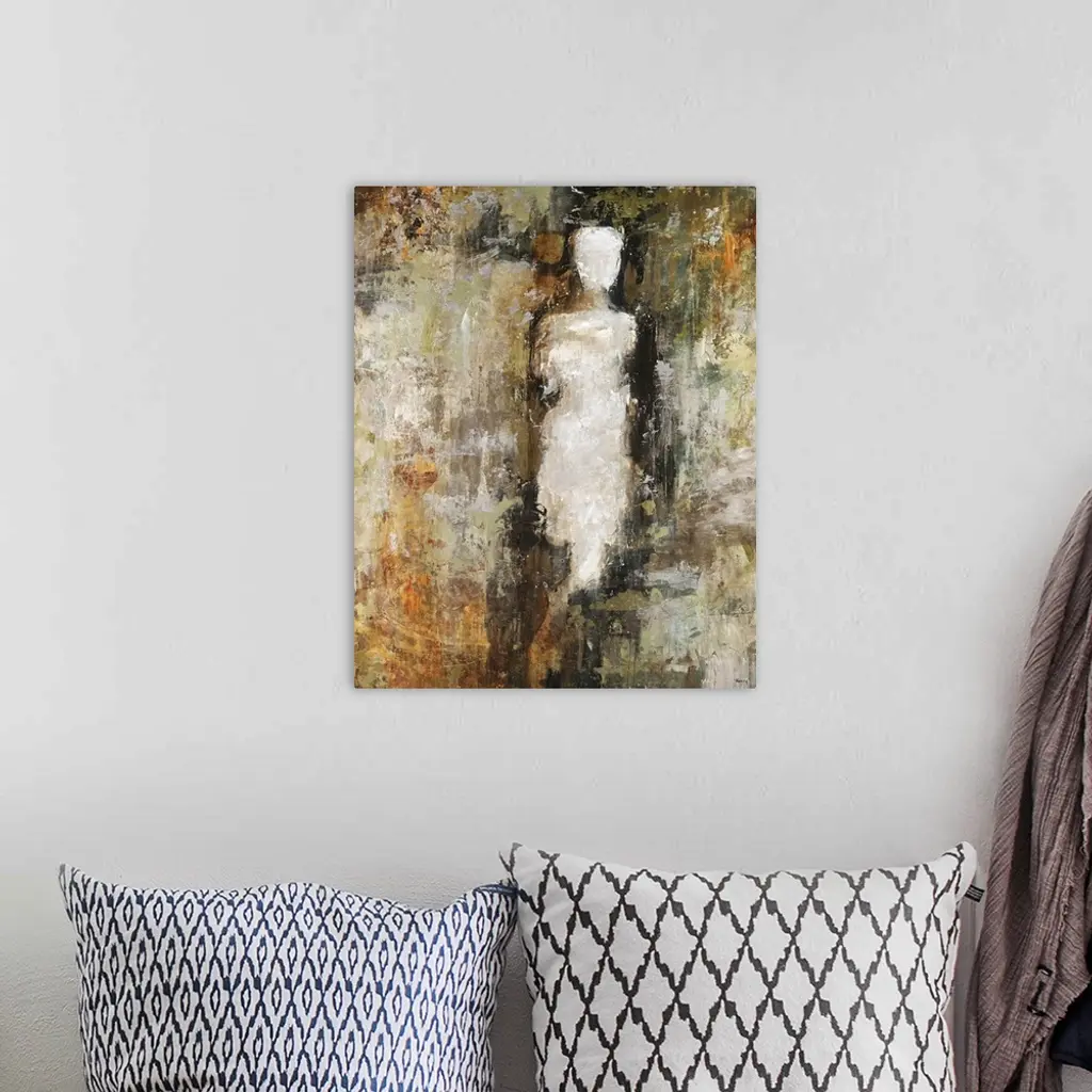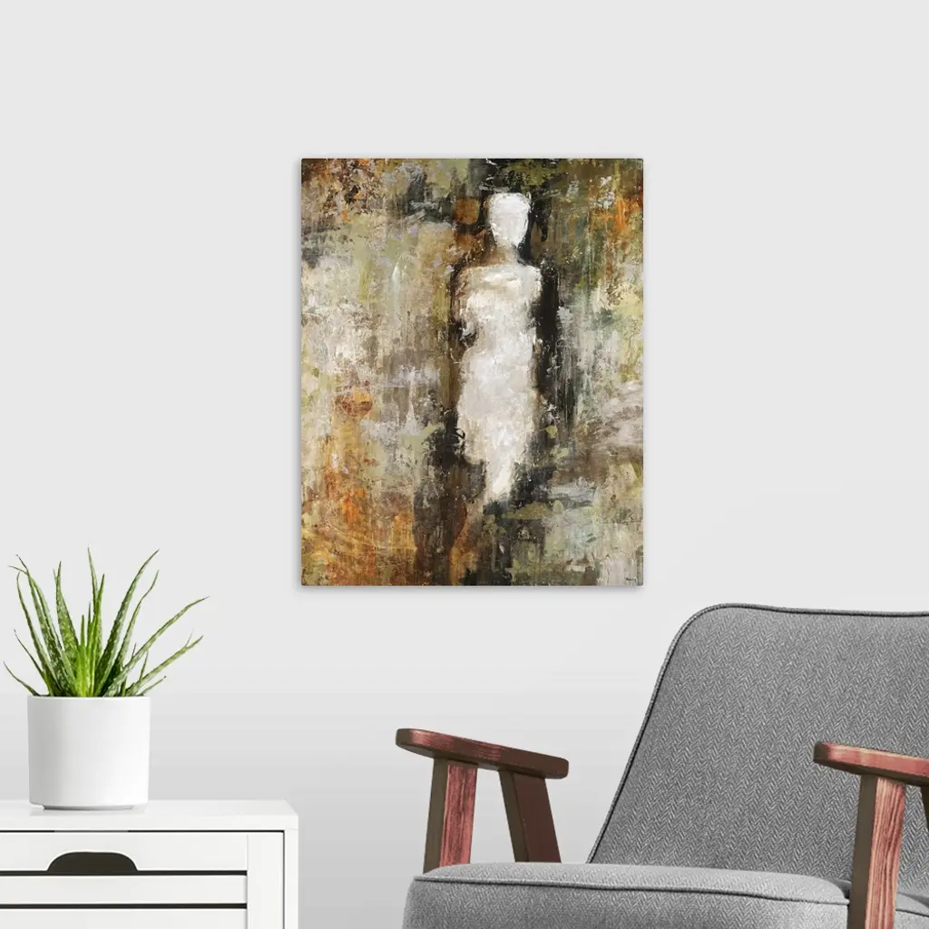 Figurative painting of a vague outline of the human form, its lower half blending into the various earth tones in the roughly painted background.