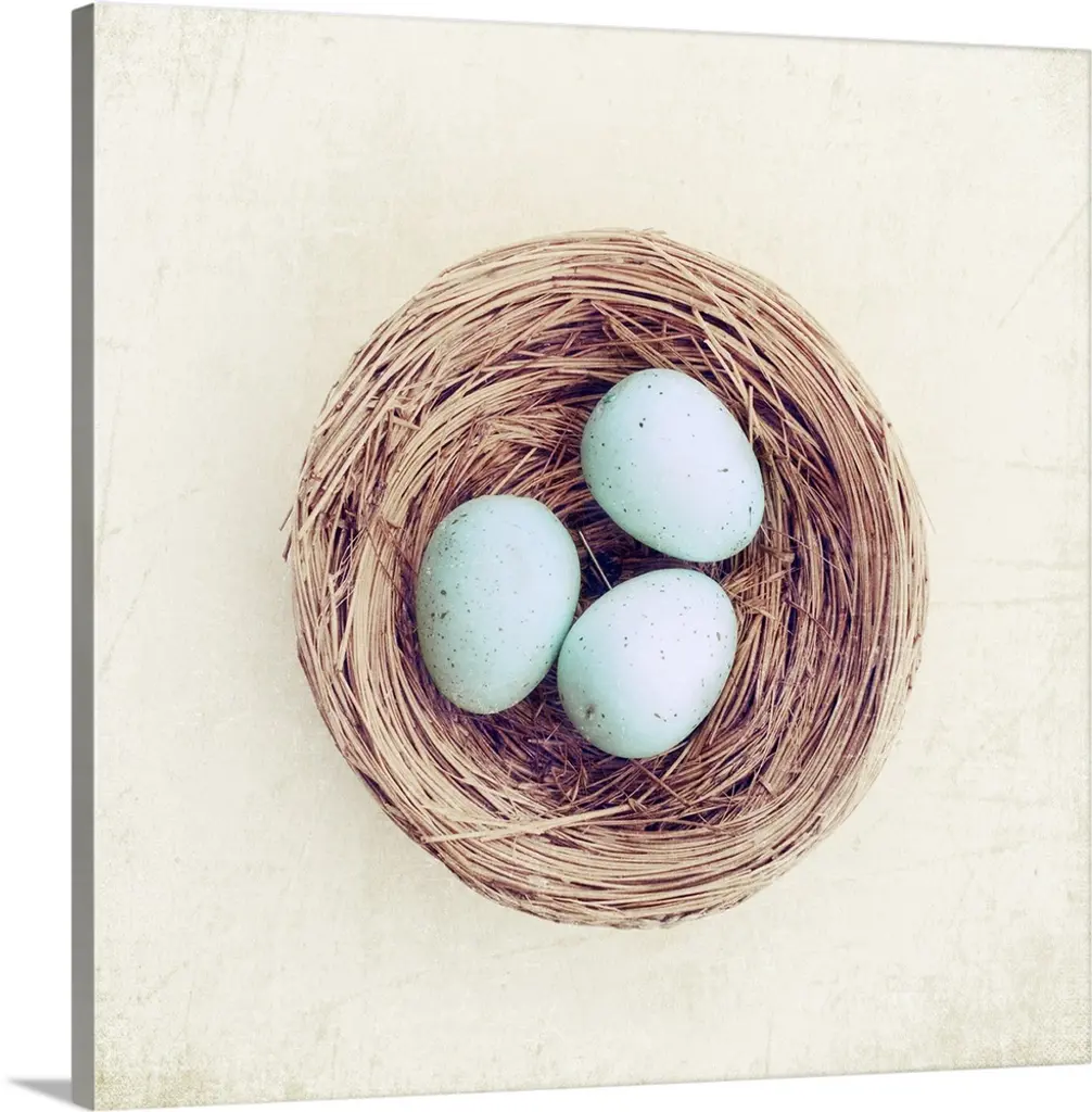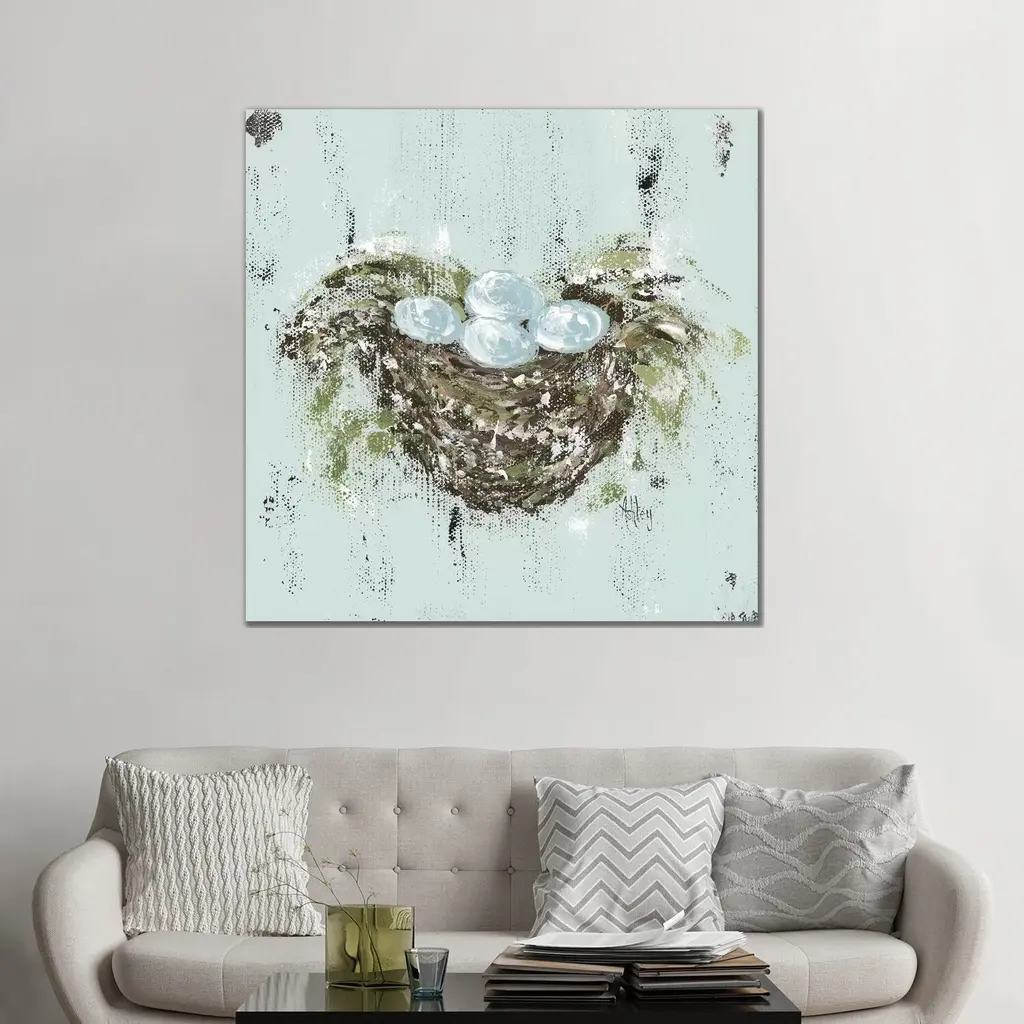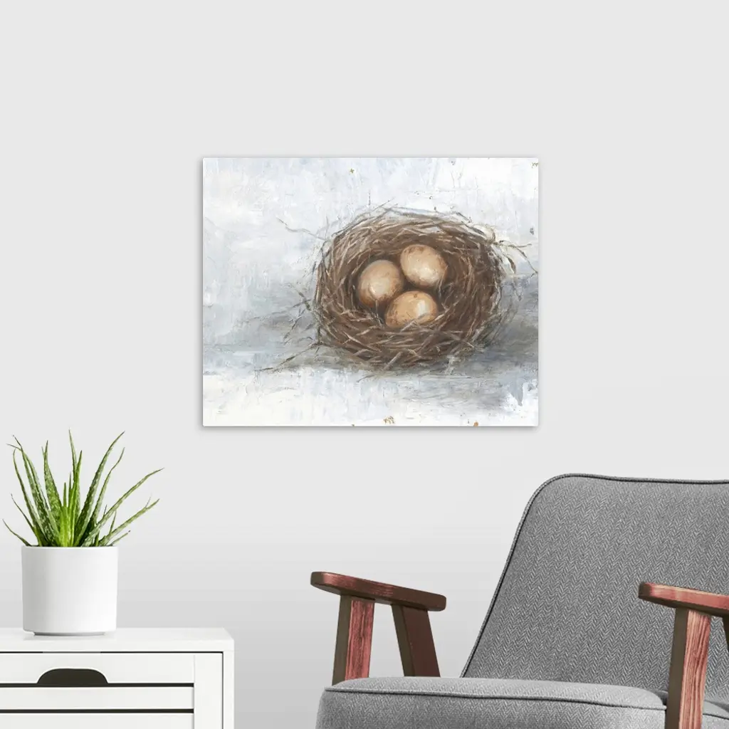 Orange eggs resting in a nest against a distressed light background fills this rustic artwork.