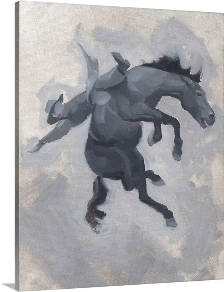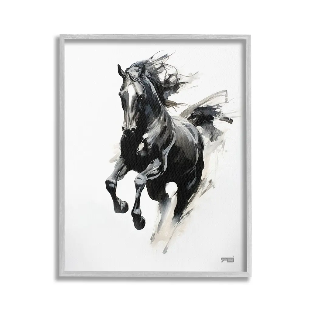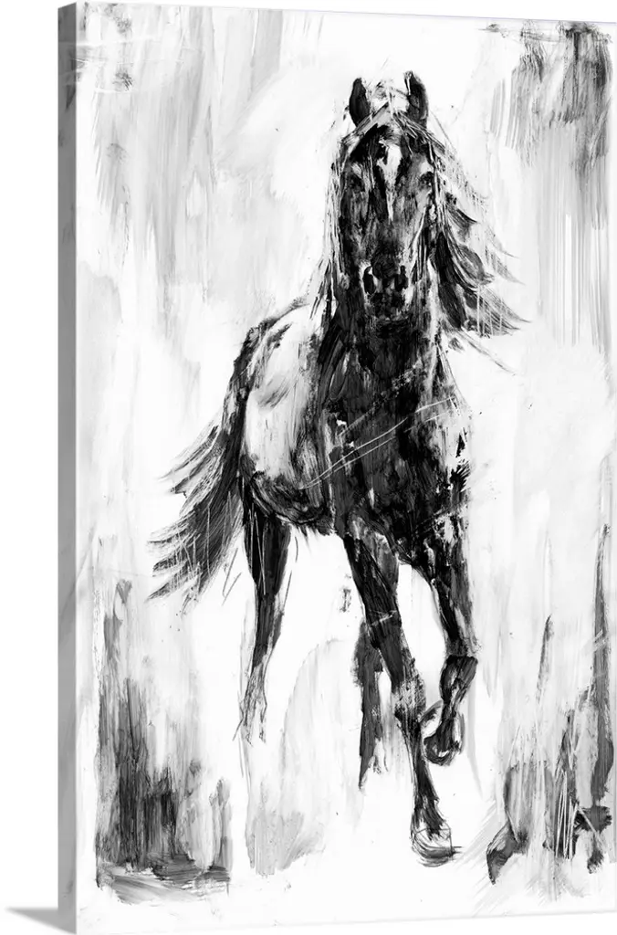 Vertical painting of a running horse done if varies shades of gray and white with a rough brush stroke feel.