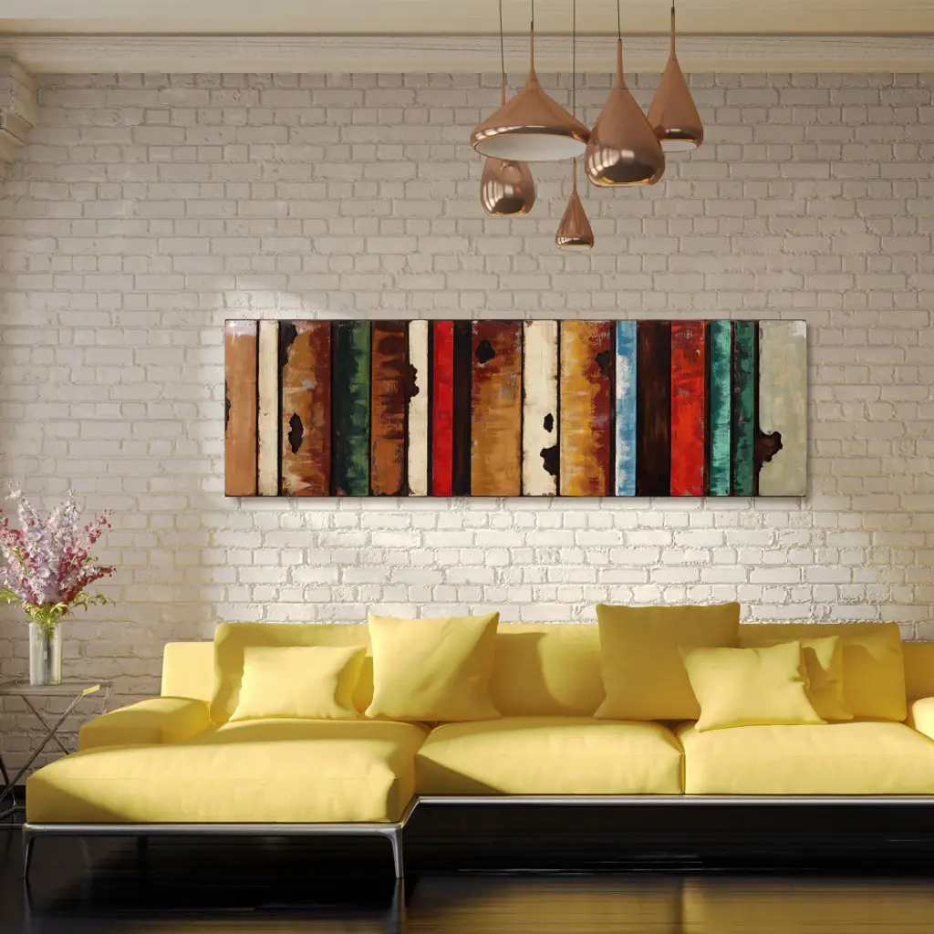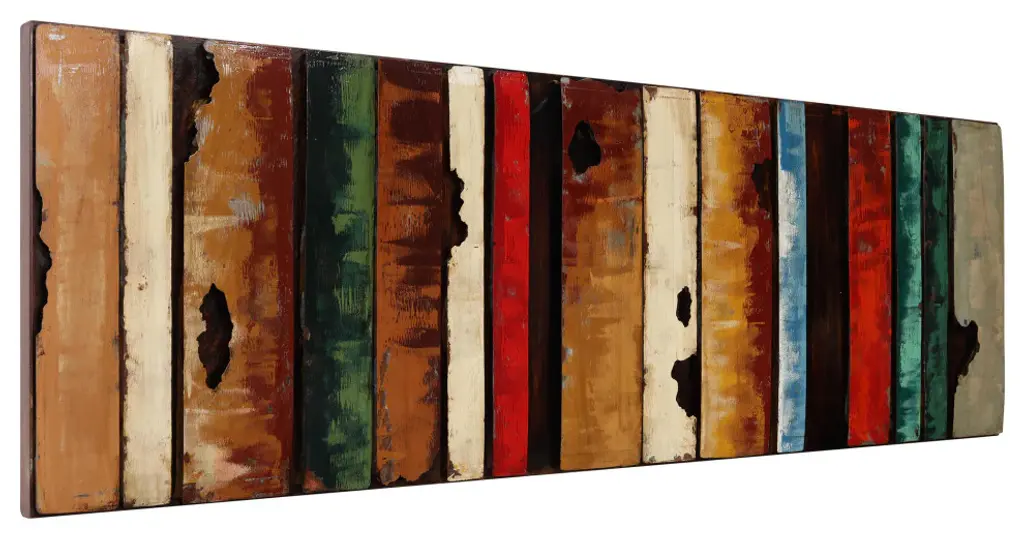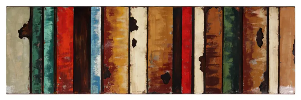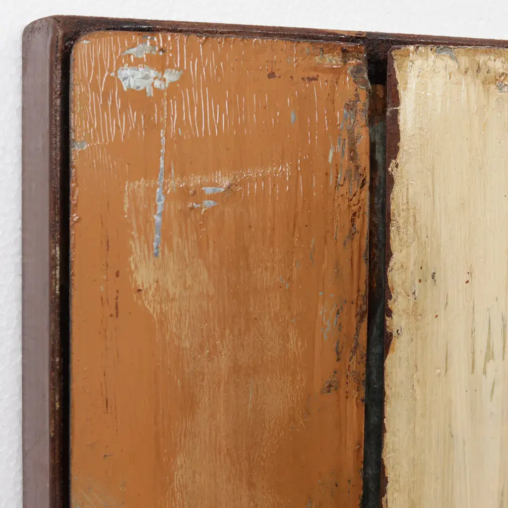 Primo''s skill at creating his three dimensional iron and wood mixed media wall sculpture is displayed beautifully in this rustic flow piece. Intriguing vertical lines call your attention to its worn industrial look. The textures and colors blend well creating a charming old-time feel. You may see in this something that was once strong that is now falling apart. Abstract art in this style can have many interpretations with each viewer bringing something new to the work.
