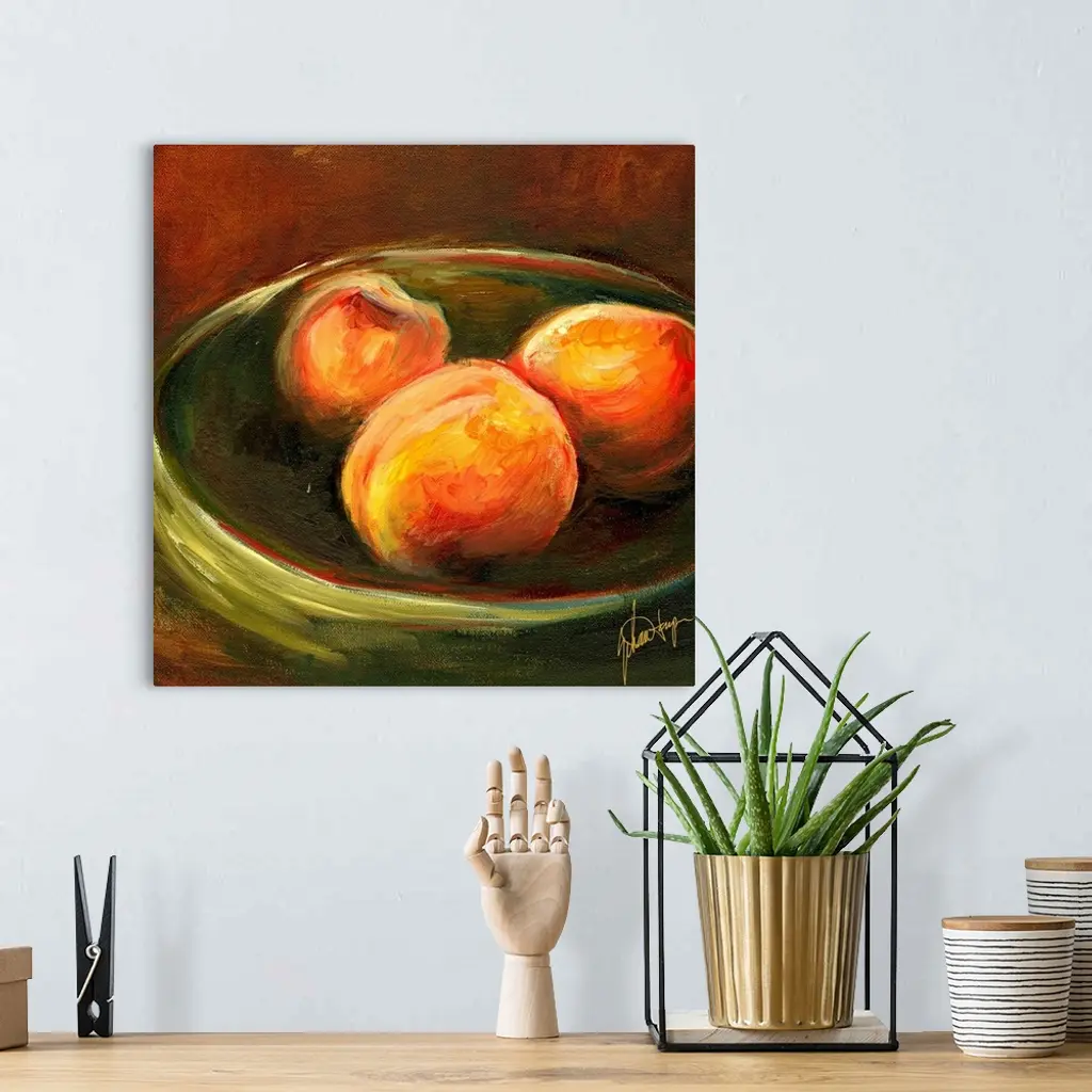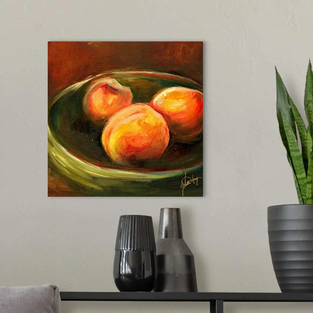 Big, square painting of three ripe peaches in a shallow bowl, on a dark background. Painted with rough brushstrokes and no fine detail.