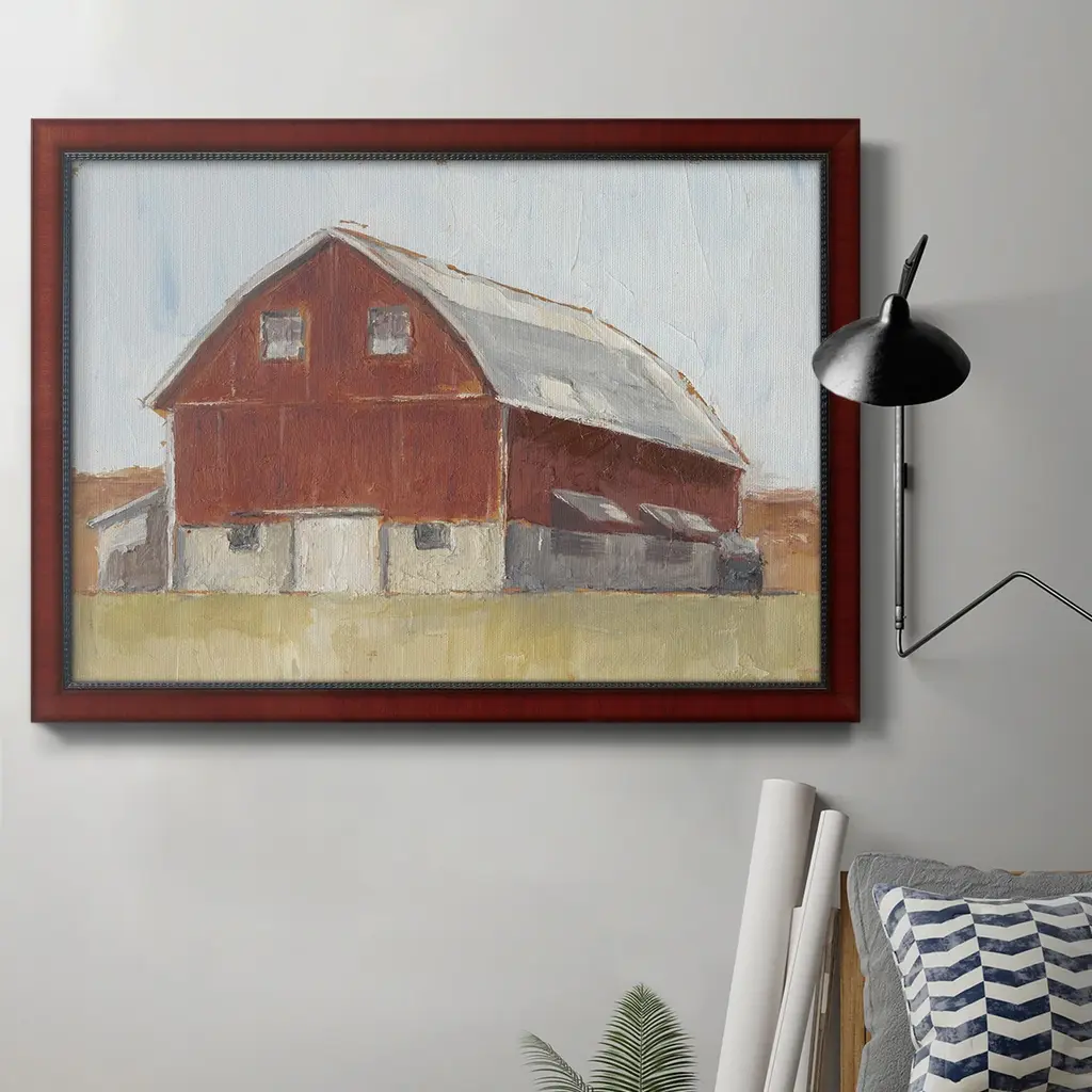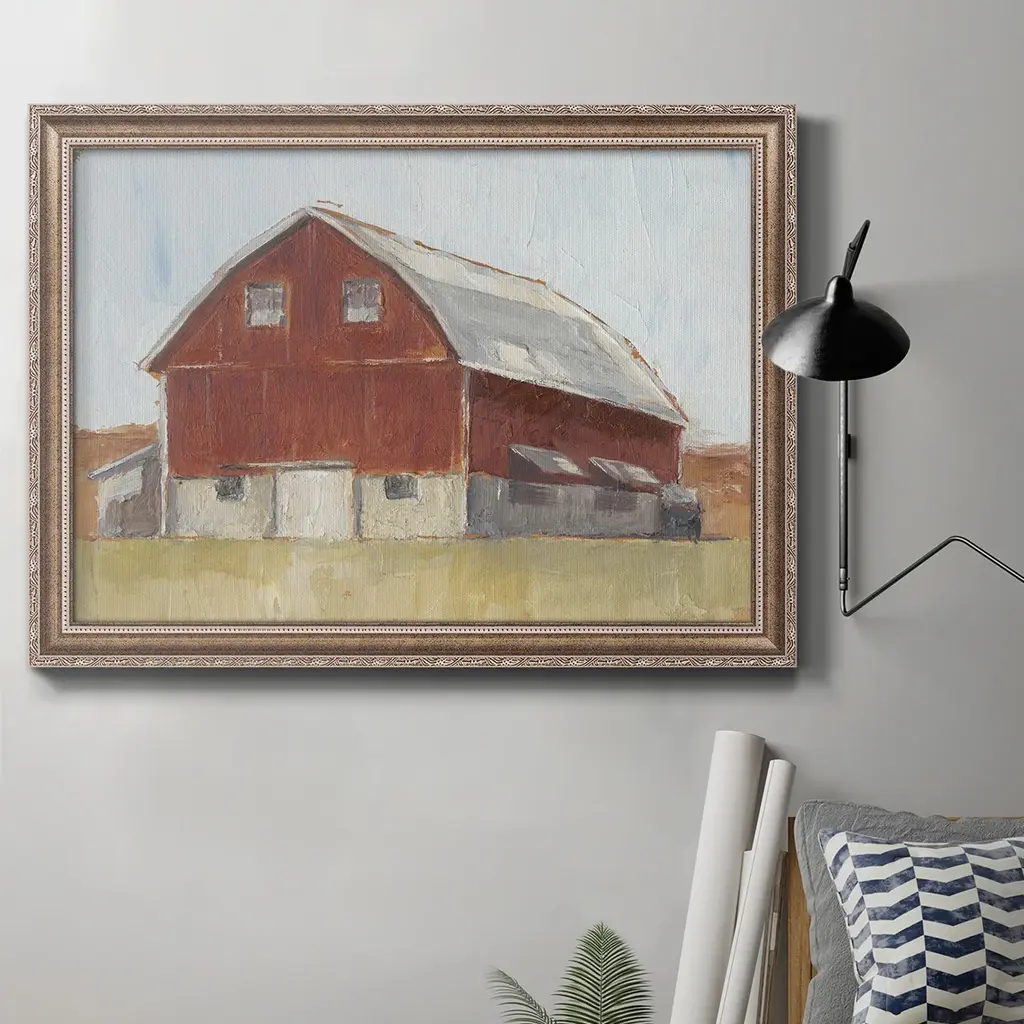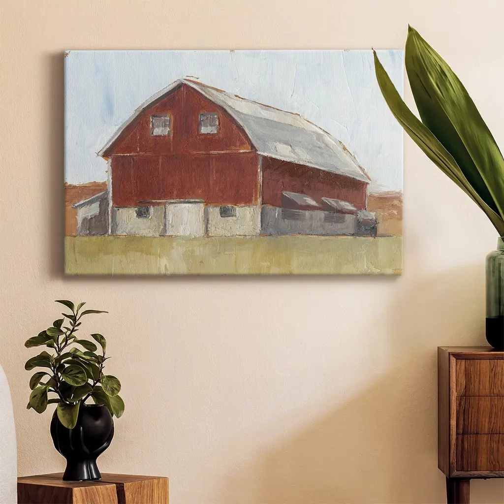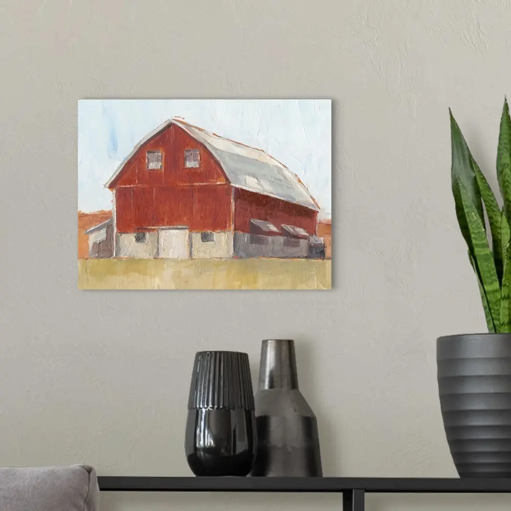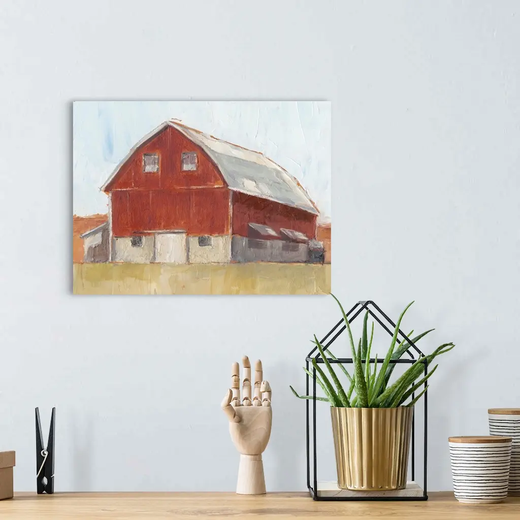 This contemporary painting of a rusty barn on a simple landscape features expressive brush strokes and visible textures.