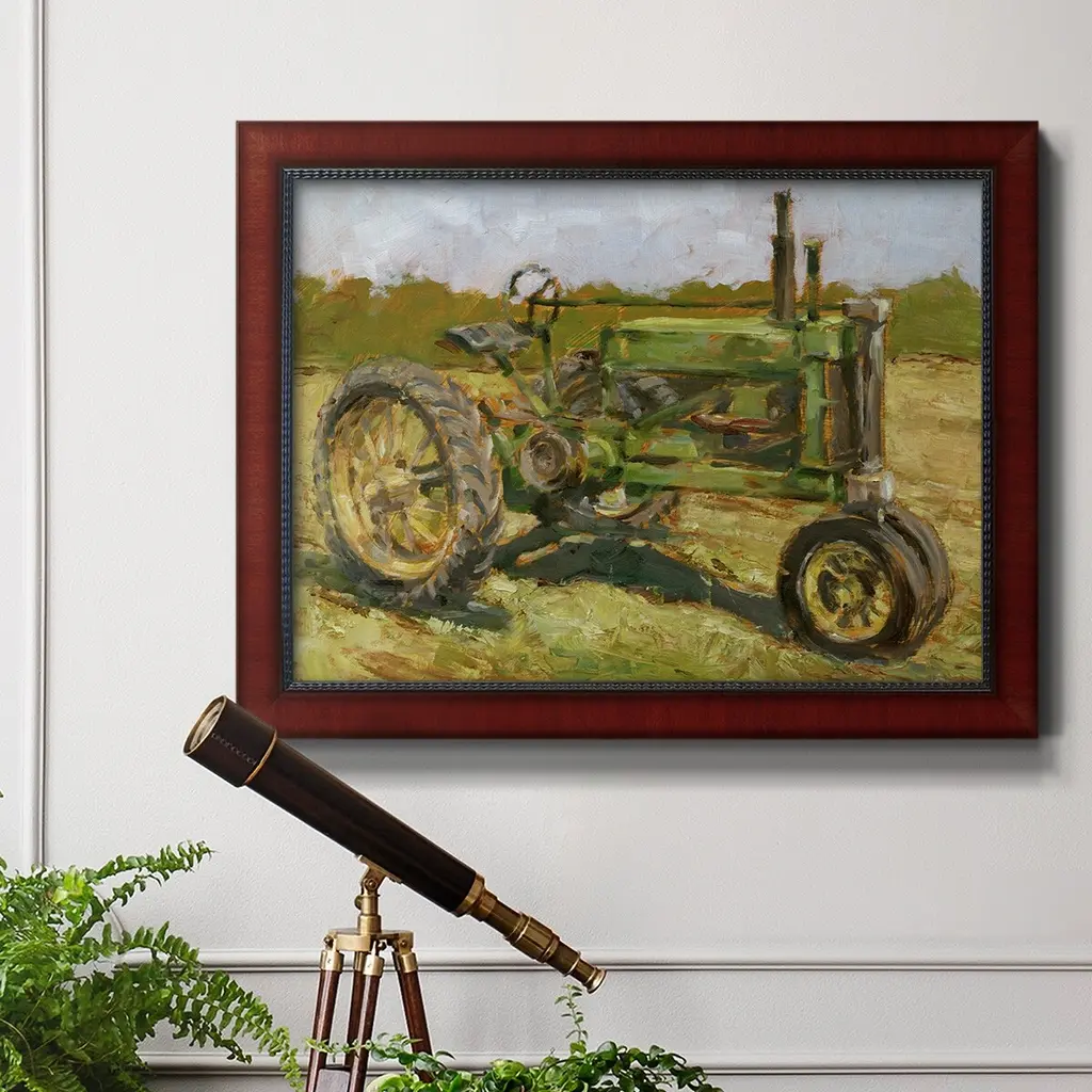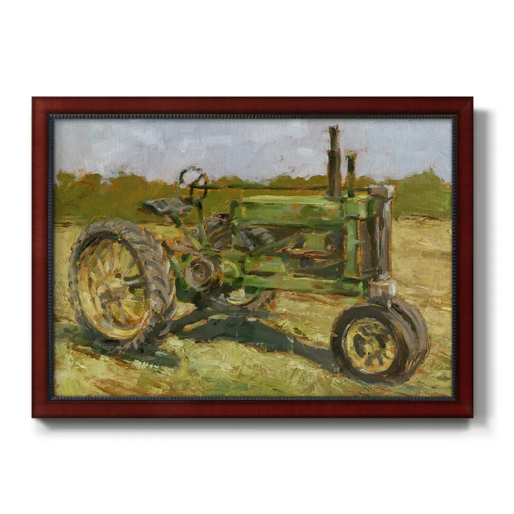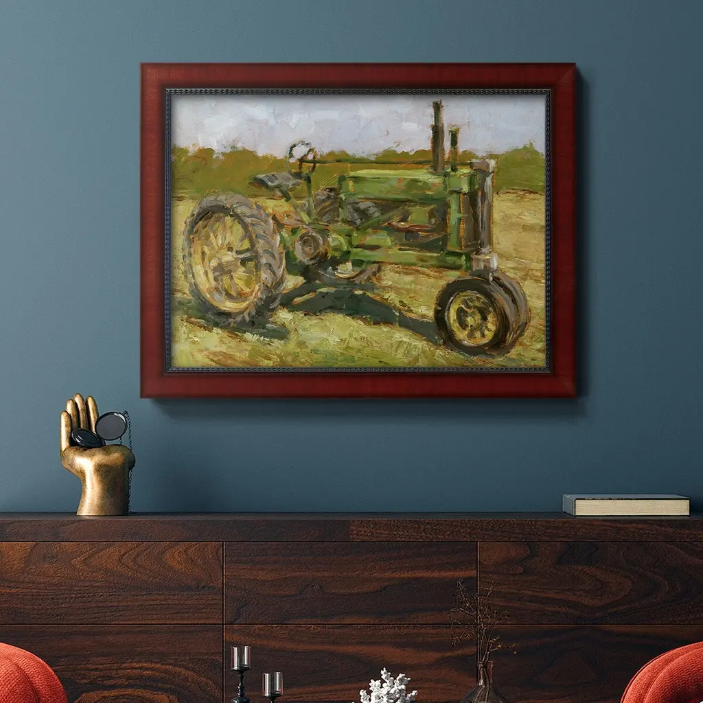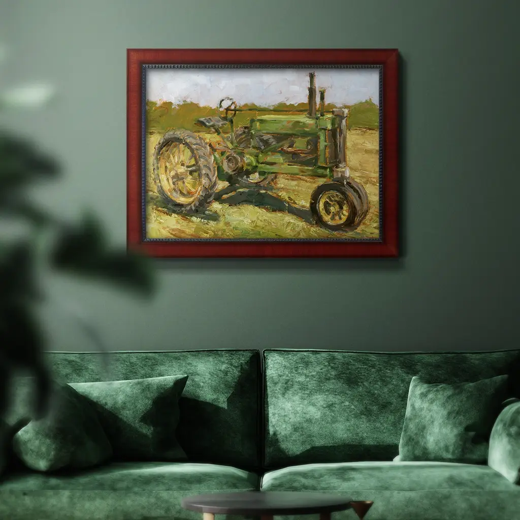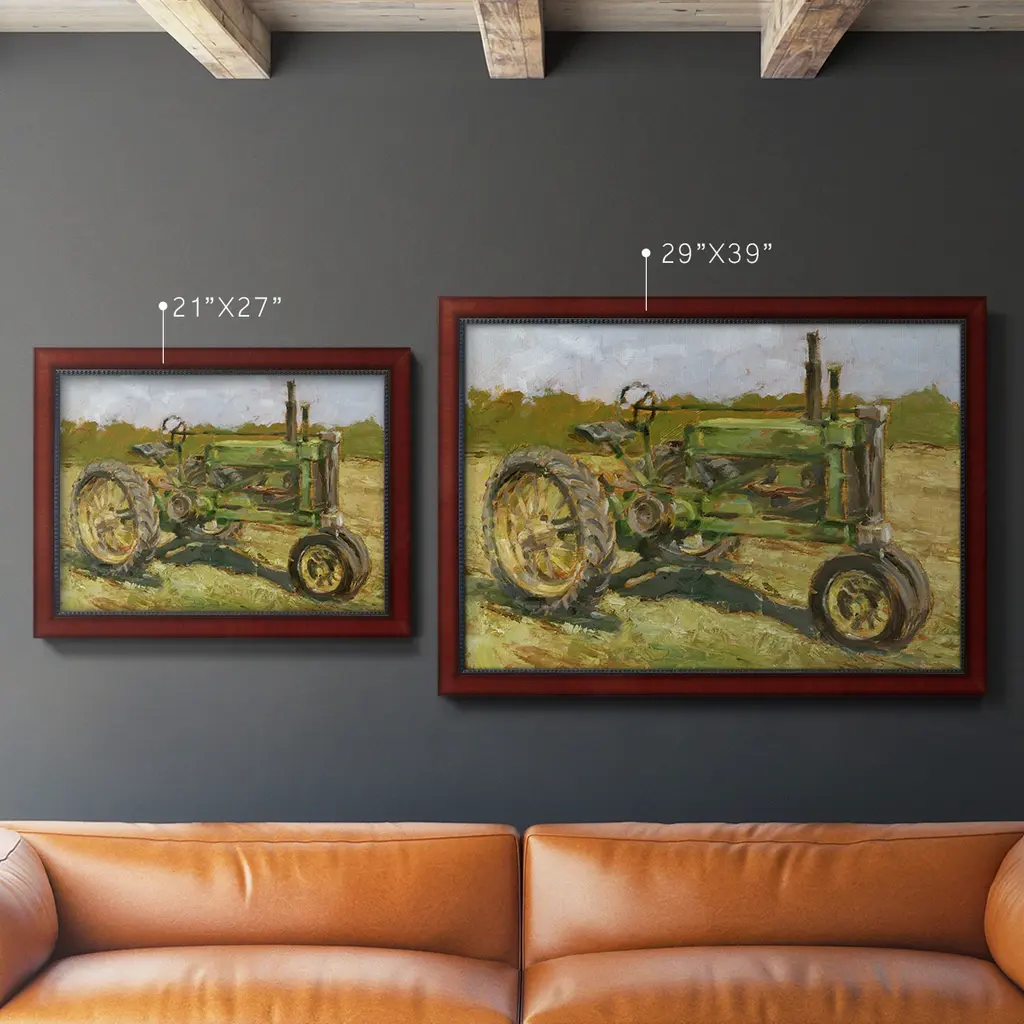 Rustic Tractors I Premium Framed Canvas- Ready to Hang A Premium Framed Canvas created to last. Framed in distressed wood and available in an array of sizes and colors Featuring a beveled a solid wood stretcher bar, each piece comes ready to hand 3 SIZES AVAILABLE 16''X20'' - Overall Size 18'X27'' - Overall Size 24''x36'' - Overall Size Each piece is made to order. Each piece comes with hanging hardware. Made in the USA Ready to Hang Giclee Paper Print Acrylic Glass Beveled Matt Board