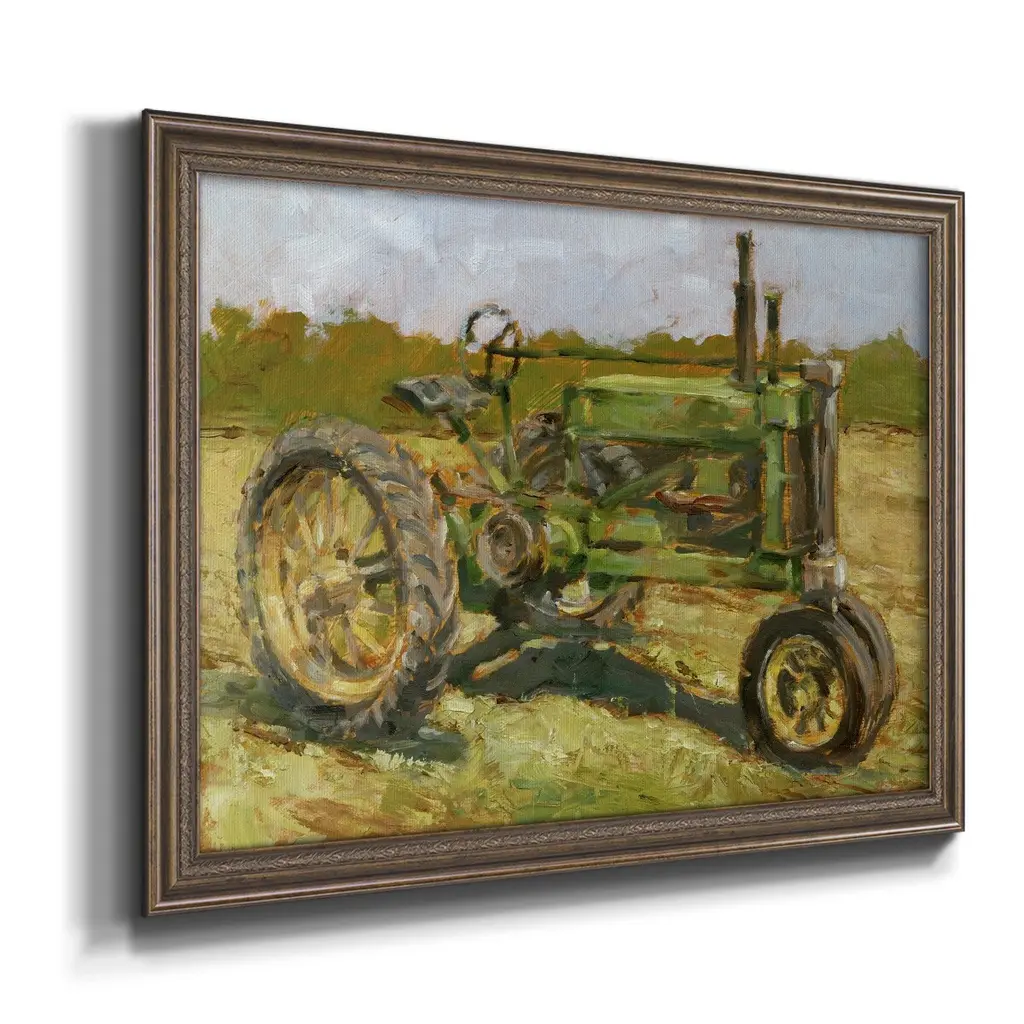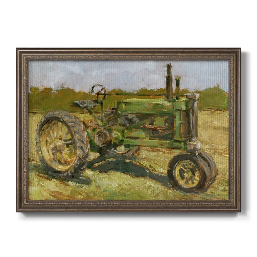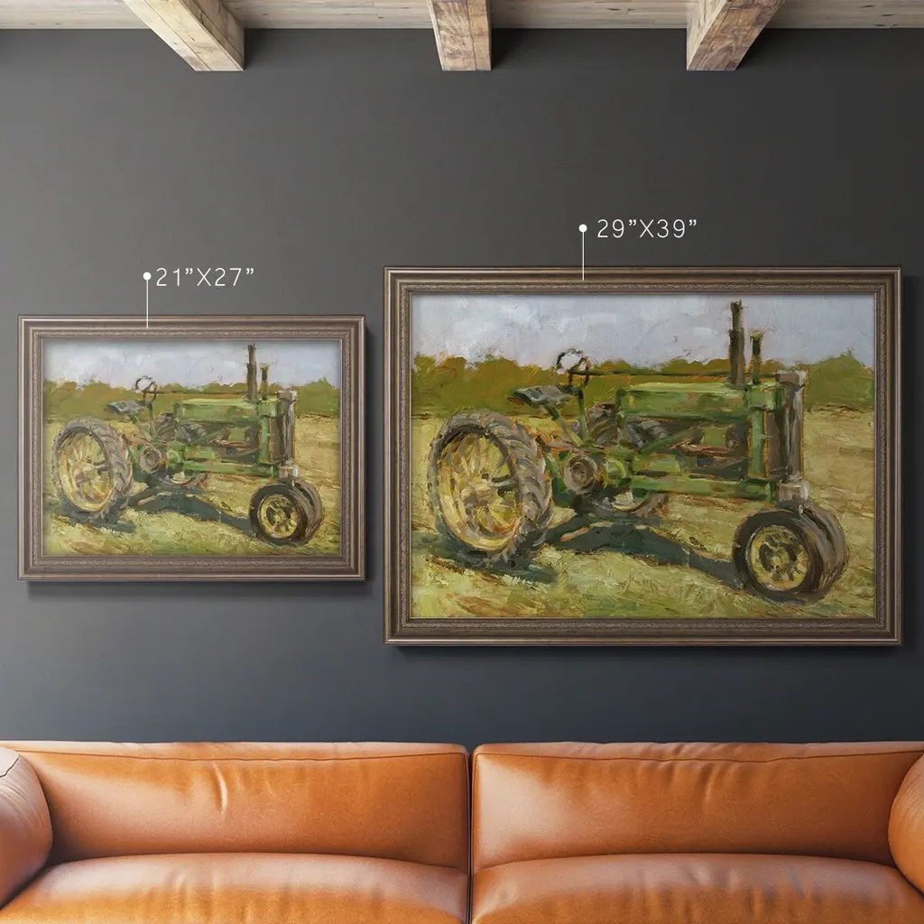 Rustic Tractors I Premium Framed Canvas- Ready to Hang A Premium Framed Canvas created to last. Framed in distressed wood and available in an array of sizes and colors Featuring a beveled a solid wood stretcher bar, each piece comes ready to hand 3 SIZES AVAILABLE 16''X20'' - Overall Size 18'X27'' - Overall Size 24''x36'' - Overall Size Each piece is made to order. Each piece comes with hanging hardware. Made in the USA Ready to Hang Giclee Paper Print Acrylic Glass Beveled Matt Board