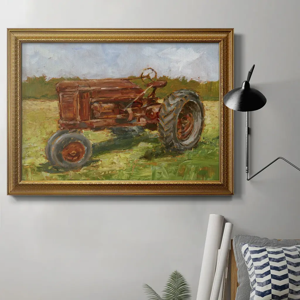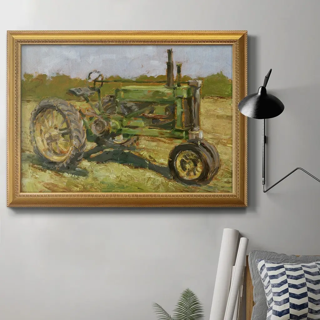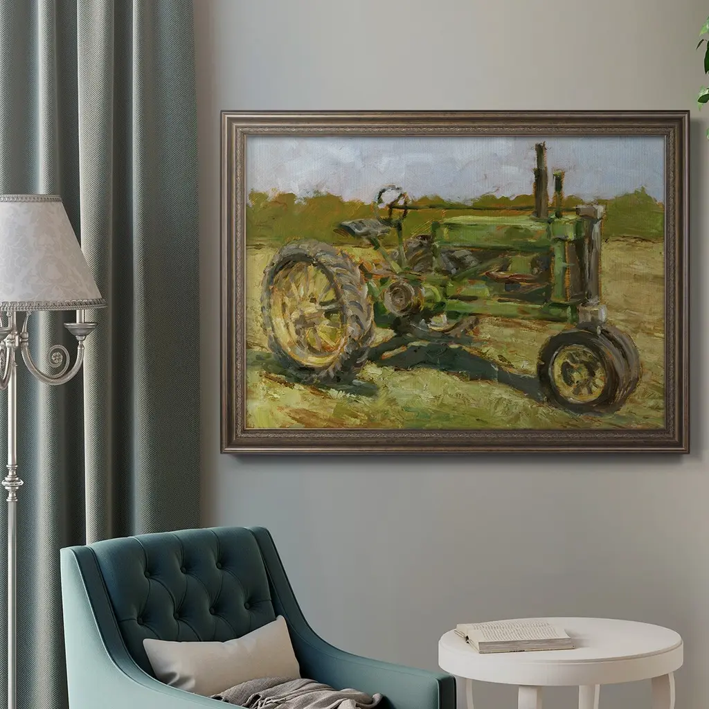Rustic Tractors I Premium Framed Canvas- Ready to Hang A Premium Framed Canvas created to last. Framed in distressed wood and available in an array of sizes and colors Featuring a beveled a solid wood stretcher bar, each piece comes ready to hand 3 SIZES AVAILABLE 16''X20'' - Overall Size 18'X27'' - Overall Size 24''x36'' - Overall Size Each piece is made to order. Each piece comes with hanging hardware. Made in the USA Ready to Hang Giclee Paper Print Acrylic Glass Beveled Matt Board