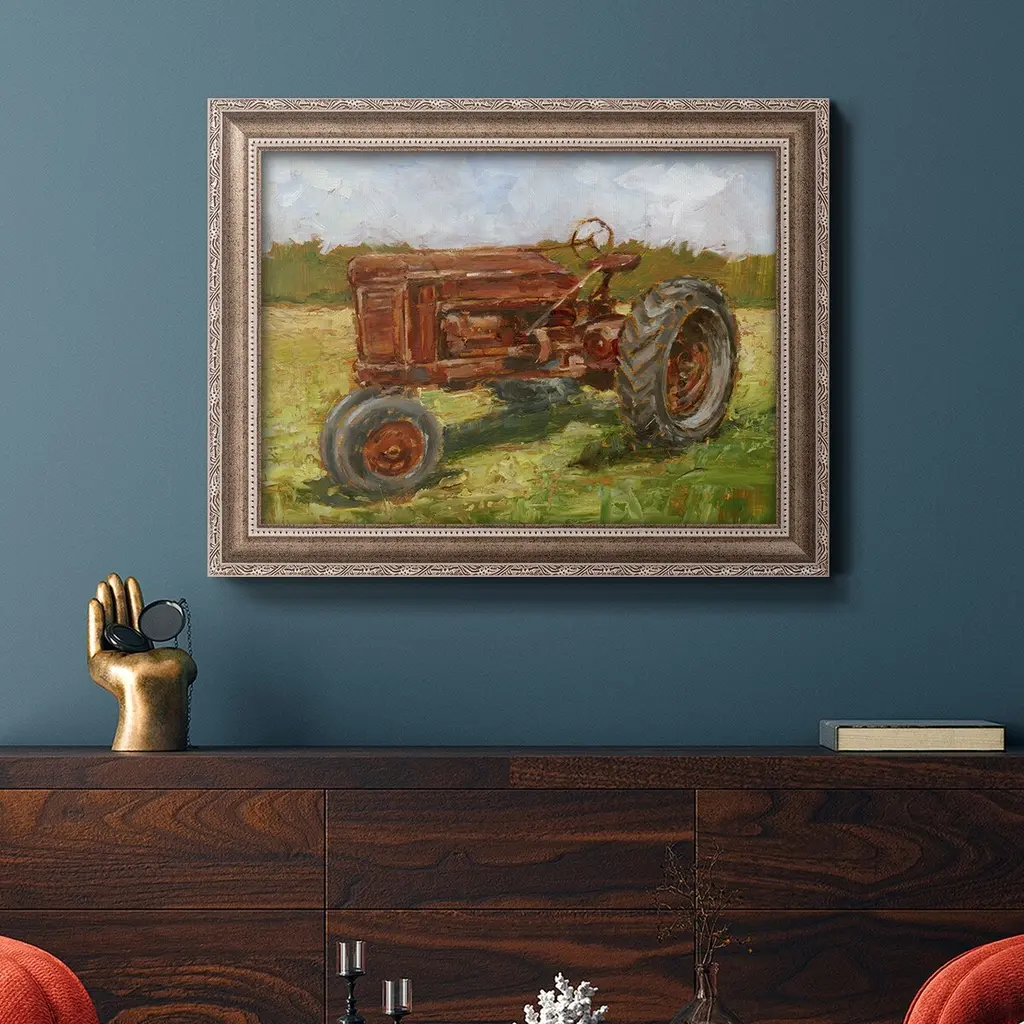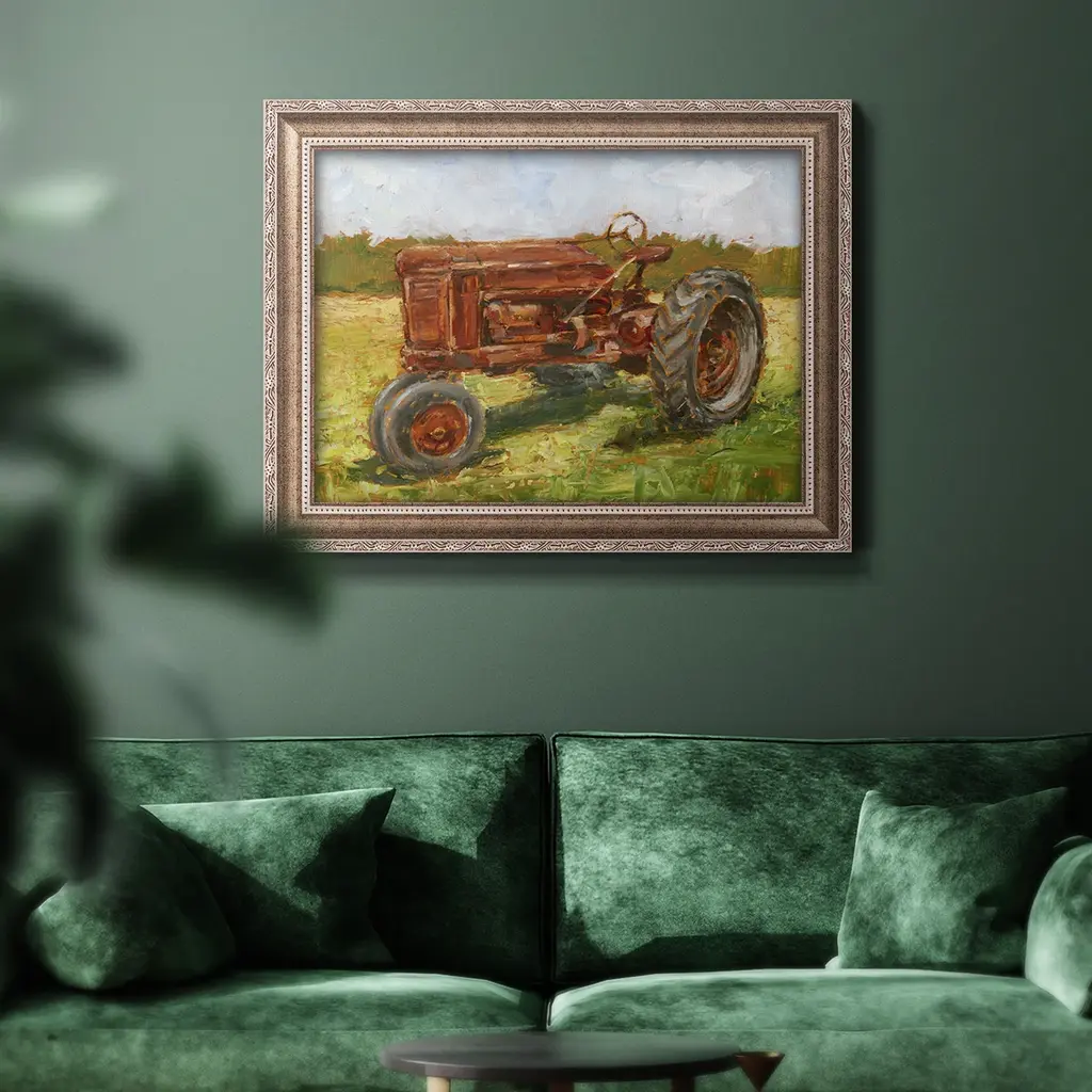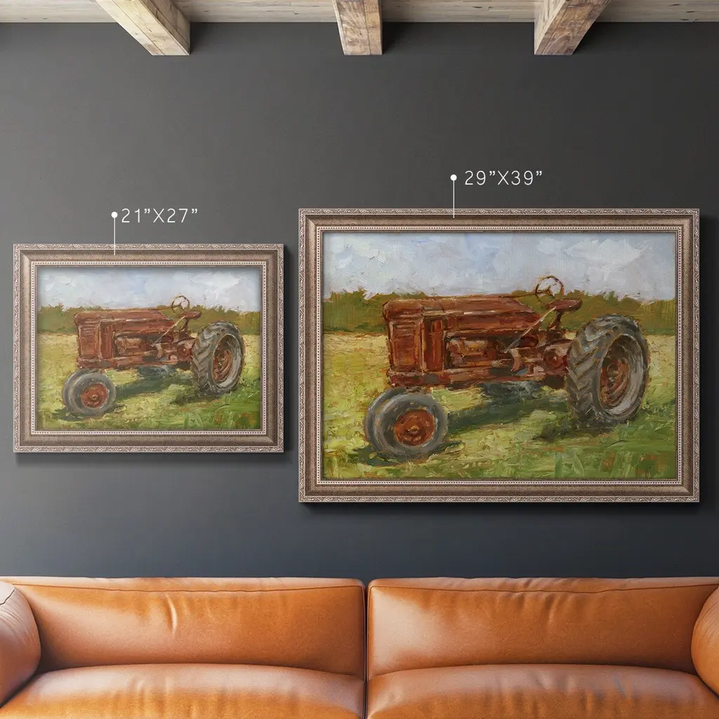 Rustic Tractors II Premium Framed Canvas- Ready to Hang A Premium Framed Canvas created to last. Framed in distressed wood and available in an array of sizes and colors Featuring a beveled a solid wood stretcher bar, each piece comes ready to hand 3 SIZES AVAILABLE 16''X20'' - Overall Size 18'X27'' - Overall Size 24''x36'' - Overall Size Each piece is made to order. Each piece comes with hanging hardware. Made in the USA Ready to Hang Giclee Paper Print Acrylic Glass Beveled Matt Board