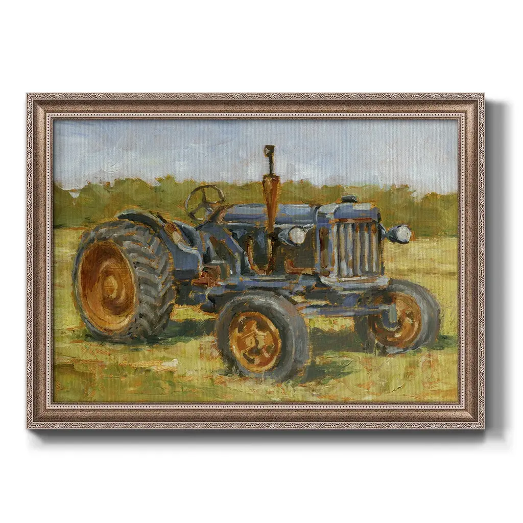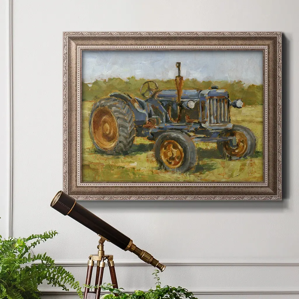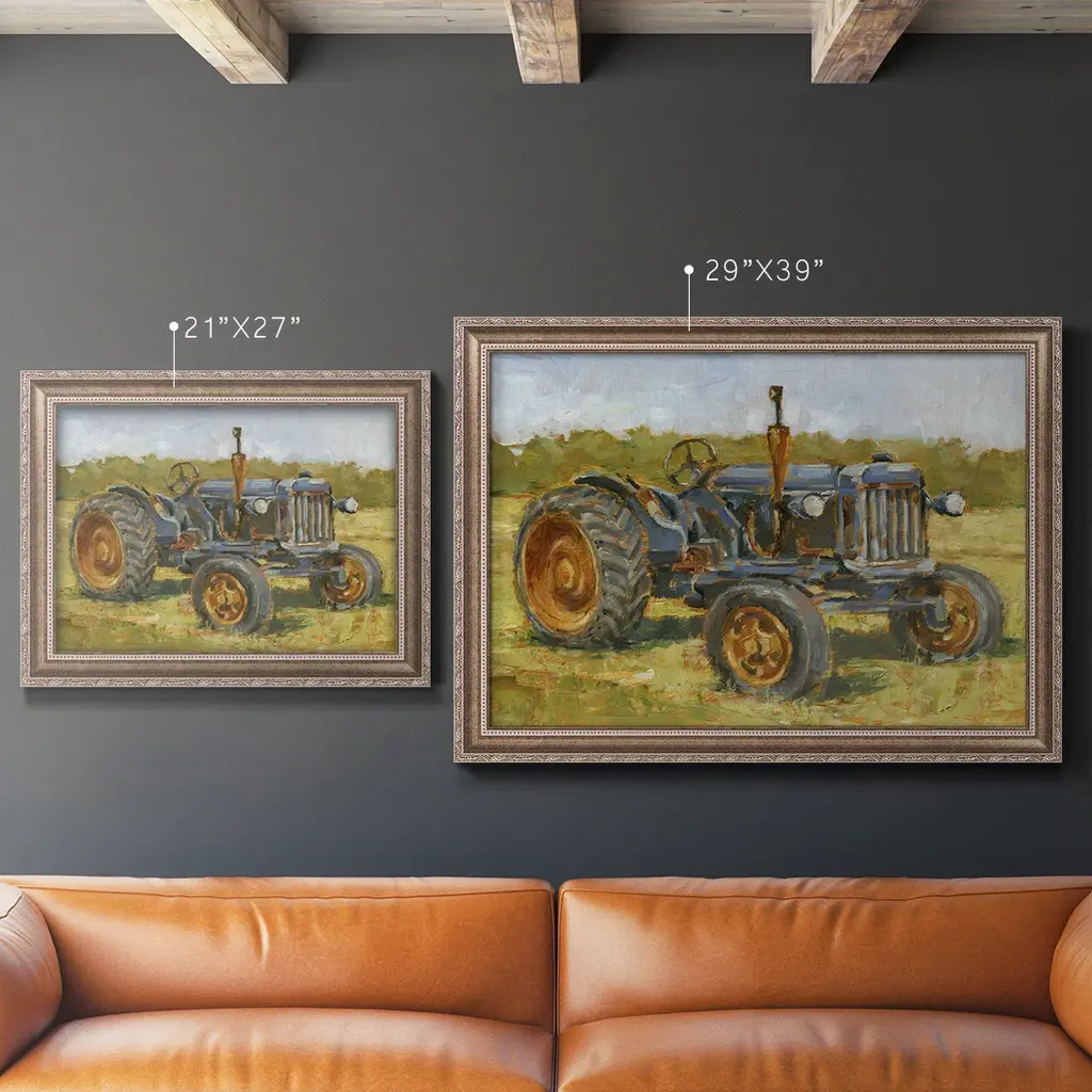 Rustic Tractors III Premium Framed Canvas- Ready to Hang A Premium Framed Canvas created to last. Framed in distressed wood and available in an array of sizes and colors Featuring a beveled a solid wood stretcher bar, each piece comes ready to hand 3 SIZES AVAILABLE 16''X20'' - Overall Size 18'X27'' - Overall Size 24''x36'' - Overall Size Each piece is made to order. Each piece comes with hanging hardware. Made in the USA Ready to Hang Giclee Paper Print Acrylic Glass Beveled Matt Board
