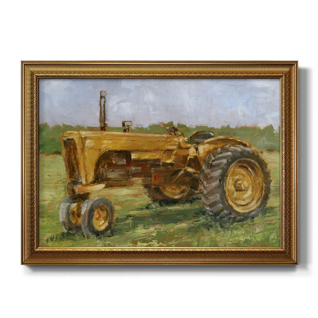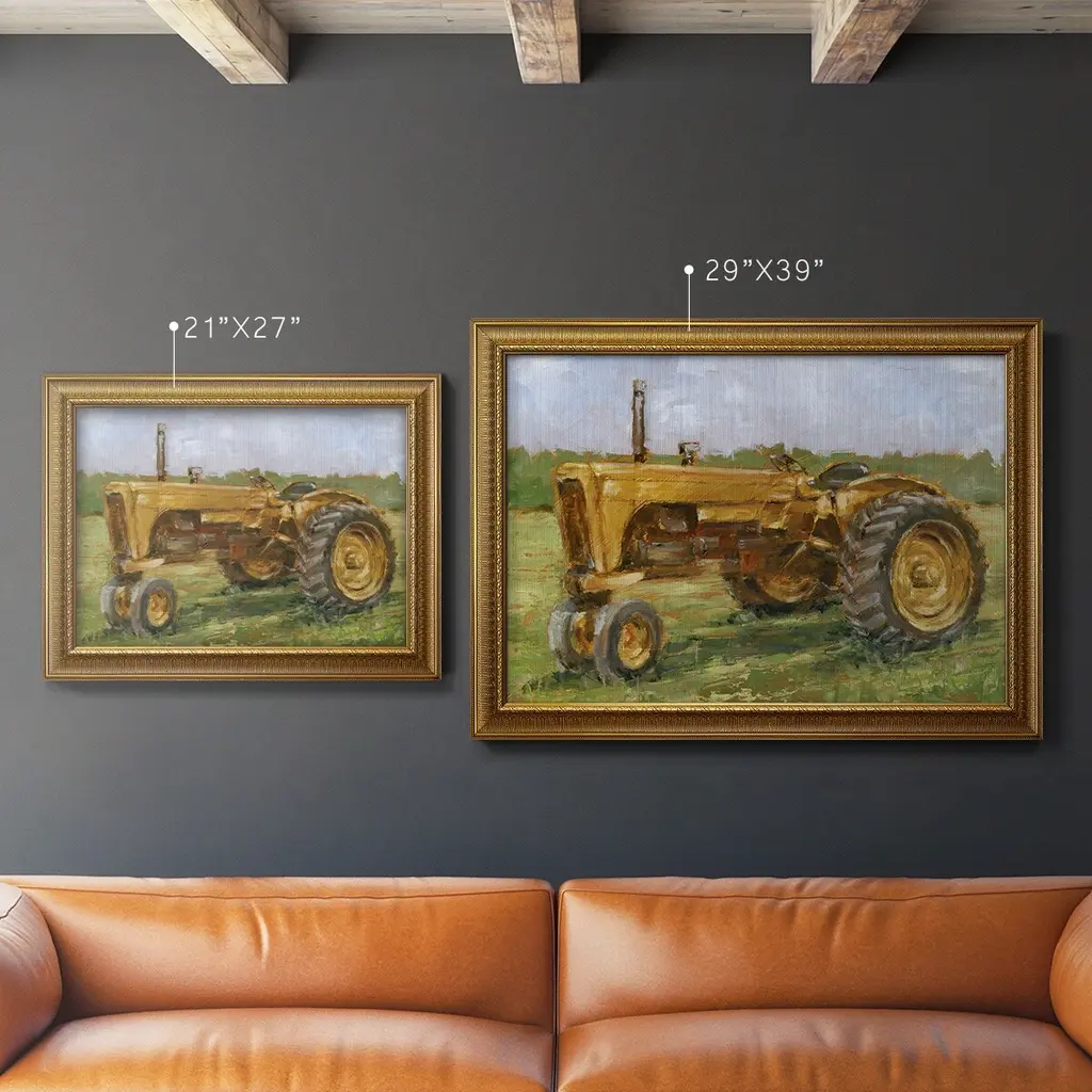 Rustic Tractors IV Premium Framed Canvas- Ready to Hang A Premium Framed Canvas created to last. Framed in distressed wood and available in an array of sizes and colors Featuring a beveled a solid wood stretcher bar, each piece comes ready to hand 3 SIZES AVAILABLE 16''X20'' - Overall Size 18'X27'' - Overall Size 24''x36'' - Overall Size Each piece is made to order. Each piece comes with hanging hardware. Made in the USA Ready to Hang Giclee Paper Print Acrylic Glass Beveled Matt Board