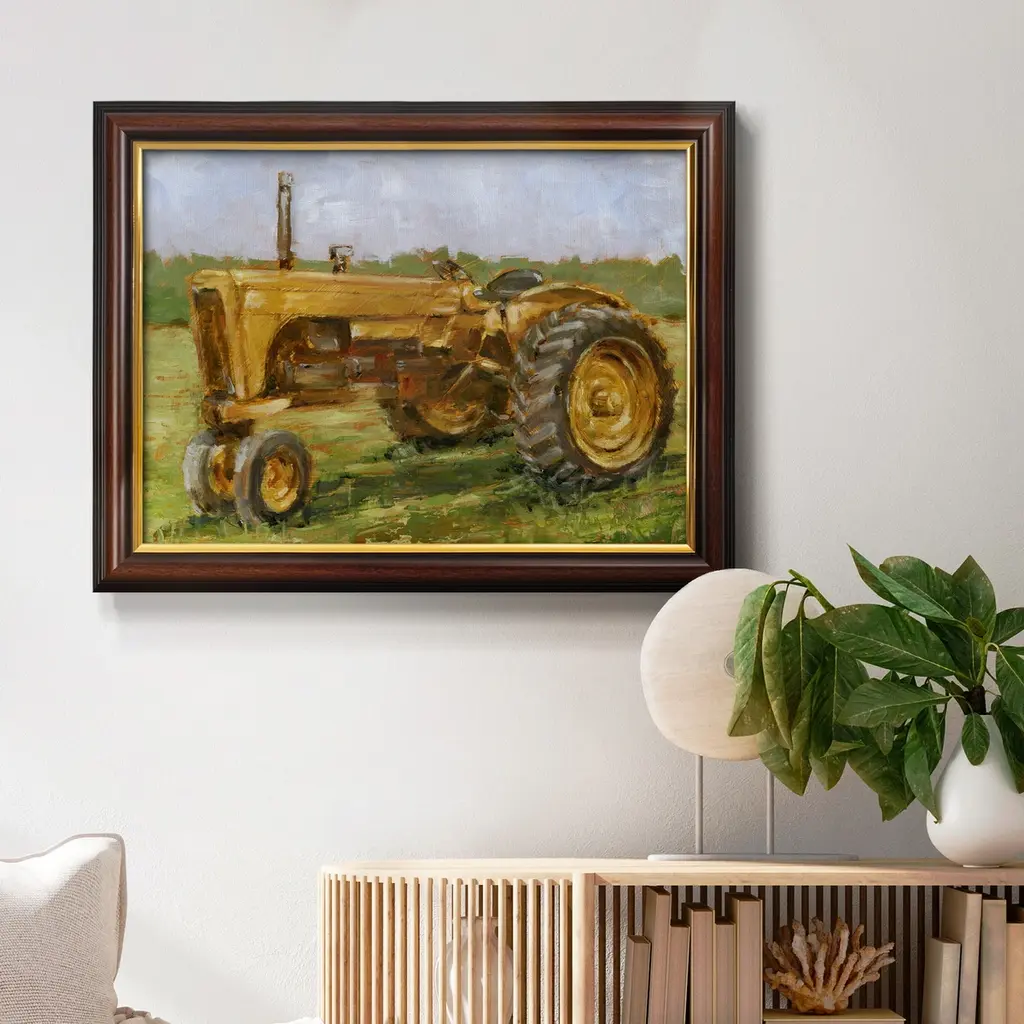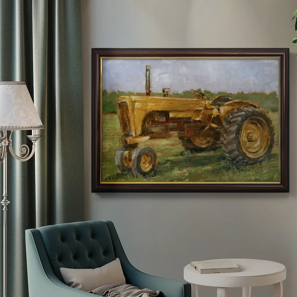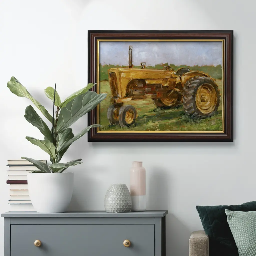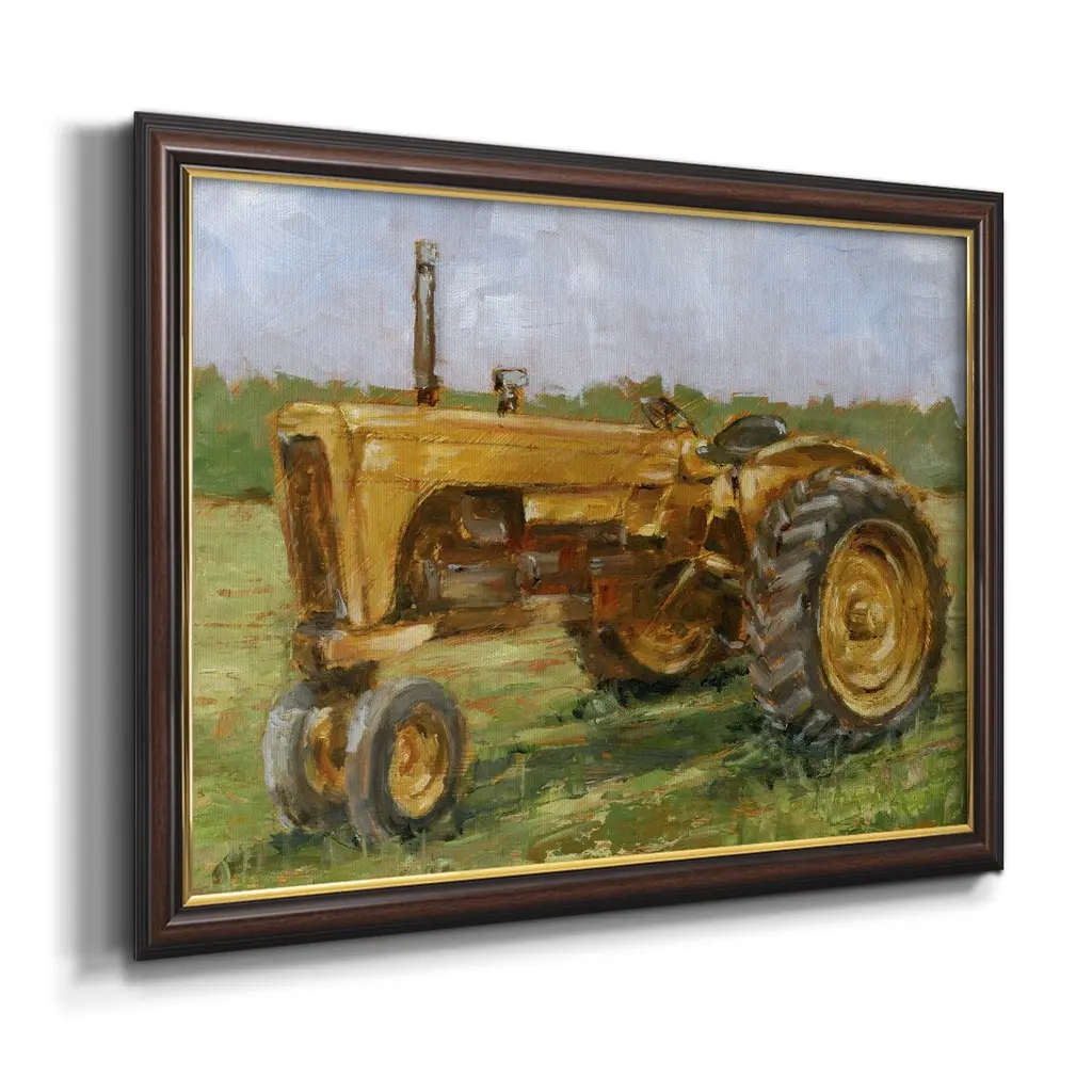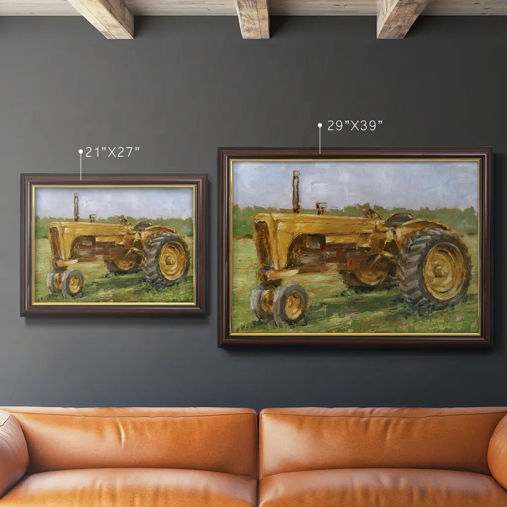 Rustic Tractors IV Premium Framed Canvas- Ready to Hang A Premium Framed Canvas created to last. Framed in distressed wood and available in an array of sizes and colors Featuring a beveled a solid wood stretcher bar, each piece comes ready to hand 3 SIZES AVAILABLE 16''X20'' - Overall Size 18'X27'' - Overall Size 24''x36'' - Overall Size Each piece is made to order. Each piece comes with hanging hardware. Made in the USA Ready to Hang Giclee Paper Print Acrylic Glass Beveled Matt Board