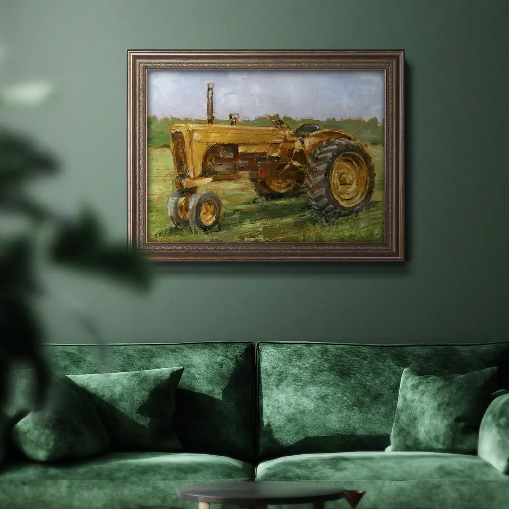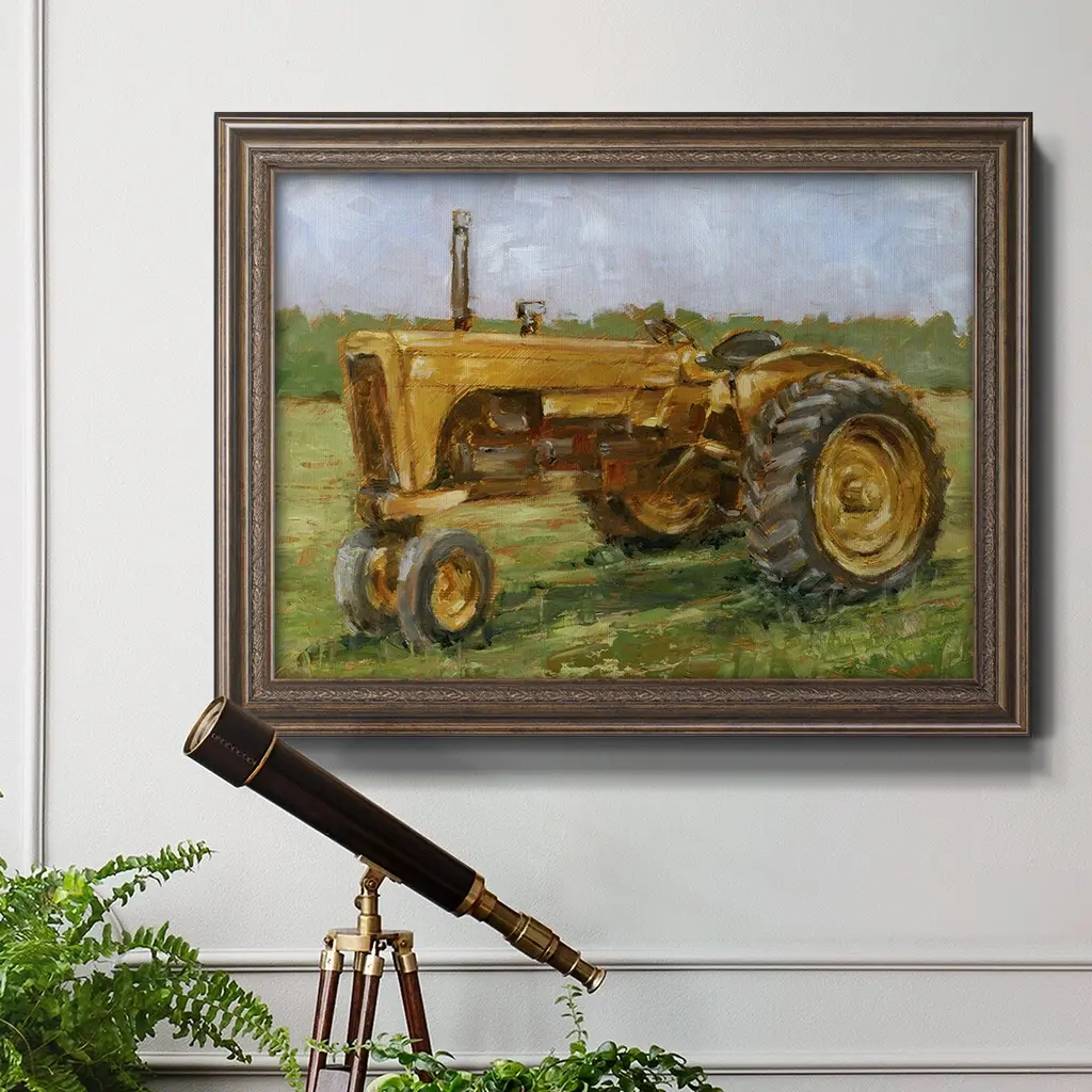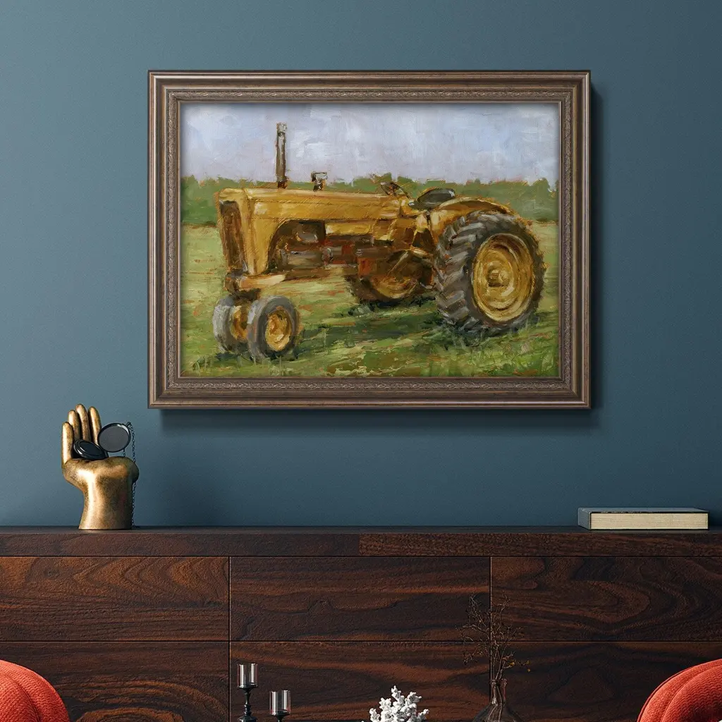 Rustic Tractors IV Premium Framed Canvas- Ready to Hang A Premium Framed Canvas created to last. Framed in distressed wood and available in an array of sizes and colors Featuring a beveled a solid wood stretcher bar, each piece comes ready to hand 3 SIZES AVAILABLE 16''X20'' - Overall Size 18'X27'' - Overall Size 24''x36'' - Overall Size Each piece is made to order. Each piece comes with hanging hardware. Made in the USA Ready to Hang Giclee Paper Print Acrylic Glass Beveled Matt Board