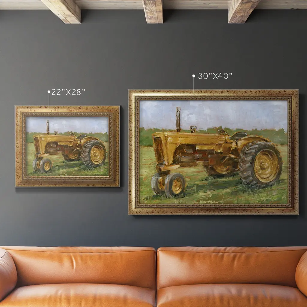 Rustic Tractors IV Premium Framed Canvas- Ready to Hang A Premium Framed Canvas created to last. Framed in distressed wood and available in an array of sizes and colors Featuring a beveled a solid wood stretcher bar, each piece comes ready to hand 3 SIZES AVAILABLE 16''X20'' - Overall Size 18'X27'' - Overall Size 24''x36'' - Overall Size Each piece is made to order. Each piece comes with hanging hardware. Made in the USA Ready to Hang Giclee Paper Print Acrylic Glass Beveled Matt Board