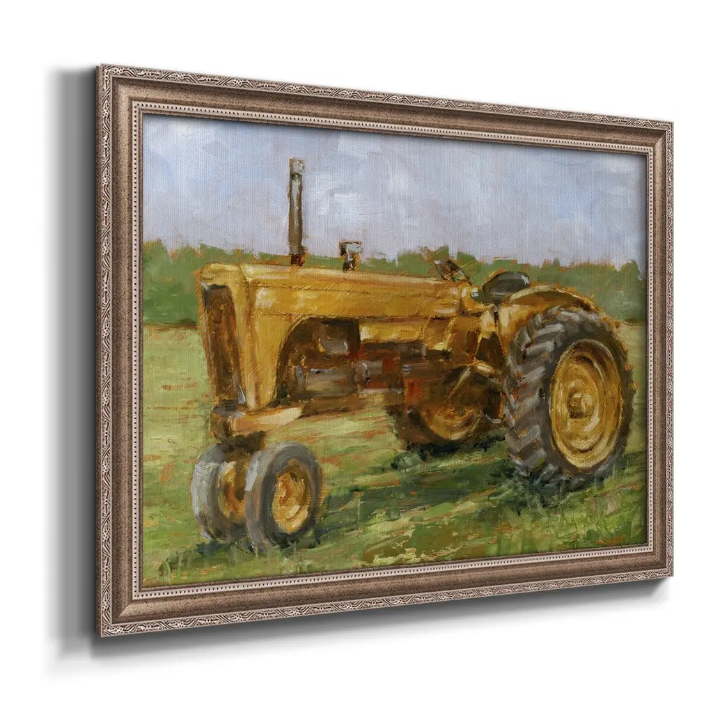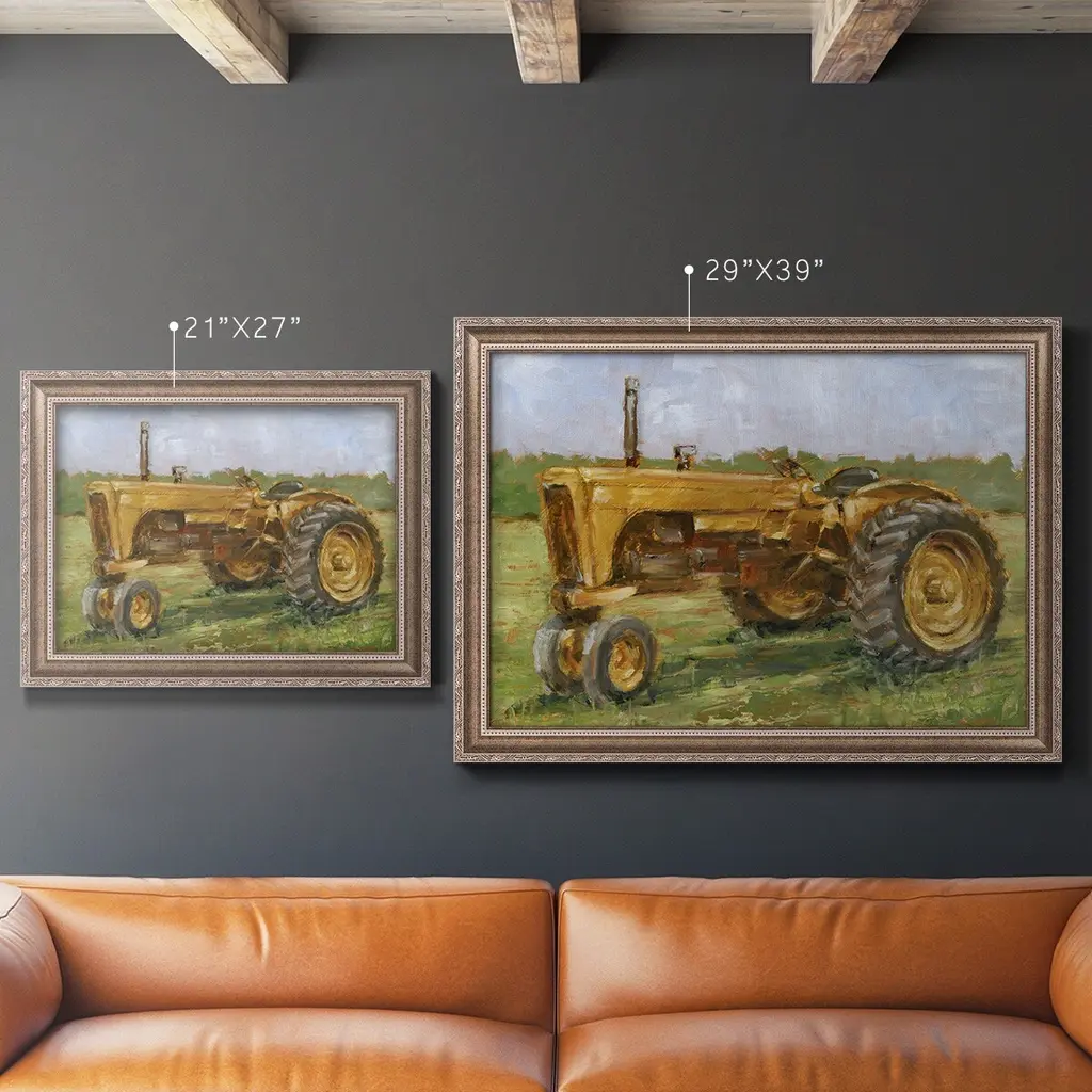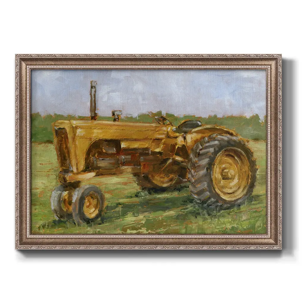 Rustic Tractors IV Premium Framed Canvas- Ready to Hang A Premium Framed Canvas created to last. Framed in distressed wood and available in an array of sizes and colors Featuring a beveled a solid wood stretcher bar, each piece comes ready to hand 3 SIZES AVAILABLE 16''X20'' - Overall Size 18'X27'' - Overall Size 24''x36'' - Overall Size Each piece is made to order. Each piece comes with hanging hardware. Made in the USA Ready to Hang Giclee Paper Print Acrylic Glass Beveled Matt Board