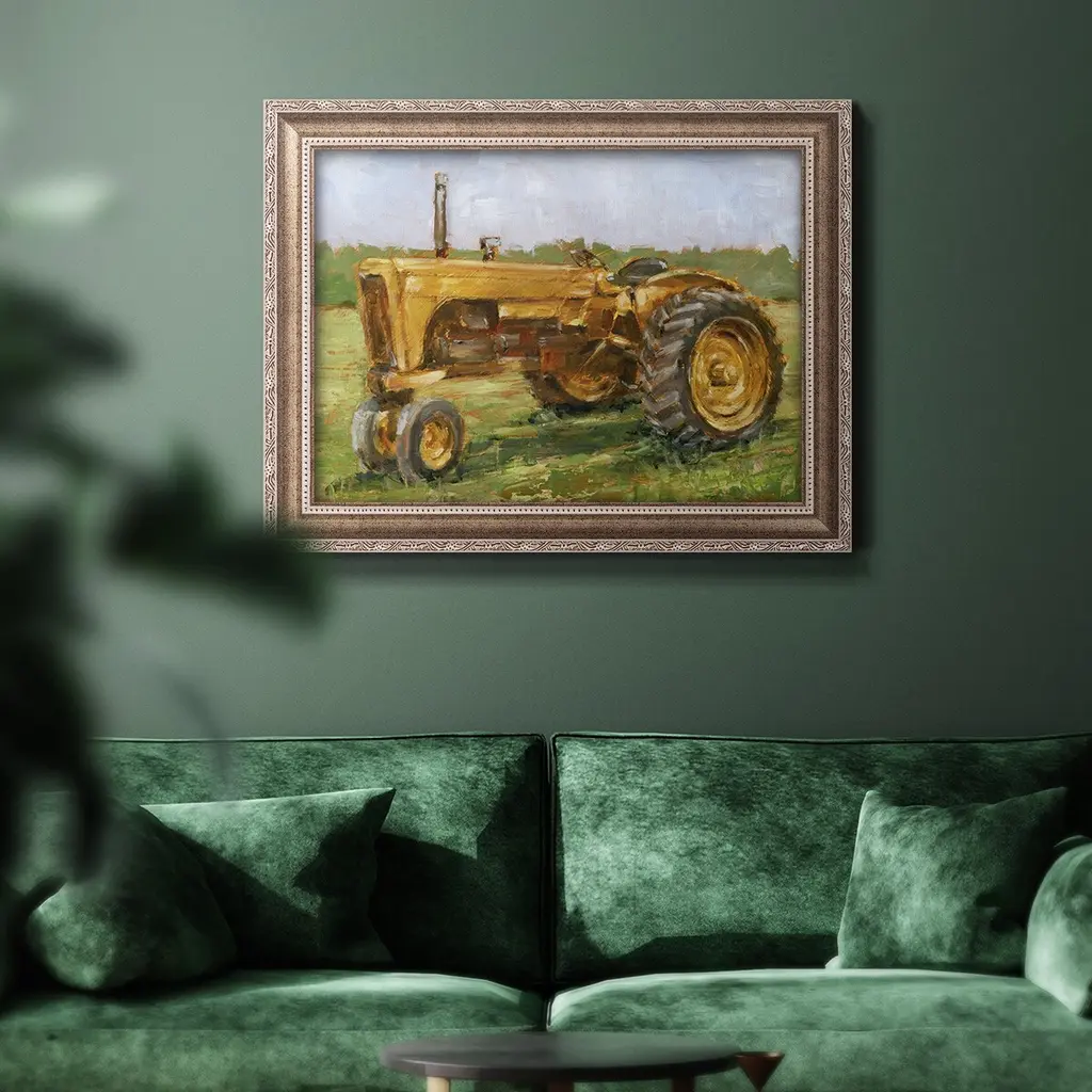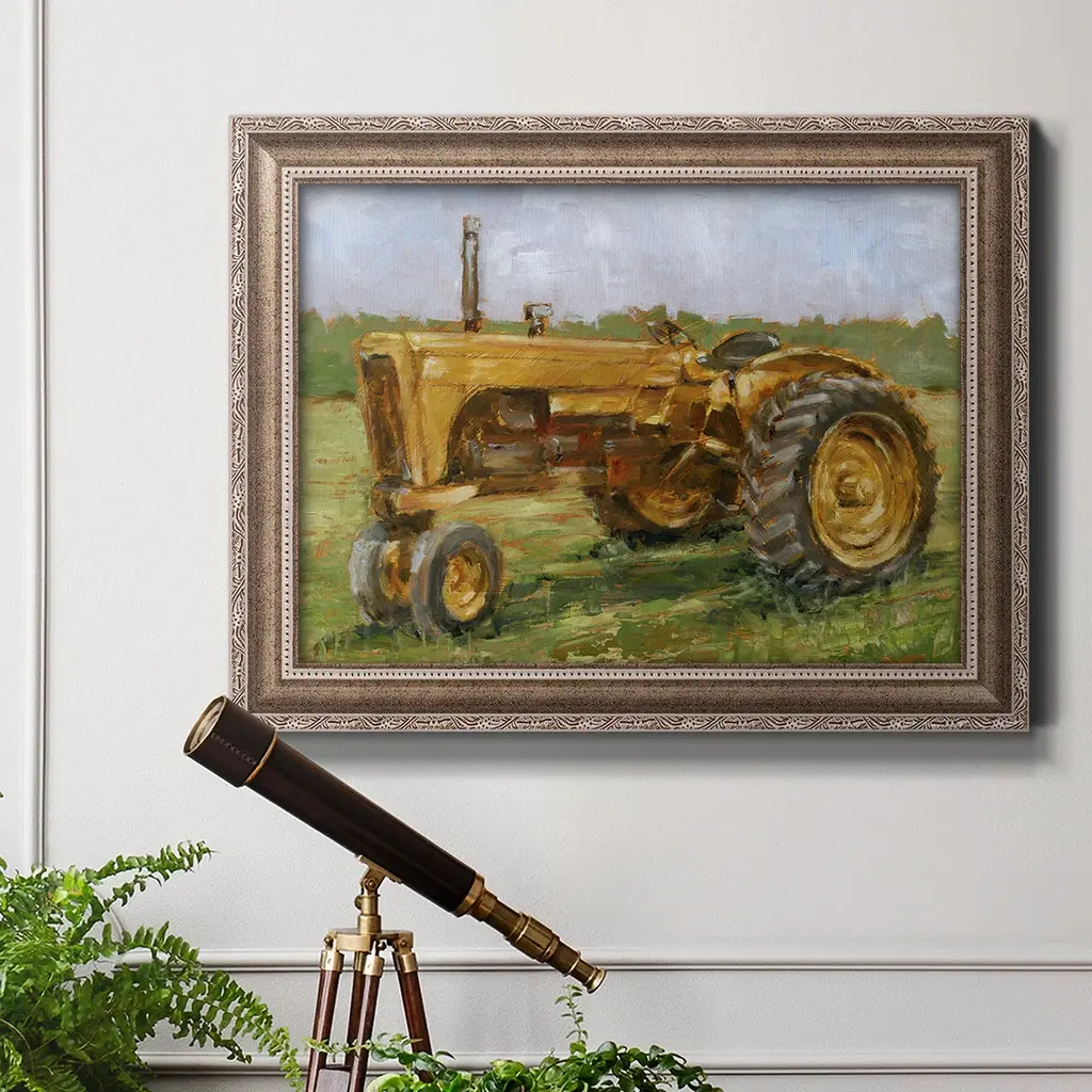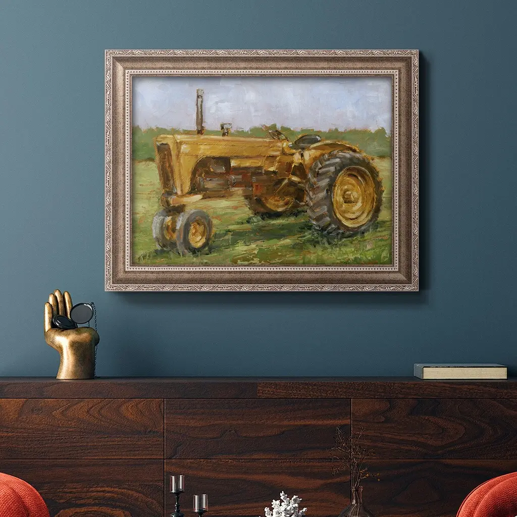 Rustic Tractors IV Premium Framed Canvas- Ready to Hang A Premium Framed Canvas created to last. Framed in distressed wood and available in an array of sizes and colors Featuring a beveled a solid wood stretcher bar, each piece comes ready to hand 3 SIZES AVAILABLE 16''X20'' - Overall Size 18'X27'' - Overall Size 24''x36'' - Overall Size Each piece is made to order. Each piece comes with hanging hardware. Made in the USA Ready to Hang Giclee Paper Print Acrylic Glass Beveled Matt Board