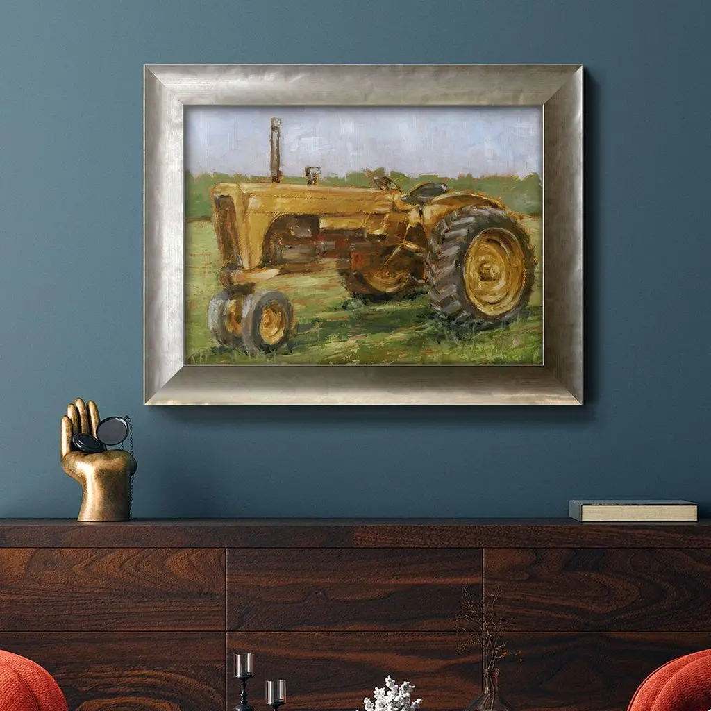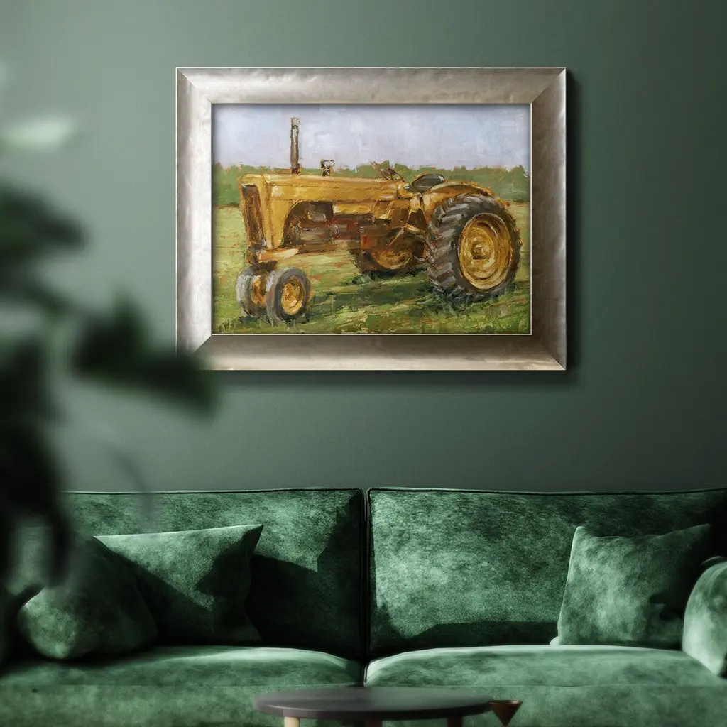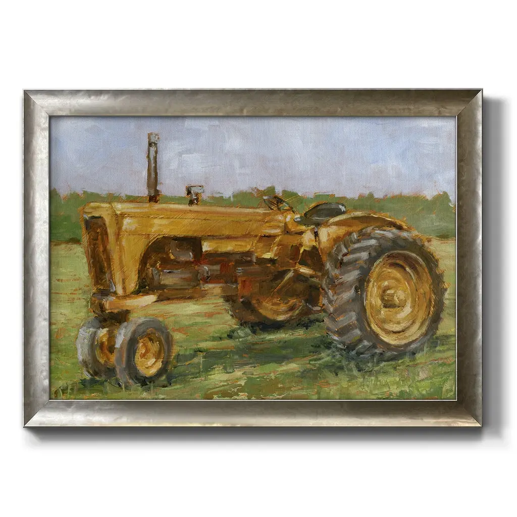 Rustic Tractors IV Premium Framed Canvas- Ready to Hang A Premium Framed Canvas created to last. Framed in distressed wood and available in an array of sizes and colors Featuring a beveled a solid wood stretcher bar, each piece comes ready to hand 3 SIZES AVAILABLE 16''X20'' - Overall Size 18'X27'' - Overall Size 24''x36'' - Overall Size Each piece is made to order. Each piece comes with hanging hardware. Made in the USA Ready to Hang Giclee Paper Print Acrylic Glass Beveled Matt Board