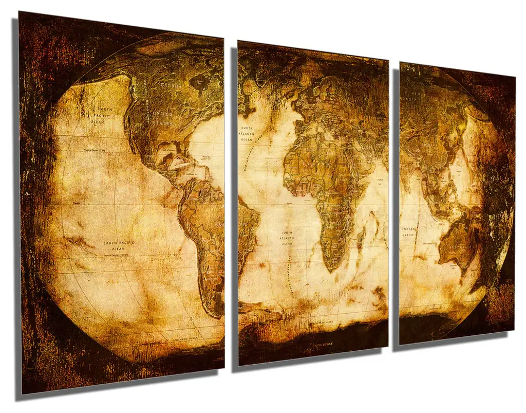 36"œ x 18"œ total size. Ready To Hang! (3 pieces - 12"œ x 18"œ each). 3 Panel Split (Triptych) Rustic World Map Metal Print. Modern metal wall art for home or office wall decor & interior design. Printed on Luxurious, HD aluminum glossy metal panels. Multi panel art.. HD aluminum panels. Metal print wall art. Includes Shadow Wall Mount on the back.• Aluminum Metal Wall Art• Made in USA• Ready to hang - No assembly required• Shadow mount hardware on the back• 0.045"œ thick HD Aluminum Panels• Scratch resistant, glossy finish• Superb color clarity, luxurious prints• Epson printing process• For indoor or moisture rich environment use• Easy to clean. Gently wipe with microfiber cloth.