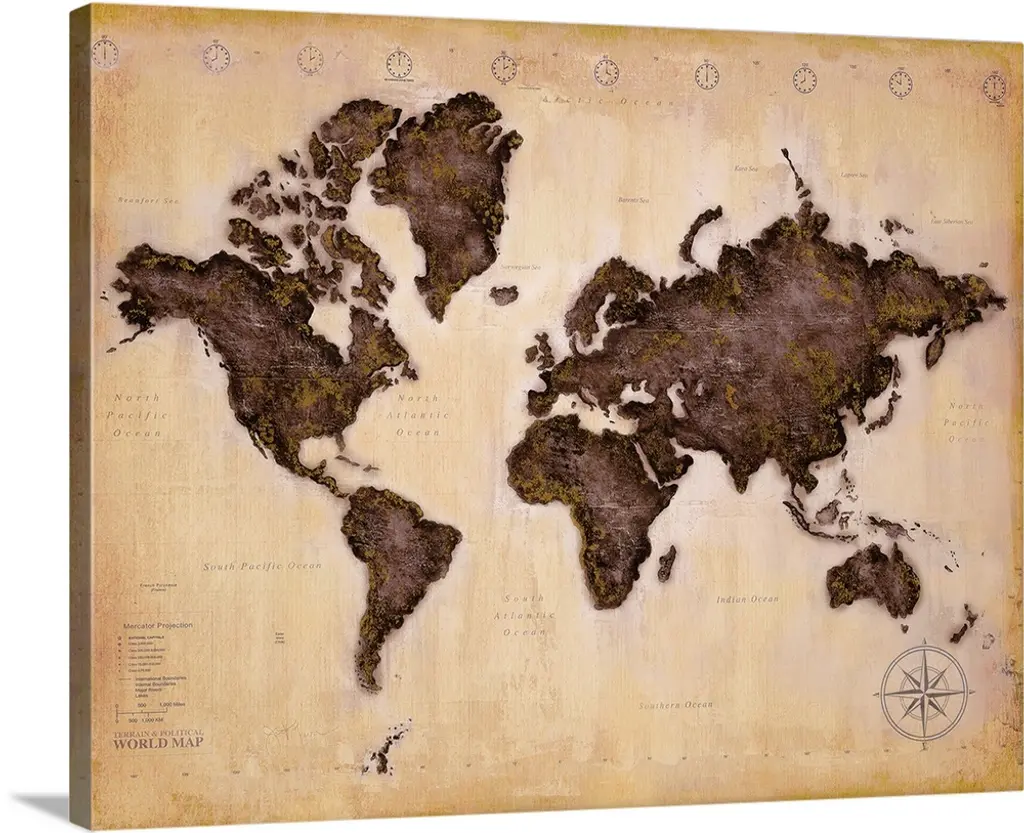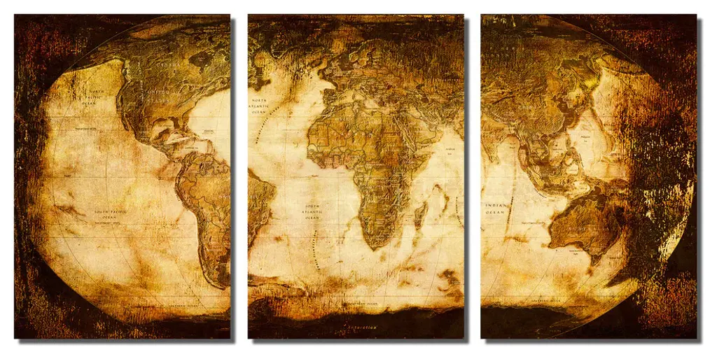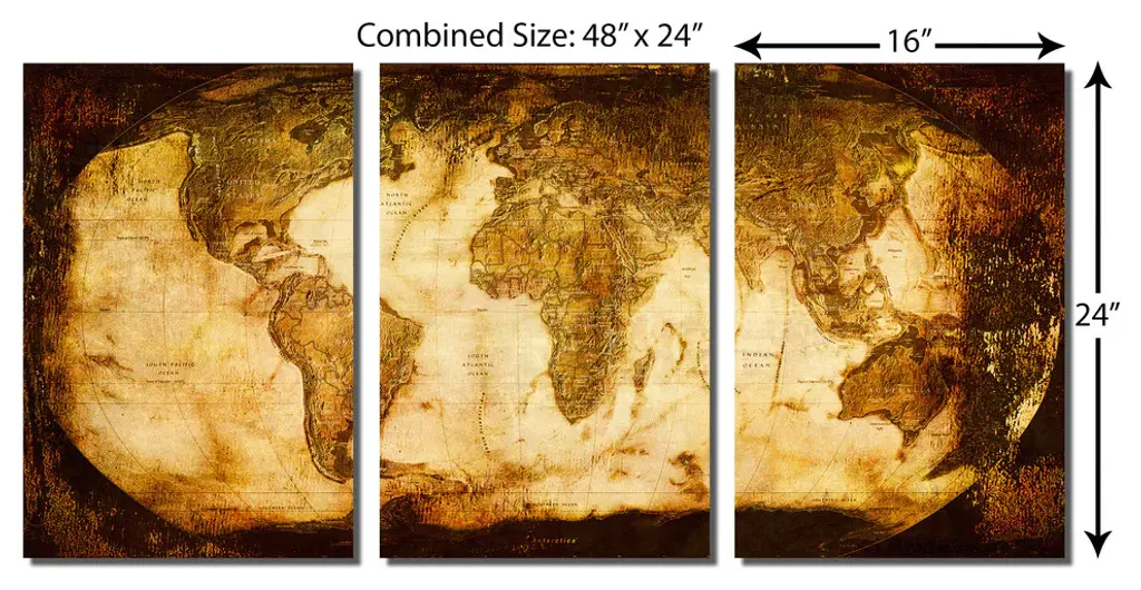 48"œ x 24"œ total size. Ready To Hang! (3 pieces - 16"œ x 24"œ each). 3 Panel Split (Triptych) Rustic World Map Metal Print. Modern metal wall art for home or office wall decor & interior design. Printed on Luxurious, HD aluminum glossy metal panels. Multi panel art.. HD aluminum panels. Metal print wall art. Includes Shadow Wall Mount on the back.• Aluminum Metal Wall Art• Made in USA• Ready to hang - No assembly required• Shadow mount hardware on the back• 0.045"œ thick HD Aluminum Panels• Scratch resistant, glossy finish• Superb color clarity, luxurious prints• Epson printing process• For indoor or moisture rich environment use• Easy to clean. Gently wipe with microfiber cloth.