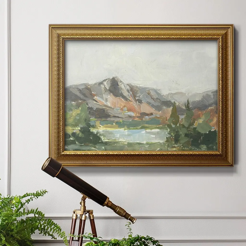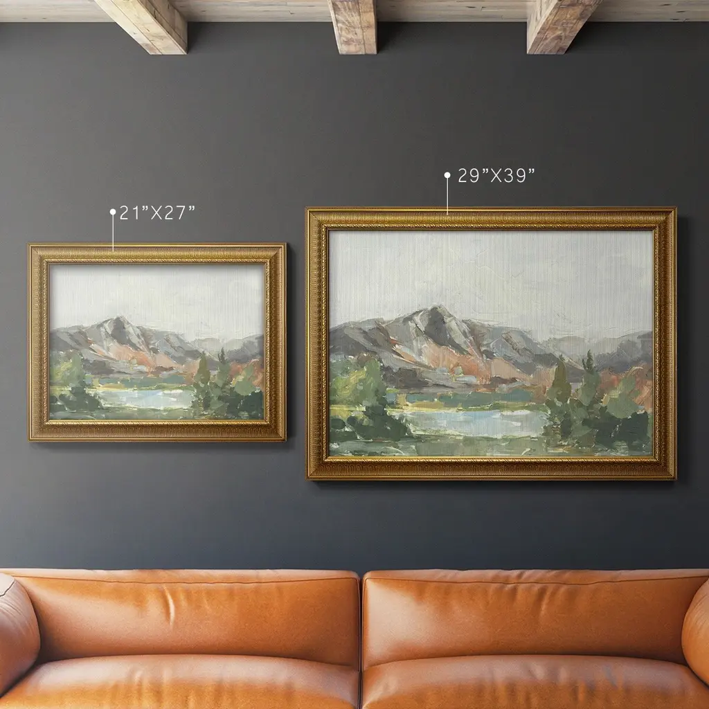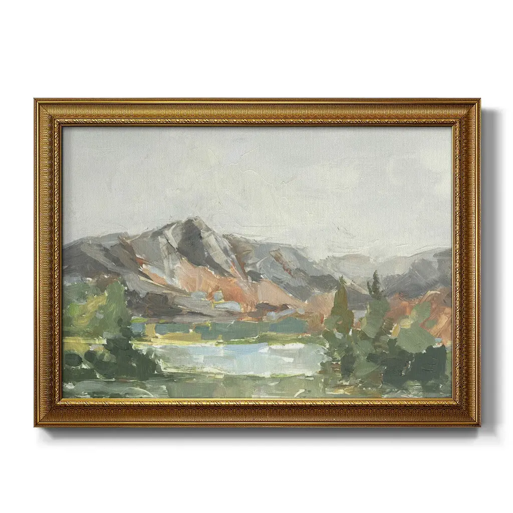 Rusty Mountains I Premium Framed Canvas- Ready to Hang A Premium Framed Canvas created to last. Framed in distressed wood and available in an array of sizes and colors Featuring a beveled a solid wood stretcher bar, each piece comes ready to hand 3 SIZES AVAILABLE 16''X20'' - Overall Size 18'X27'' - Overall Size 24''x36'' - Overall Size Each piece is made to order. Each piece comes with hanging hardware. Made in the USA Ready to Hang Giclee Paper Print Acrylic Glass Beveled Matt Board
