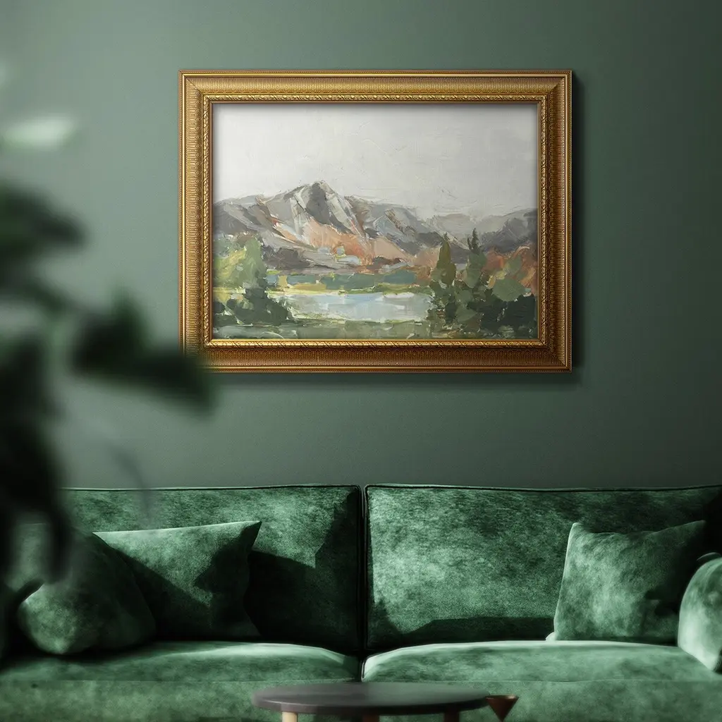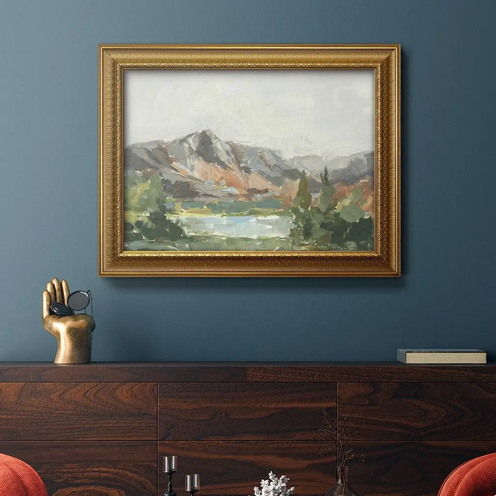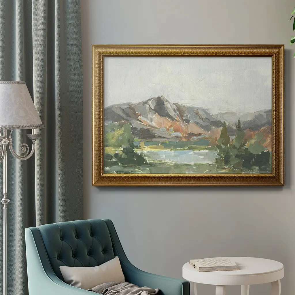 Rusty Mountains I Premium Framed Canvas- Ready to Hang A Premium Framed Canvas created to last. Framed in distressed wood and available in an array of sizes and colors Featuring a beveled a solid wood stretcher bar, each piece comes ready to hand 3 SIZES AVAILABLE 16''X20'' - Overall Size 18'X27'' - Overall Size 24''x36'' - Overall Size Each piece is made to order. Each piece comes with hanging hardware. Made in the USA Ready to Hang Giclee Paper Print Acrylic Glass Beveled Matt Board