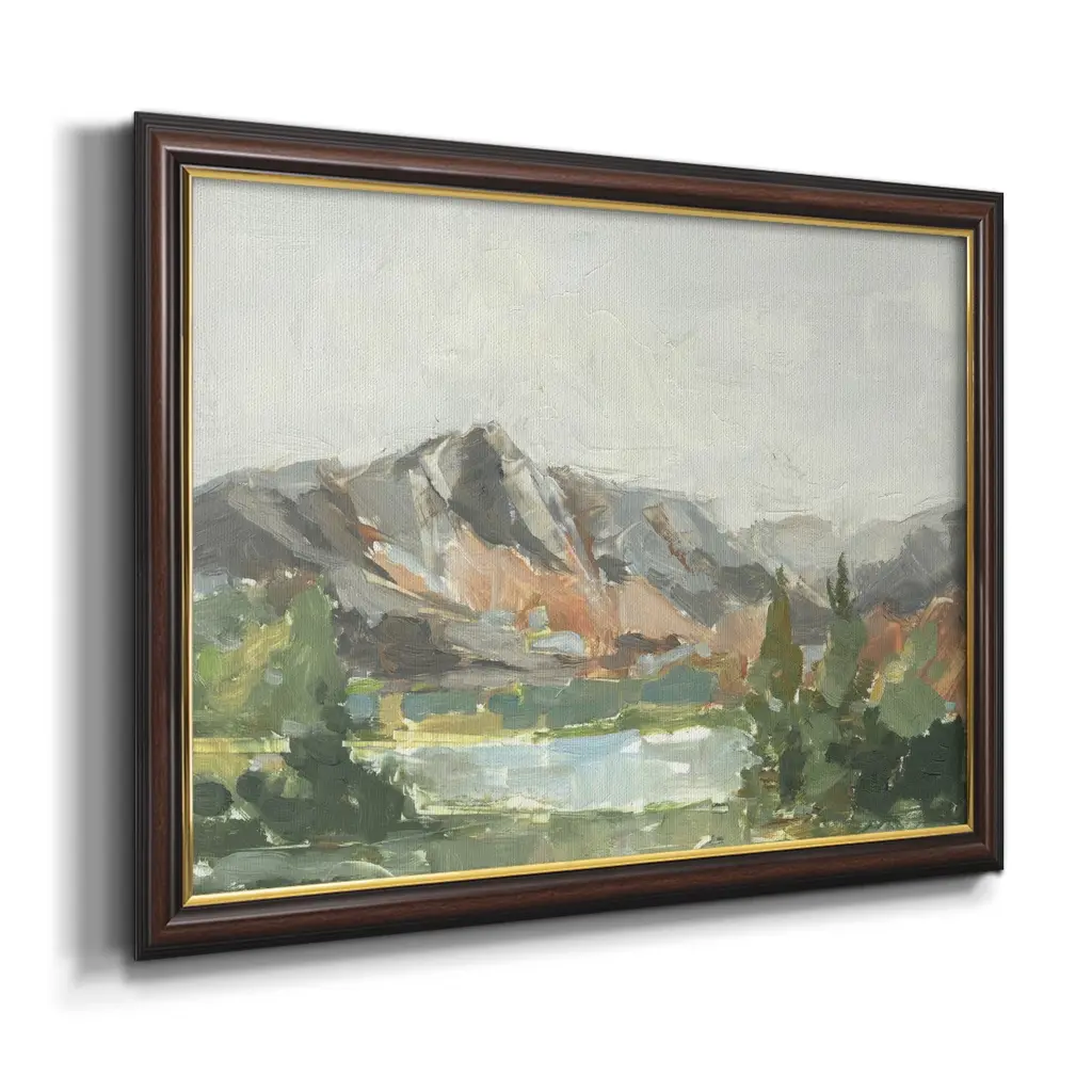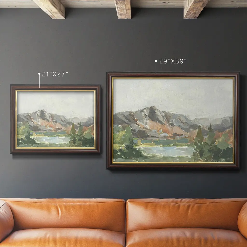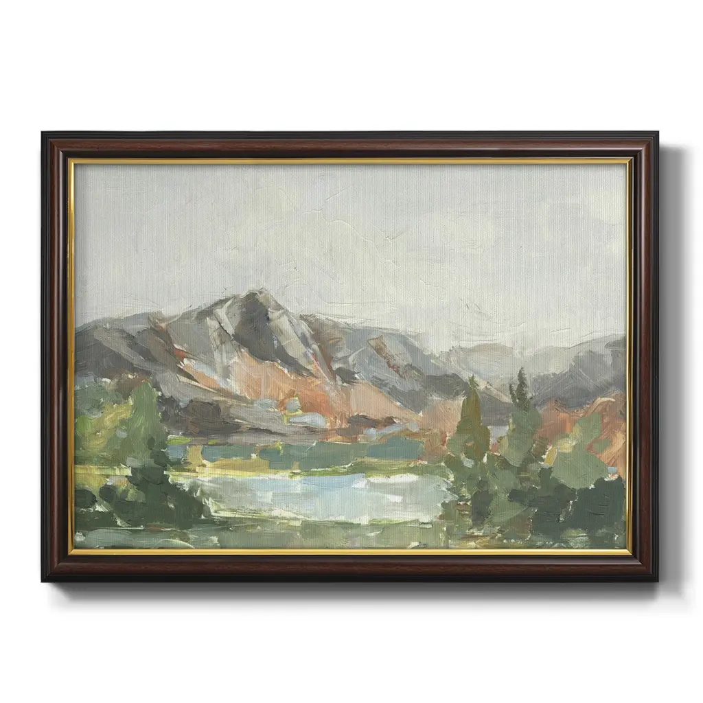 Rusty Mountains I Premium Framed Canvas- Ready to Hang A Premium Framed Canvas created to last. Framed in distressed wood and available in an array of sizes and colors Featuring a beveled a solid wood stretcher bar, each piece comes ready to hand 3 SIZES AVAILABLE 16''X20'' - Overall Size 18'X27'' - Overall Size 24''x36'' - Overall Size Each piece is made to order. Each piece comes with hanging hardware. Made in the USA Ready to Hang Giclee Paper Print Acrylic Glass Beveled Matt Board