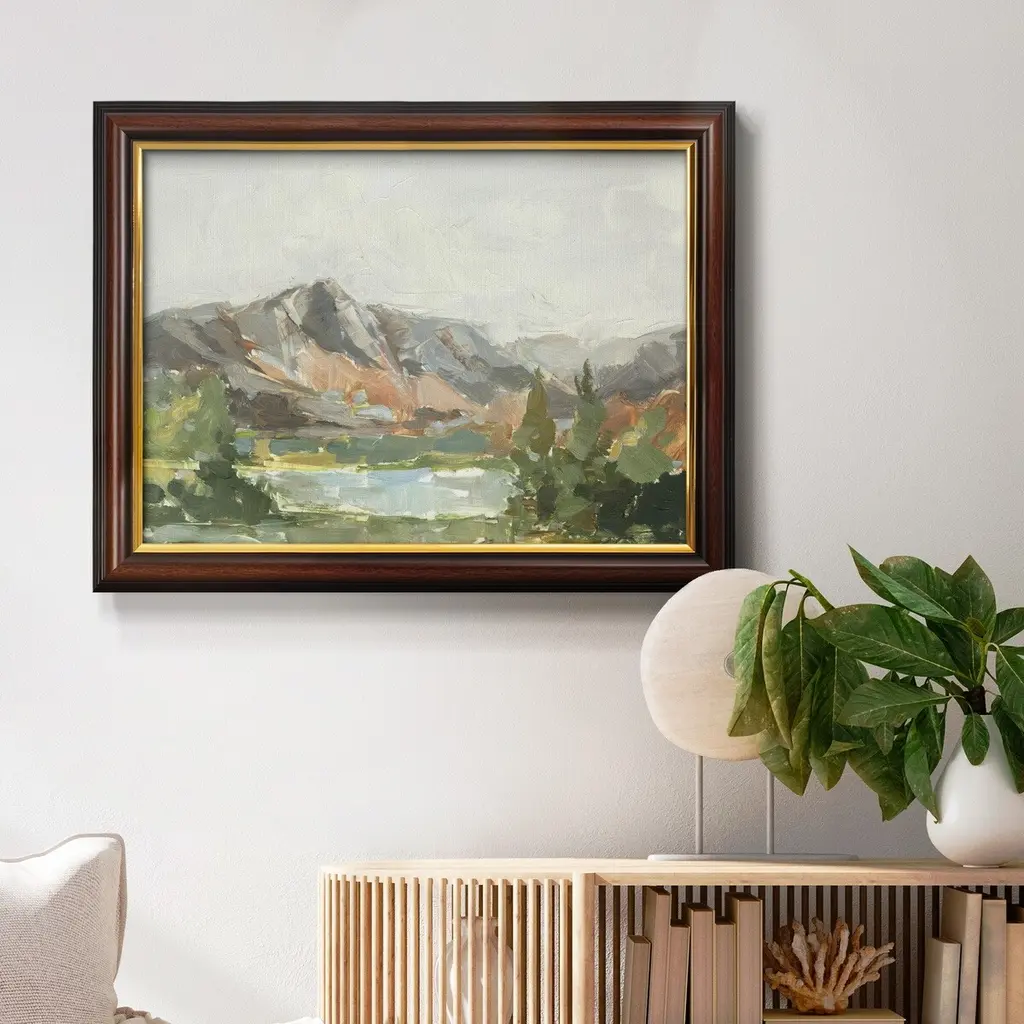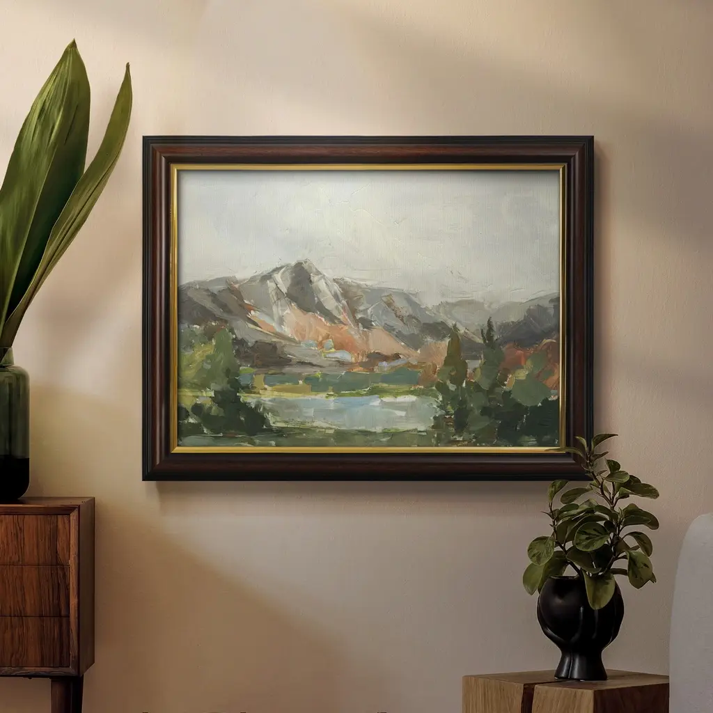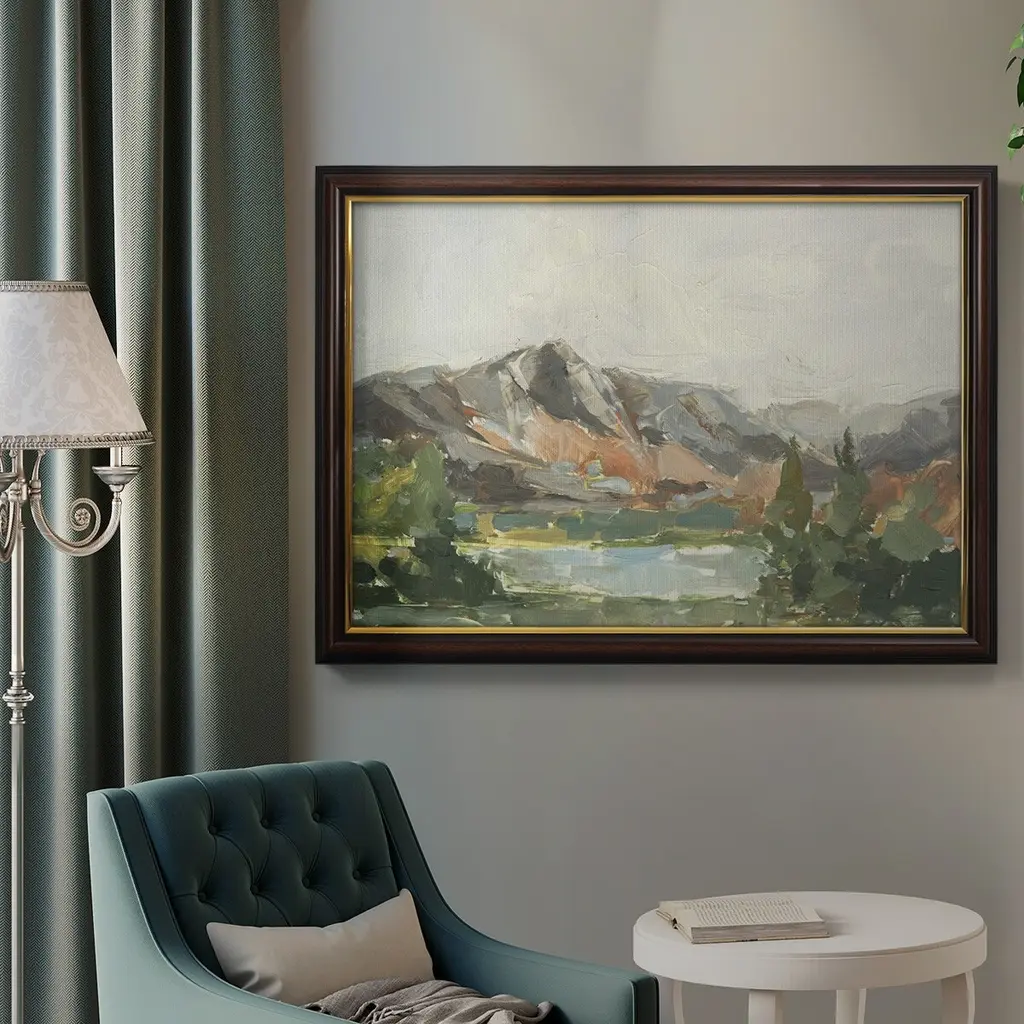 Rusty Mountains I Premium Framed Canvas- Ready to Hang A Premium Framed Canvas created to last. Framed in distressed wood and available in an array of sizes and colors Featuring a beveled a solid wood stretcher bar, each piece comes ready to hand 3 SIZES AVAILABLE 16''X20'' - Overall Size 18'X27'' - Overall Size 24''x36'' - Overall Size Each piece is made to order. Each piece comes with hanging hardware. Made in the USA Ready to Hang Giclee Paper Print Acrylic Glass Beveled Matt Board