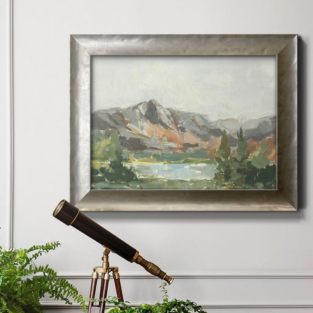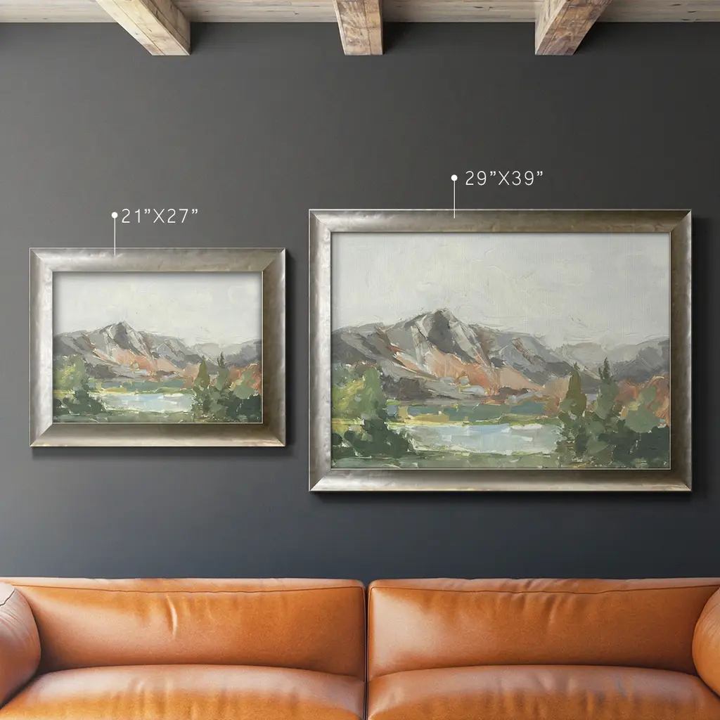 Rusty Mountains I Premium Framed Canvas- Ready to Hang A Premium Framed Canvas created to last. Framed in distressed wood and available in an array of sizes and colors Featuring a beveled a solid wood stretcher bar, each piece comes ready to hand 3 SIZES AVAILABLE 16''X20'' - Overall Size 18'X27'' - Overall Size 24''x36'' - Overall Size Each piece is made to order. Each piece comes with hanging hardware. Made in the USA Ready to Hang Giclee Paper Print Acrylic Glass Beveled Matt Board