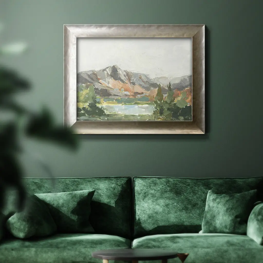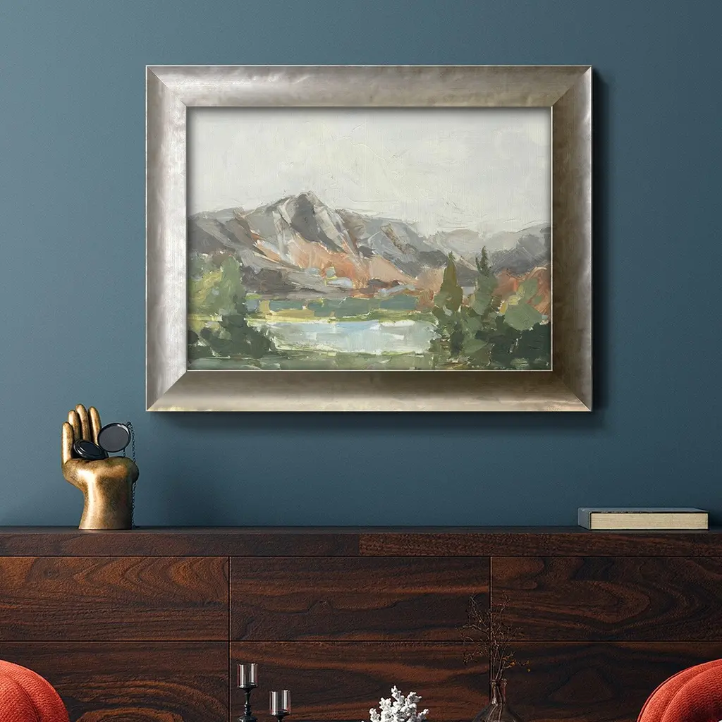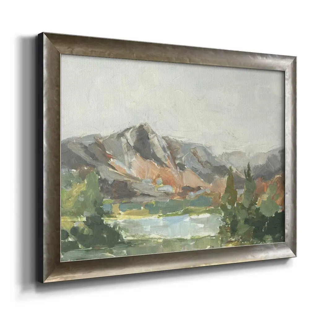 Rusty Mountains I Premium Framed Canvas- Ready to Hang A Premium Framed Canvas created to last. Framed in distressed wood and available in an array of sizes and colors Featuring a beveled a solid wood stretcher bar, each piece comes ready to hand 3 SIZES AVAILABLE 16''X20'' - Overall Size 18'X27'' - Overall Size 24''x36'' - Overall Size Each piece is made to order. Each piece comes with hanging hardware. Made in the USA Ready to Hang Giclee Paper Print Acrylic Glass Beveled Matt Board