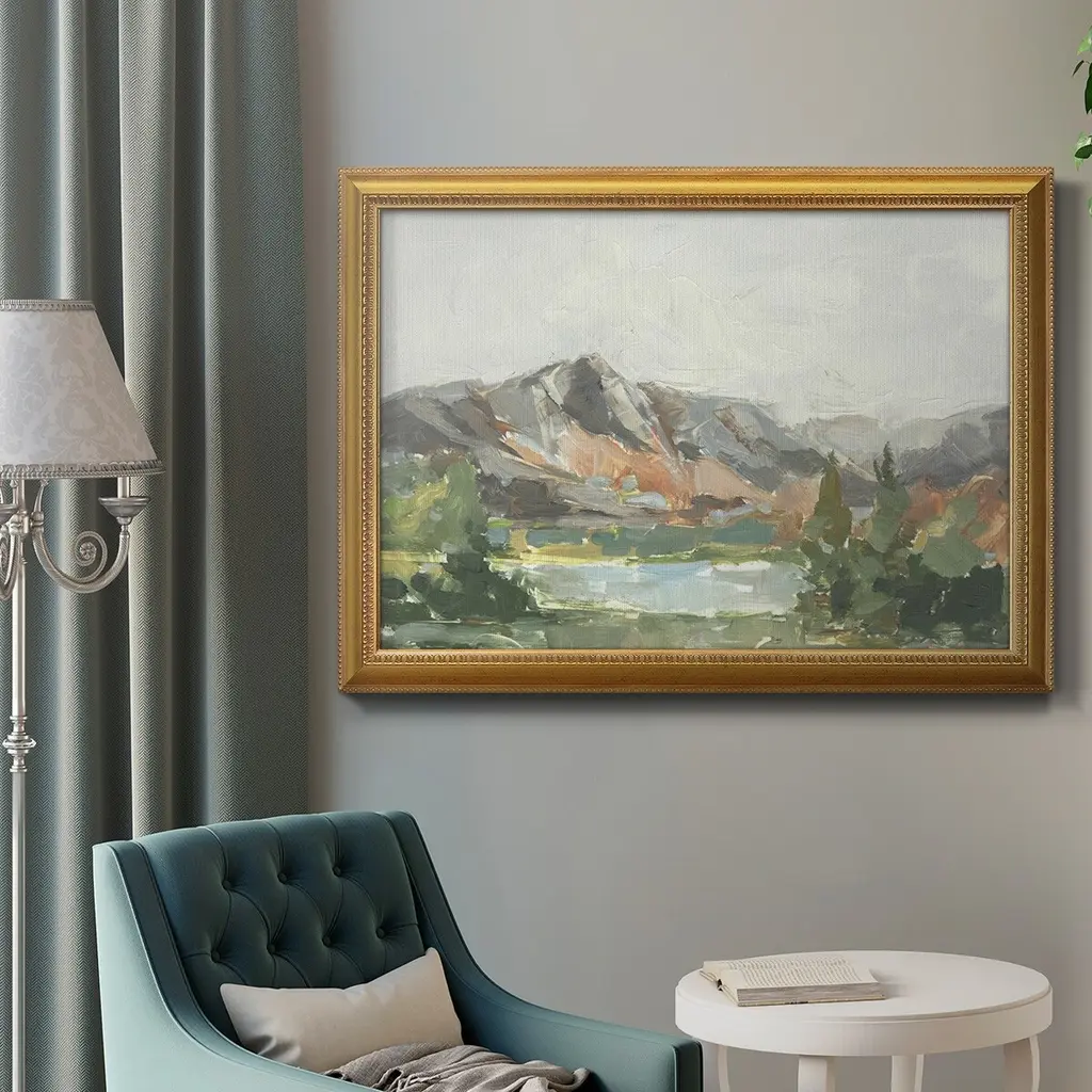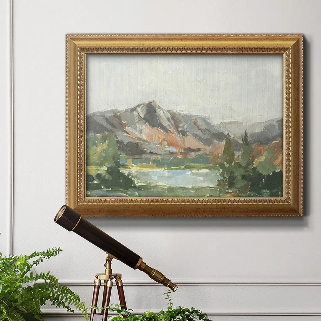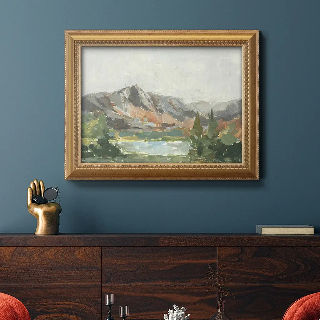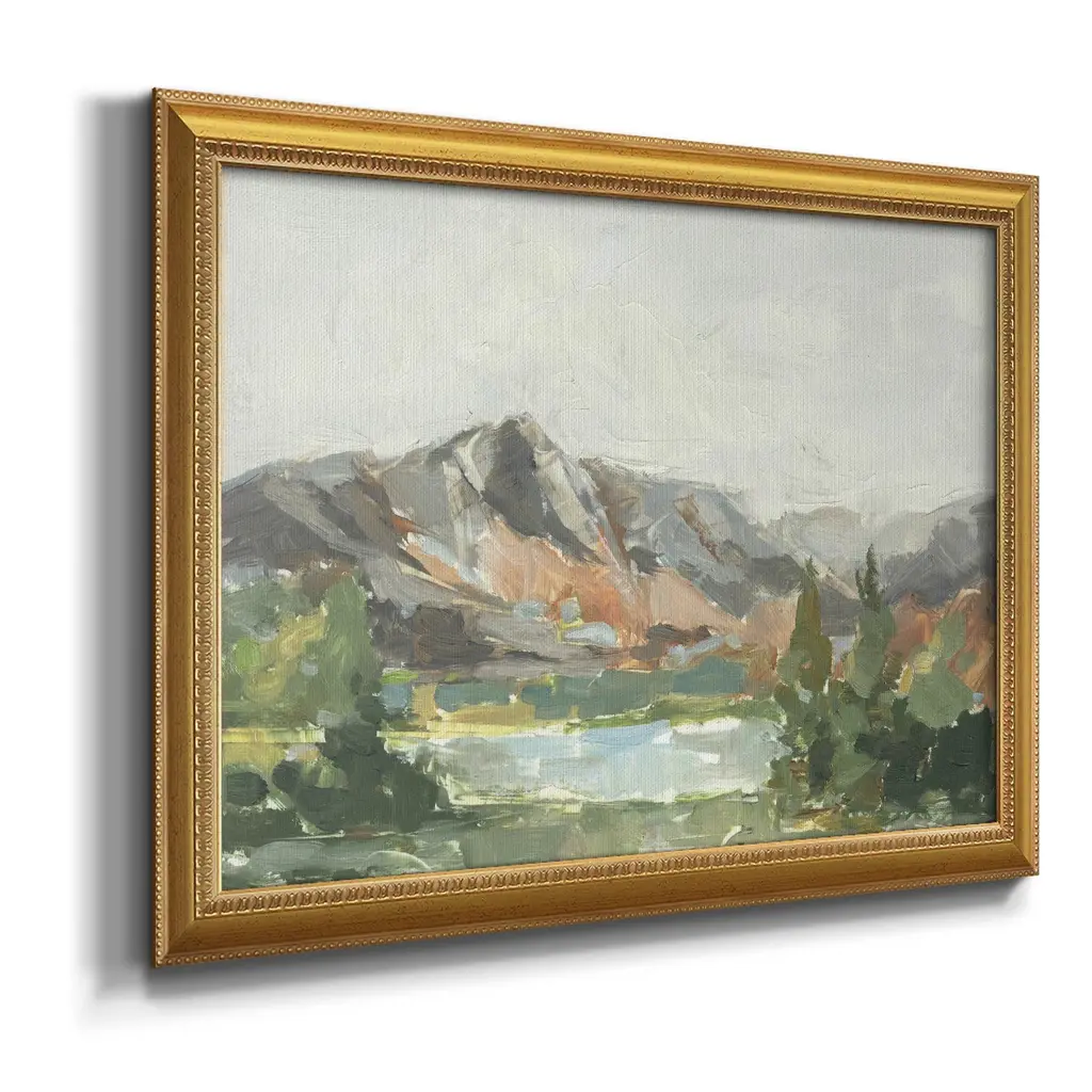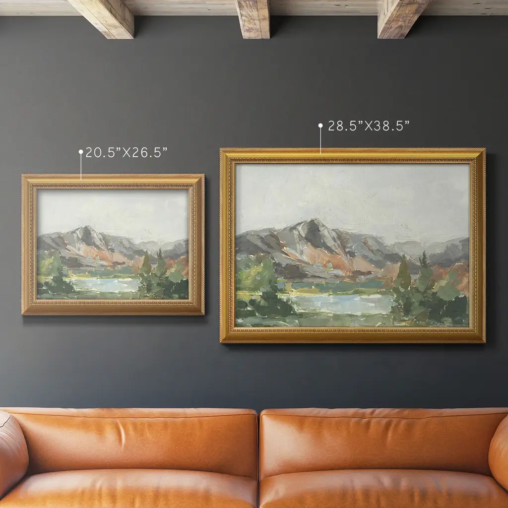 Rusty Mountains I Premium Framed Canvas- Ready to Hang A Premium Framed Canvas created to last. Framed in distressed wood and available in an array of sizes and colors Featuring a beveled a solid wood stretcher bar, each piece comes ready to hand 3 SIZES AVAILABLE 16''X20'' - Overall Size 18'X27'' - Overall Size 24''x36'' - Overall Size Each piece is made to order. Each piece comes with hanging hardware. Made in the USA Ready to Hang Giclee Paper Print Acrylic Glass Beveled Matt Board