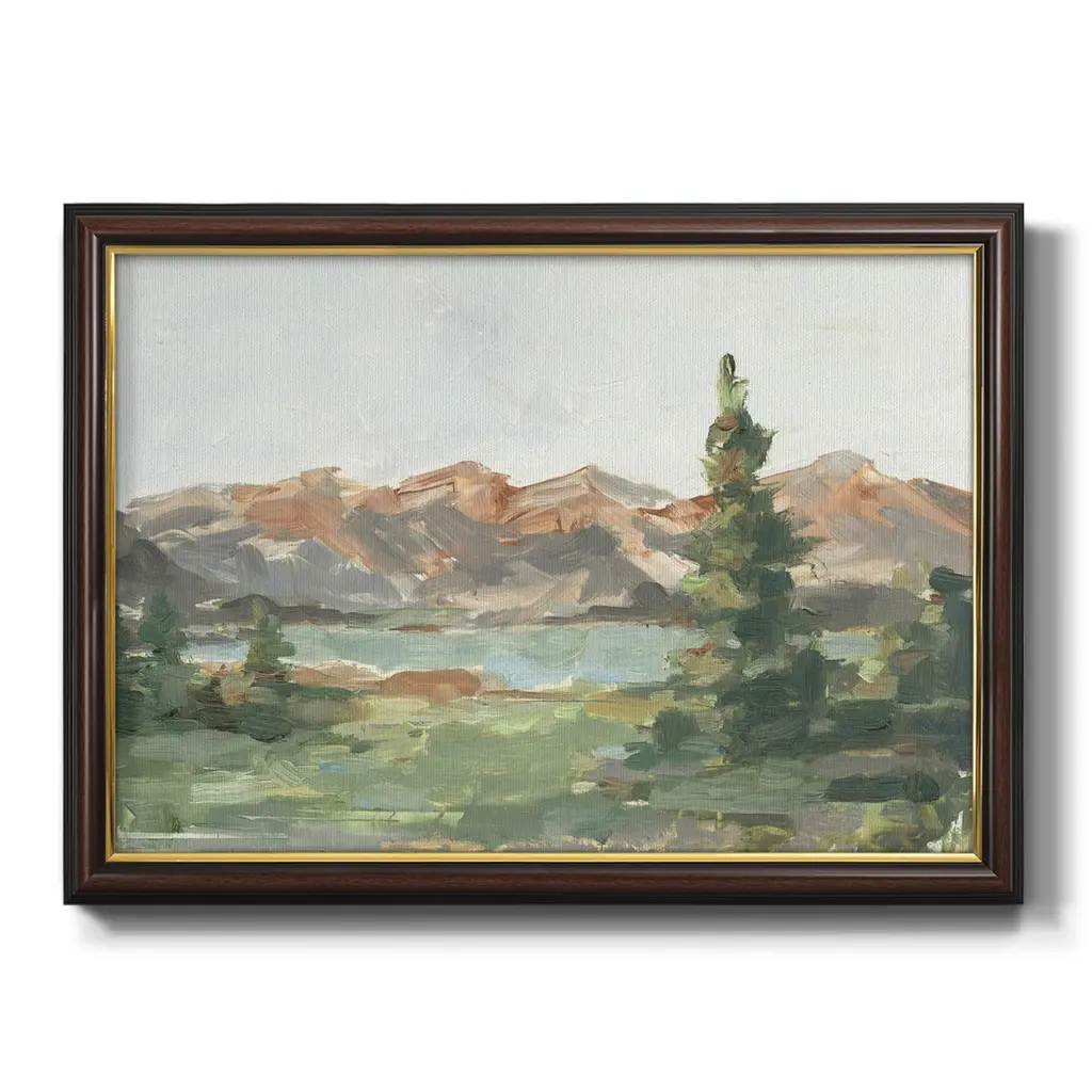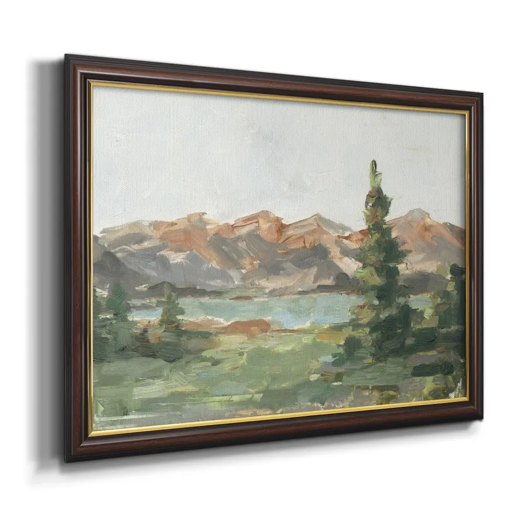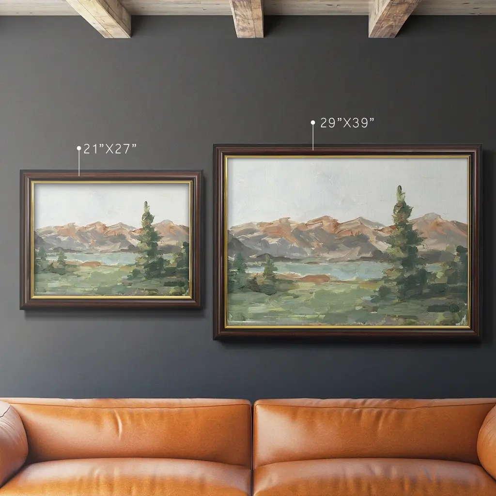 Rusty Mountains II Premium Framed Canvas- Ready to Hang A Premium Framed Canvas created to last. Framed in distressed wood and available in an array of sizes and colors Featuring a beveled a solid wood stretcher bar, each piece comes ready to hand 3 SIZES AVAILABLE 16''X20'' - Overall Size 18'X27'' - Overall Size 24''x36'' - Overall Size Each piece is made to order. Each piece comes with hanging hardware. Made in the USA Ready to Hang Giclee Paper Print Acrylic Glass Beveled Matt Board
