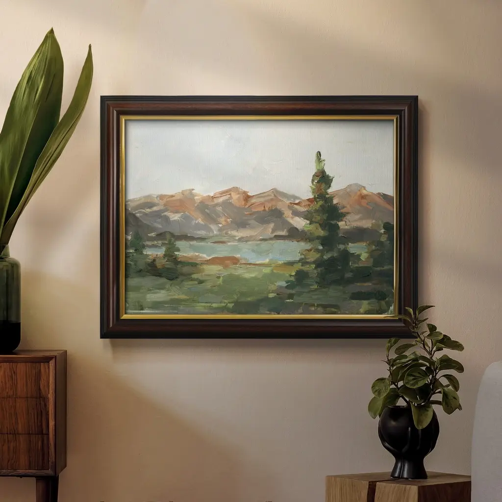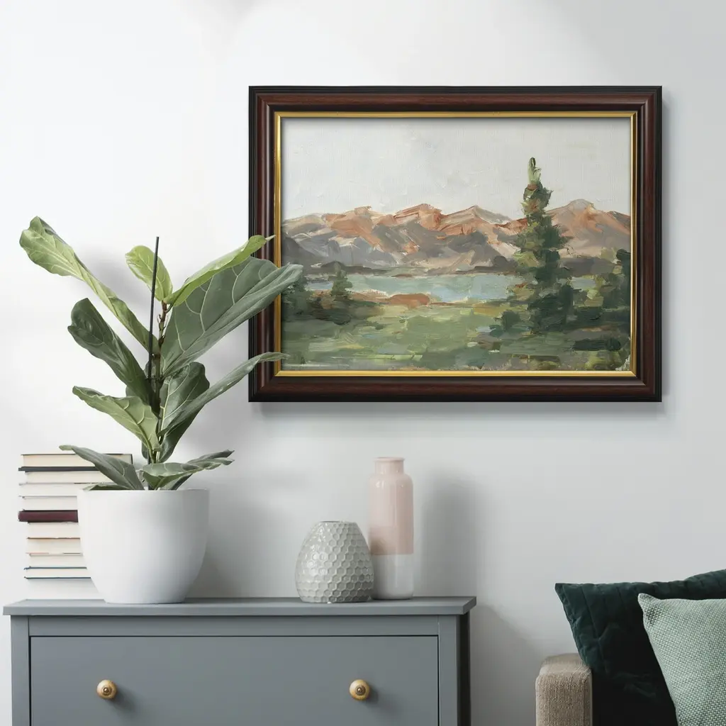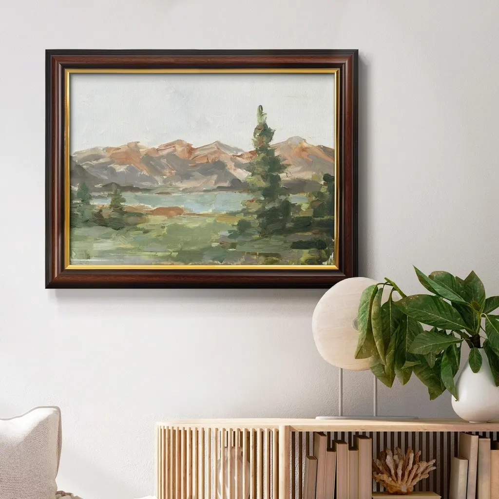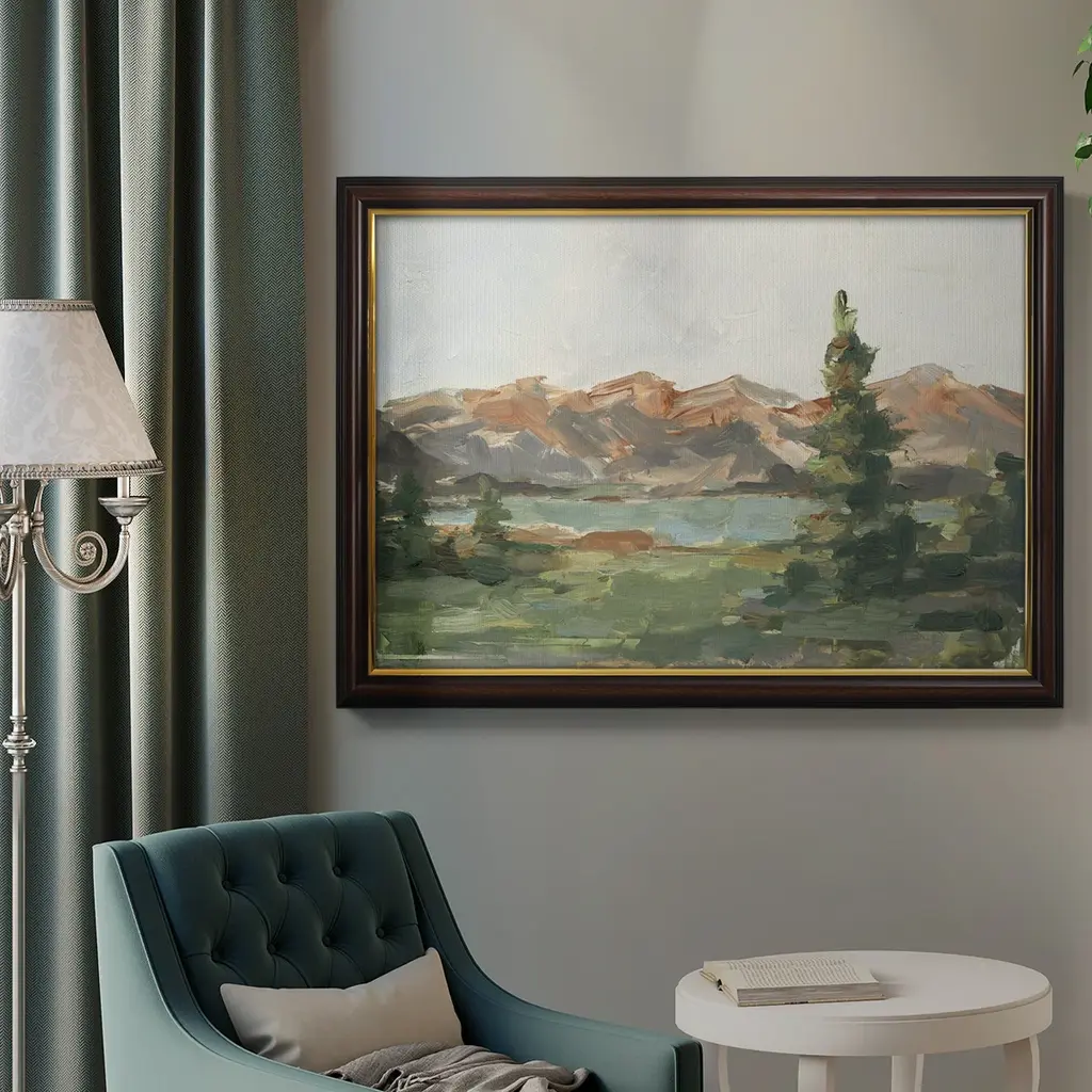 Rusty Mountains II Premium Framed Canvas- Ready to Hang A Premium Framed Canvas created to last. Framed in distressed wood and available in an array of sizes and colors Featuring a beveled a solid wood stretcher bar, each piece comes ready to hand 3 SIZES AVAILABLE 16''X20'' - Overall Size 18'X27'' - Overall Size 24''x36'' - Overall Size Each piece is made to order. Each piece comes with hanging hardware. Made in the USA Ready to Hang Giclee Paper Print Acrylic Glass Beveled Matt Board