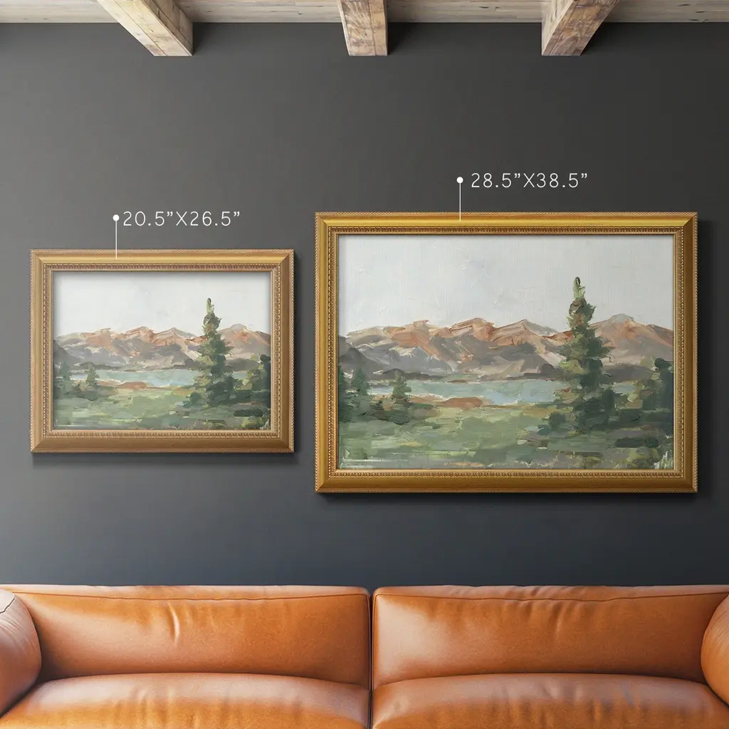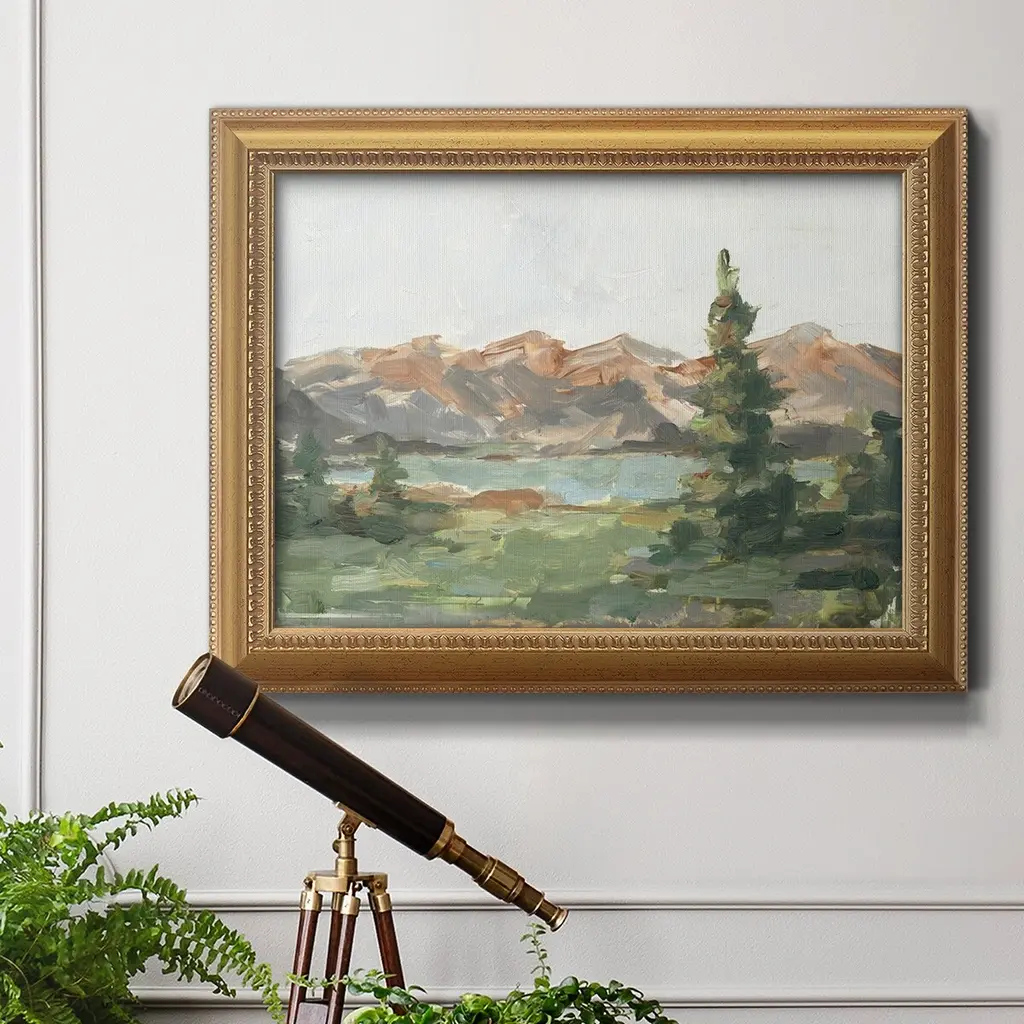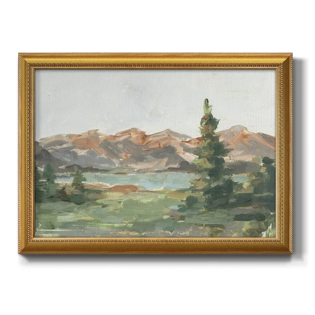 Rusty Mountains II Premium Framed Canvas- Ready to Hang A Premium Framed Canvas created to last. Framed in distressed wood and available in an array of sizes and colors Featuring a beveled a solid wood stretcher bar, each piece comes ready to hand 3 SIZES AVAILABLE 16''X20'' - Overall Size 18'X27'' - Overall Size 24''x36'' - Overall Size Each piece is made to order. Each piece comes with hanging hardware. Made in the USA Ready to Hang Giclee Paper Print Acrylic Glass Beveled Matt Board