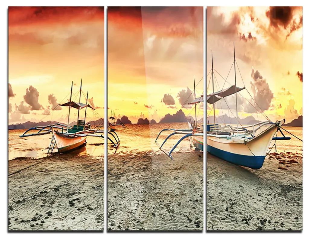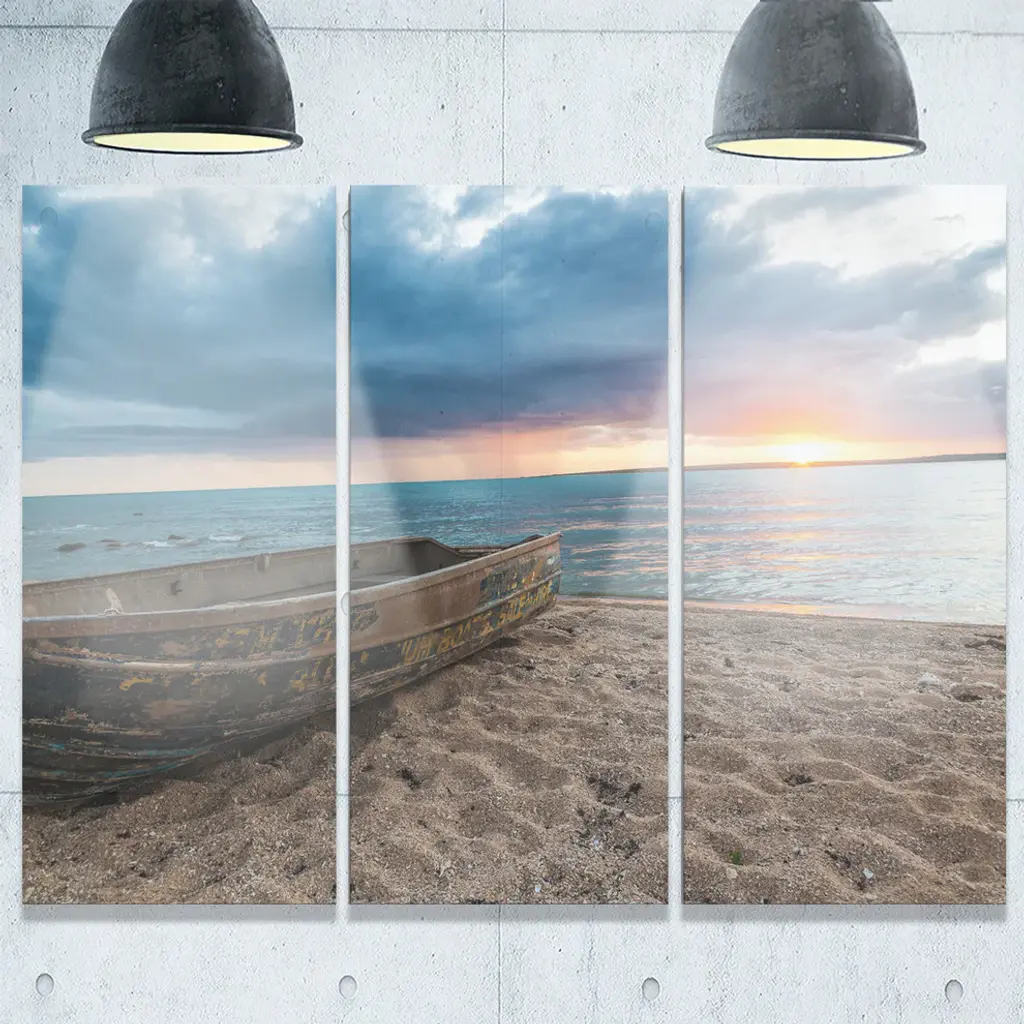 "Rusty Row Boat On Sand At Sunset" Metal Wall Art, 3 Panels, 36"x28"