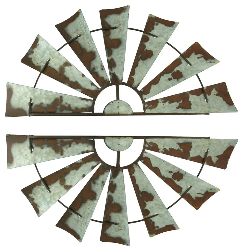 Overall Size - This set boasts an impressive size, with each piece measuring 24 inches long, 12.5 inches high, and 0.25 inches wide. These dimensions ensure they stand out elegantly in any room.Quality Construction - Crafted with creativity and precision, these windmill wall sculptures are made of durable metal. Their unique half windmill design showcases a simple yet elegant metal wire frame, highlighting the artistry in their construction.Weathered Appearance - The distinct charm of these sculptures lies in their distressed silver/grey galvanized finish. Adorned with faux rust marks, they carry the allure of weathered and worn antiques. This detailing adds depth and character to their appearance, making them a standout feature in your decor.Versatile Accents - Designed to enhance various spaces, these sculptures are perfect for hanging above the mantel, headboard, window, door, or artwork. Their versatility allows you to place them in any room, bringing a touch of rustic farmhouse elegance to your home.Home Decor Enhancement - Beyond their aesthetic appeal, these windmill wall sculptures elevate the ambiance of any home setting. They infuse your space with timeless charm, making a statement about your taste for classic and rustic decor. With these sculptures, your home decor achieves a level of sophistication that is both impressive and inviting.Elevate your home decor with this charming set of vintage windmill wall sculptures, infusing your space with rustic farmhouse elegance. These classic farm-inspired art pieces, each measuring 24 inches long and 12.5 inches high, add a bold yet timeless touch to any room. Perfect above fireplaces, headboards, windows, doors, or artwork, these metal windmills become focal points in your home, enhancing your interior style. Crafted with attention to detail, these half-moon windmills feature a rusty galvanized finish, giving them an aged and weathered appearance, adding character to your walls. Their versatility shines as they fit seamlessly into various decor settings. Personalize them with string lights and greenery for a cozy ambiance or let their rustic charm stand alone in low-traffic areas. Embrace the farmhouse flair with these artful pieces, capturing the essence of classic farm landmarks. Whether placed in the kitchen, living room, or any other space, they create a captivating visual impact, embodying the spirit of the countryside. Upgrade your home with these timeless sculptures, bringing a touch of the farm''s grace and warmth to your walls.