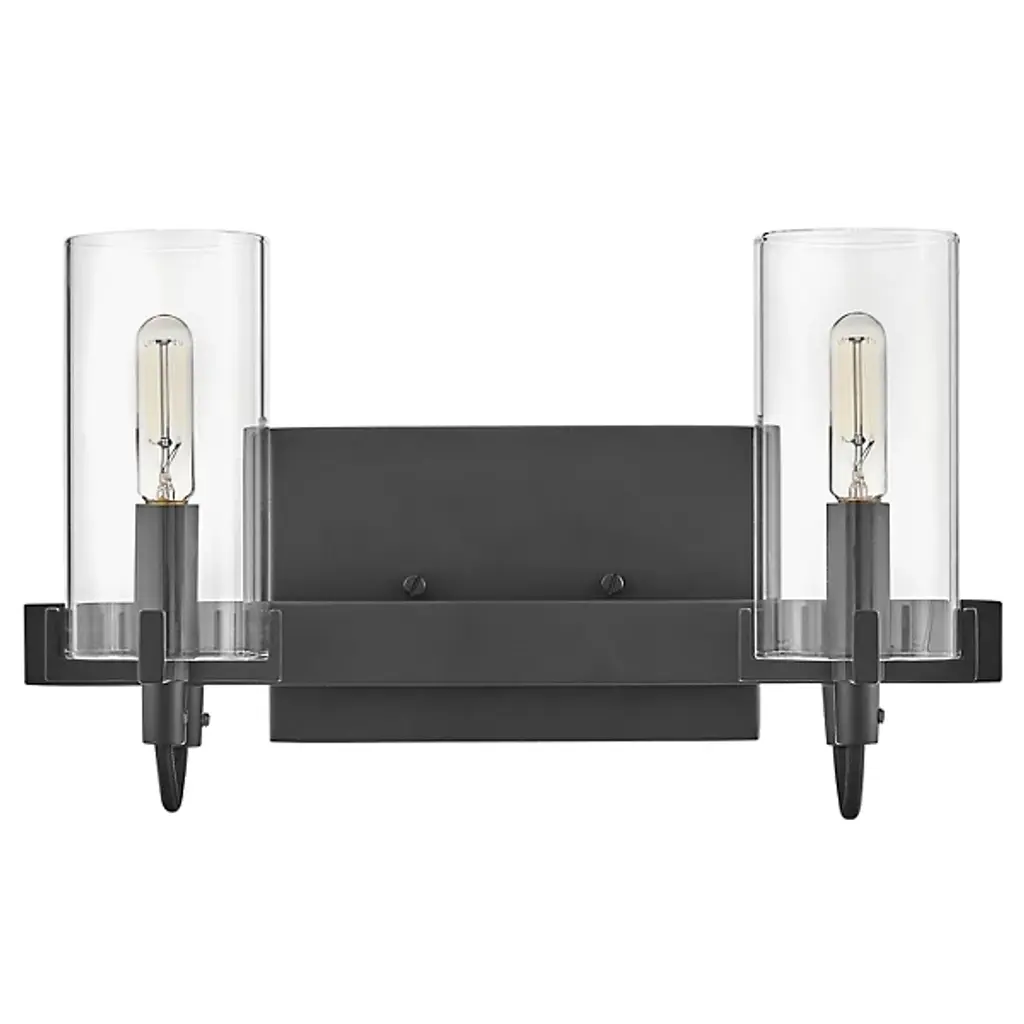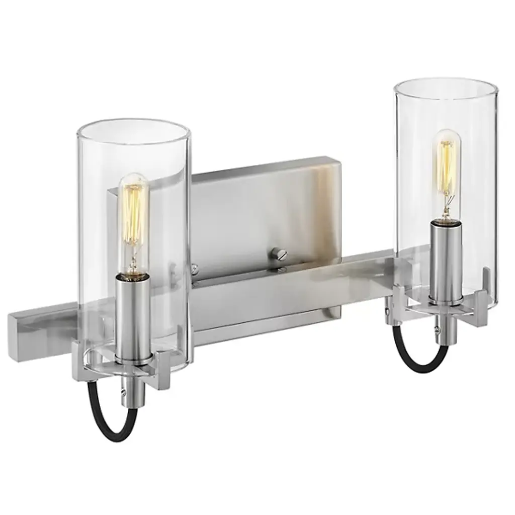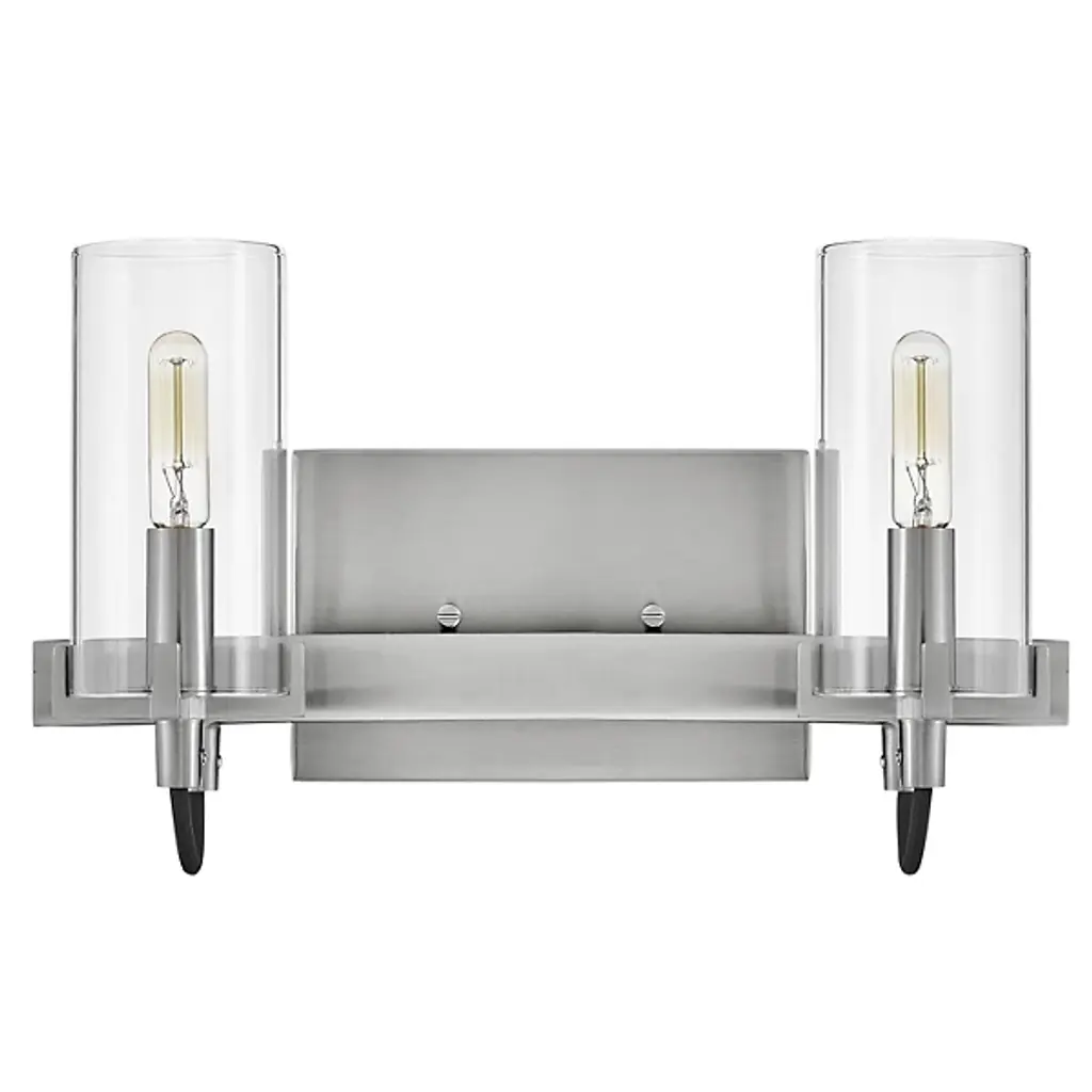The Ryden Vanity Light from Hinkley Lighting is a versatile stunner, making efficient use of space with gorgeous geometry. The piece’s steel hardware proves solid and suitable for damp locations. A low-profile backplate mounts this piece securely with the glass facing up. Angular brackets in front produce a fabric cord that’s attractive in contrast. Clear glass shades surround the bulbs for an airy display. The bulbs come together to create an easy-going glow.