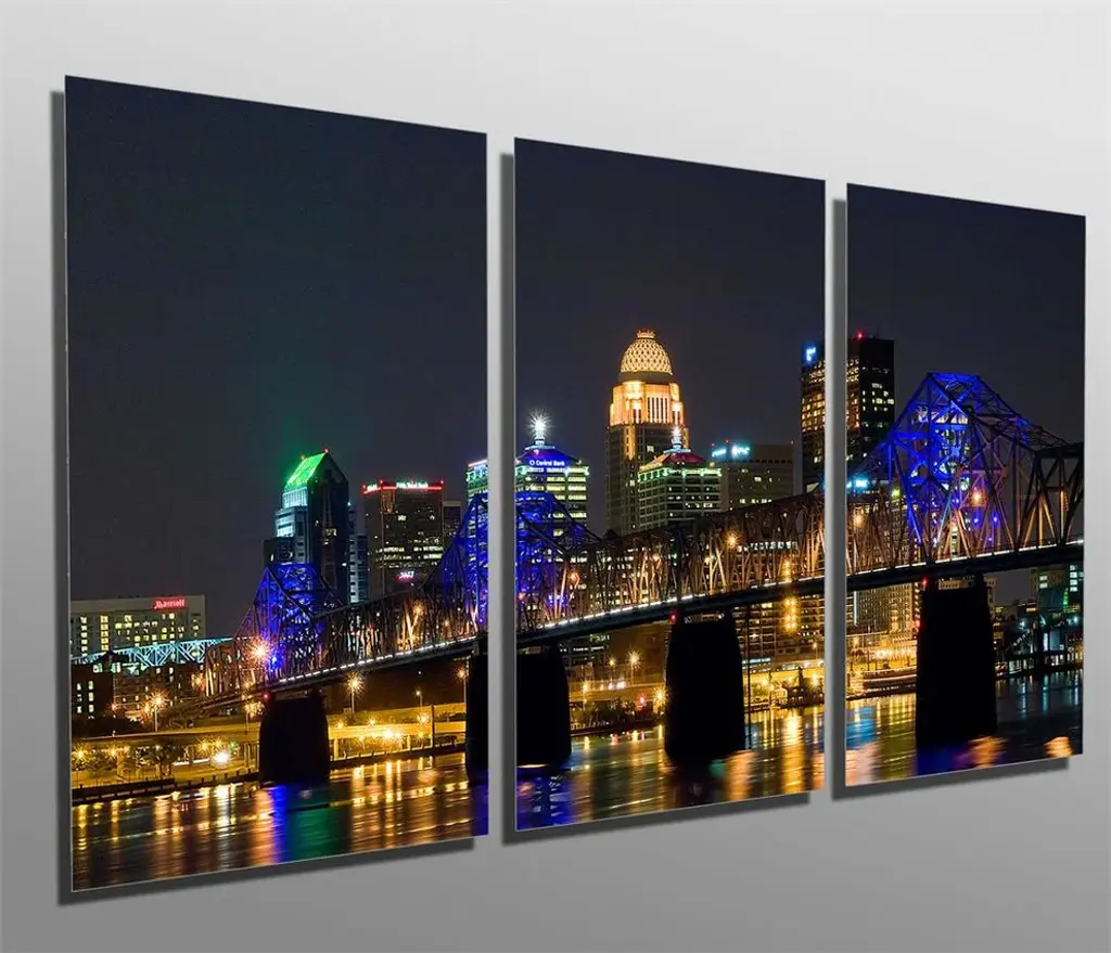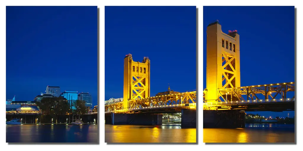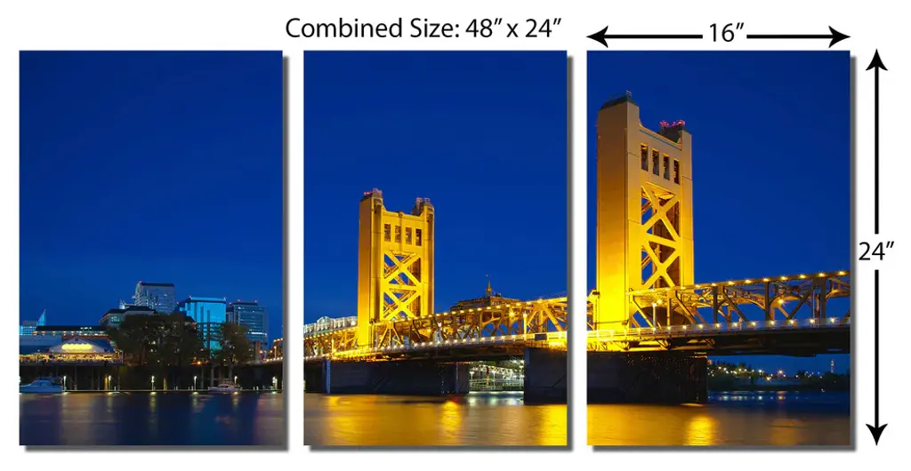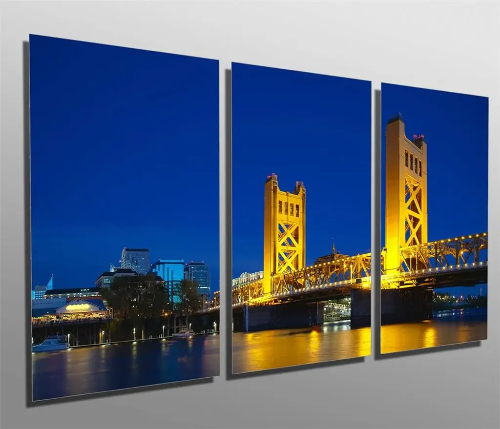 48"œ x 24"œ total size. Ready To Hang! (3 pieces - 16"œ x 24"œ each). 3 Panel Split (Triptych) Metal Print of Sacramento Golden Gate drawbridge at night. Modern metal wall art for home or office wall decor & interior design. Printed on Luxurious, HD aluminum glossy metal panels. Multi panel art.. HD aluminum panels. Metal print wall art. Includes Shadow Wall Mount on the back.• Aluminum Metal Wall Art• Made in USA• Ready to hang - No assembly required• Shadow mount hardware on the back• 0.045"œ thick HD Aluminum Panels• Scratch resistant, glossy finish• Superb color clarity, luxurious prints• Epson printing process• For indoor or moisture rich environment use• Easy to clean. Gently wipe with microfiber cloth.
