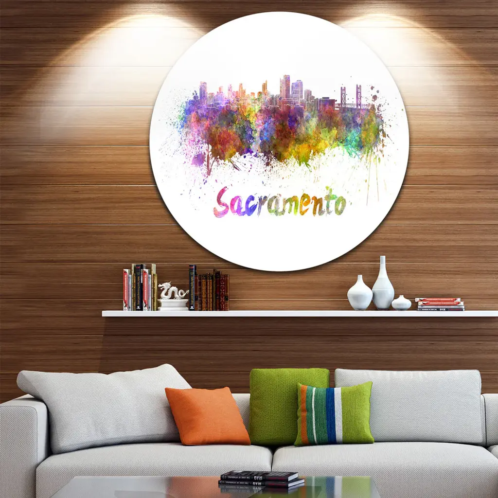 Bring Contemporary Abstraction to your home with this large Circle Metal wall art. This Sacramento Skyline Metal Artwork makes it the focal point of any room or office. - White Gloss Coating ensures colors are extra vibrant with light reflection.- Aluminum grade Sheet Metal with 1 inch mounting frame on the back giving the illusion that the artwork is floating on the wall..- Mounting Brackets are included along with instructions.- High Quality Digital images are created directly into a glossy aluminum panel producing a stunning and captivating print into the glossy finish of the metal.- Water, Fire and Scratch resistant HD Aluminum panels.- Looks better than any photo paper and guaranteed to last at least 20 years- Easy to clean with a microfiber cloth. Colors are far superior to regular Canvas Art. - Easy to Hang