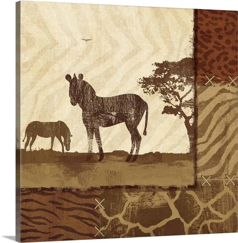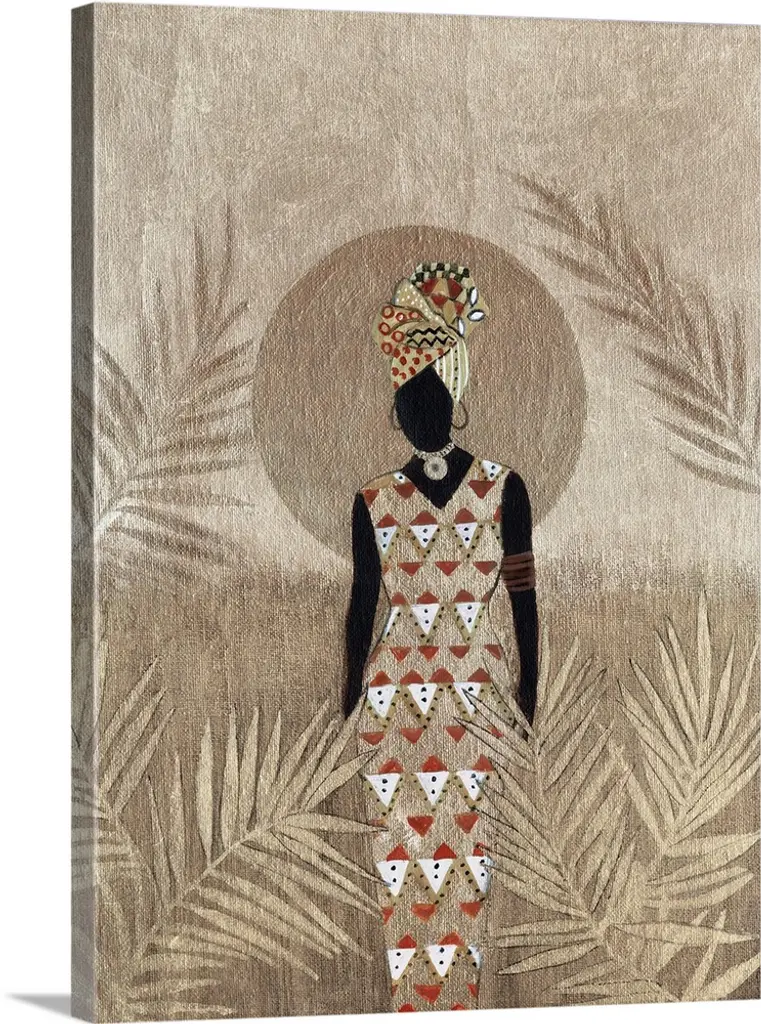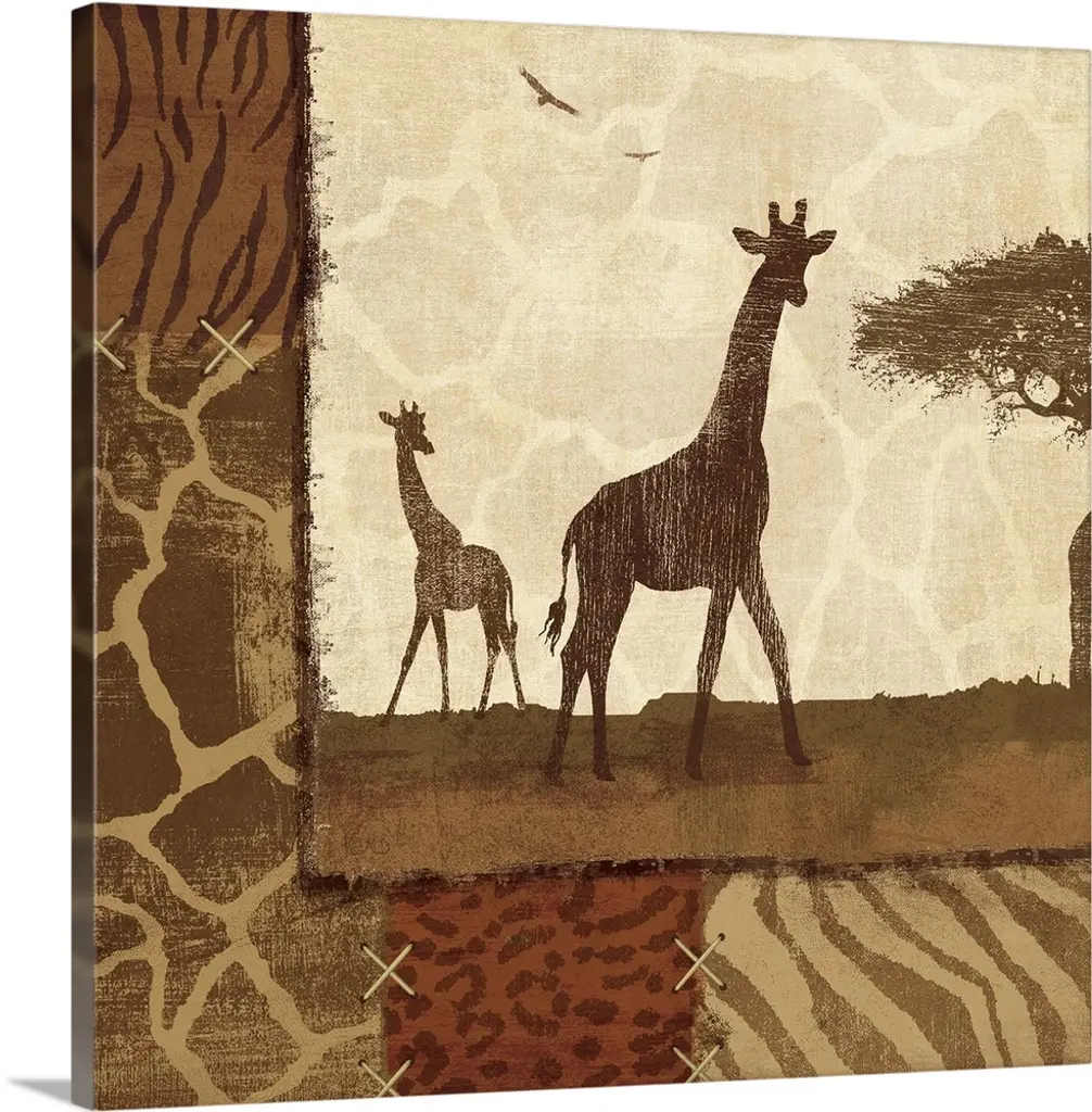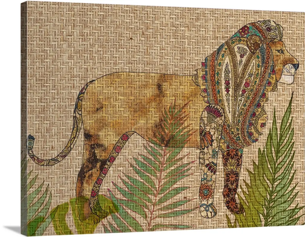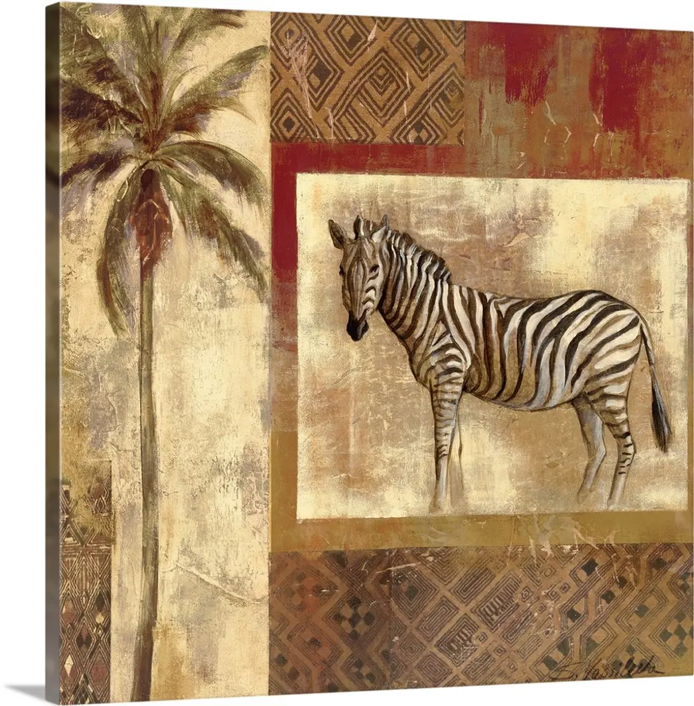 This artwork has a patch style background with a large elephant painted facing toward tall palm trees that line the right side of the piece.