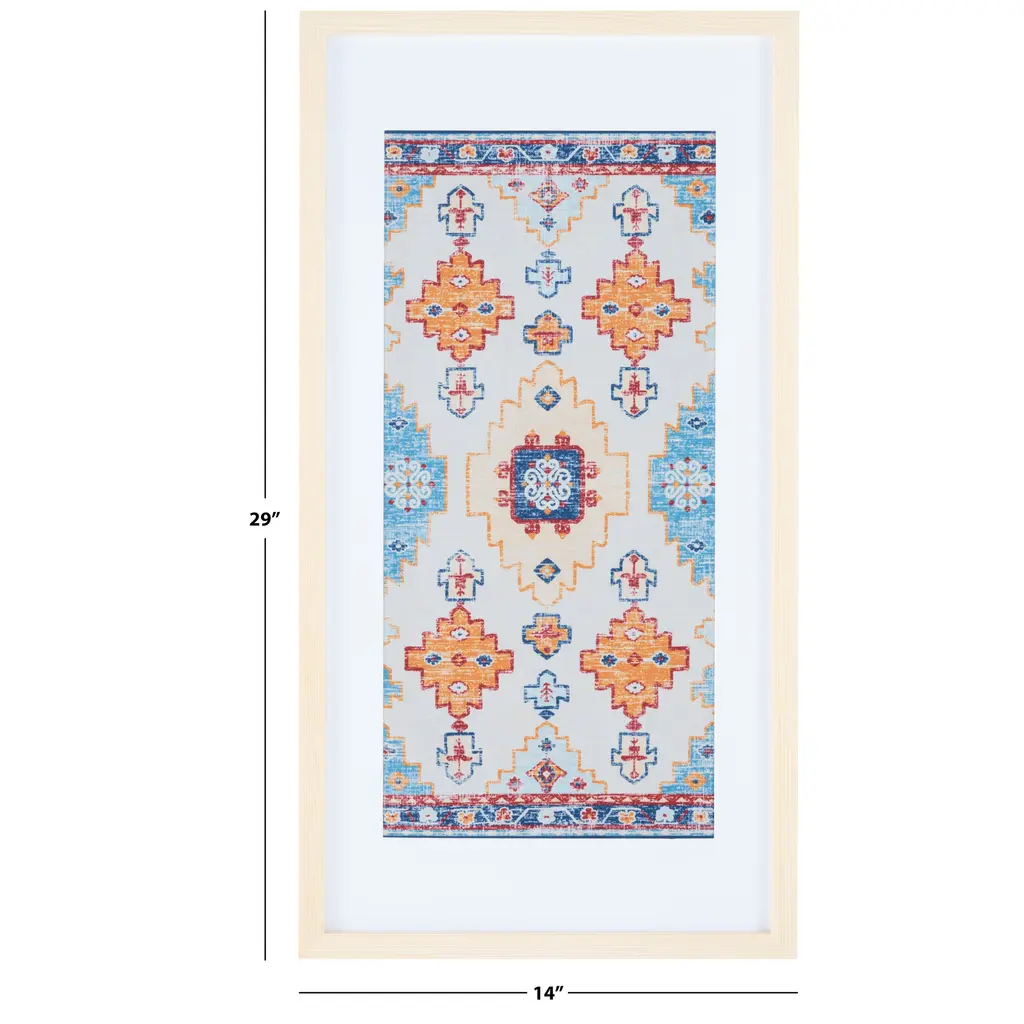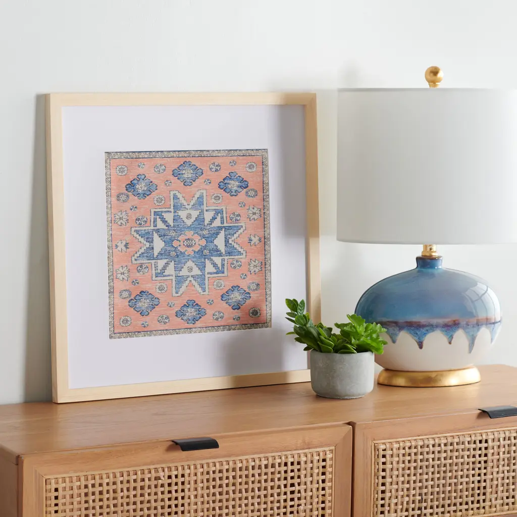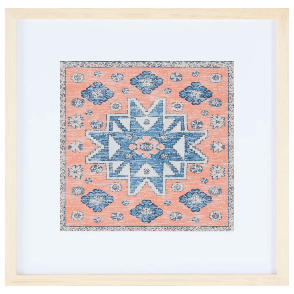 Give a lively update to your home with the chic design and lush textures for our Harjo framed textile wall art. Its abstract and fascinating motifs are accentuated with a strong sense of symmetry. Showcasing a soothing combo of blue and terracotta hues, the wall art lends a lively pop of color and motifs. It is elegantly encased in a wooden frame to serve as an artful focal point for your gallery wall.